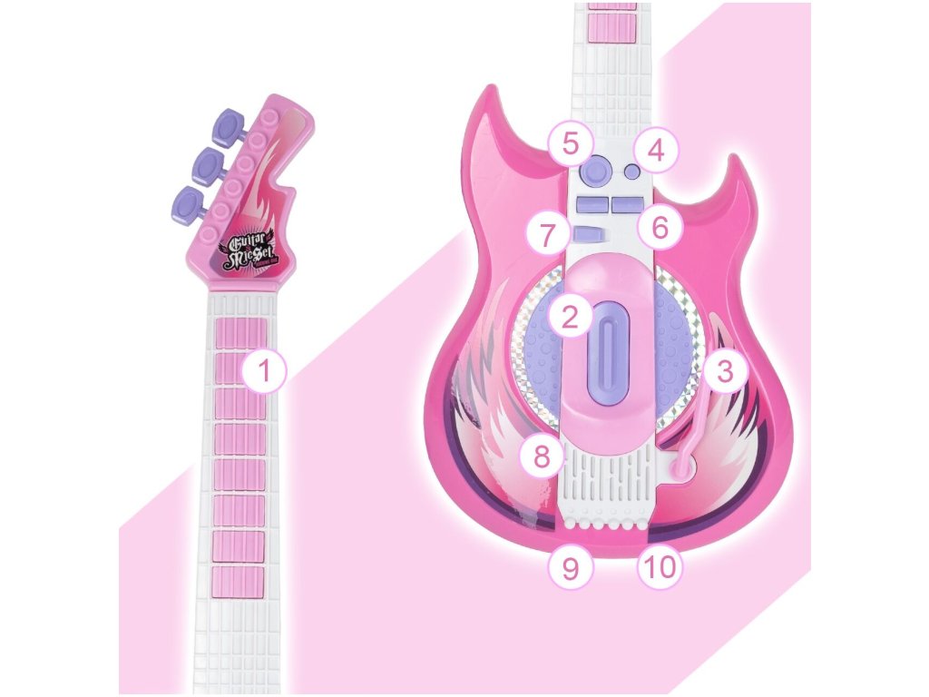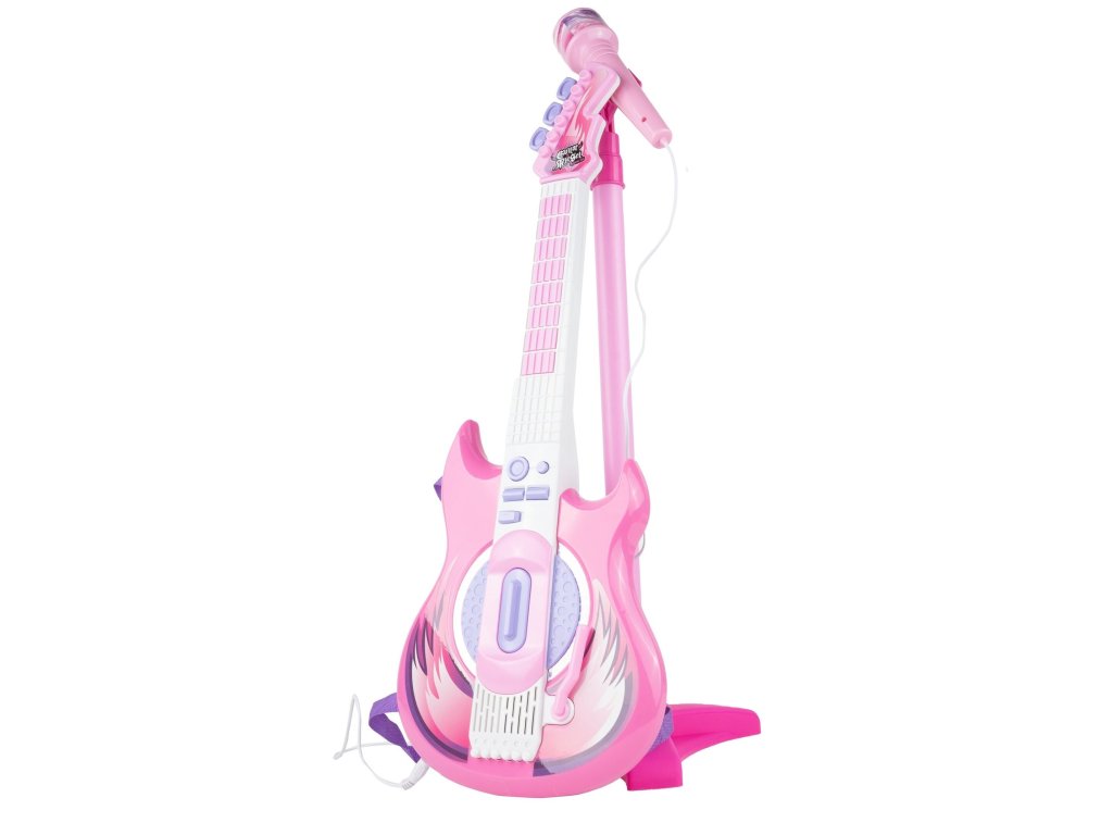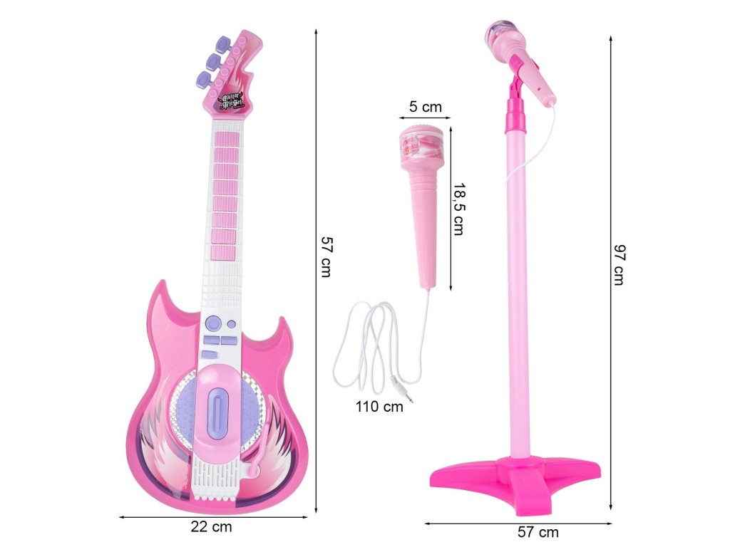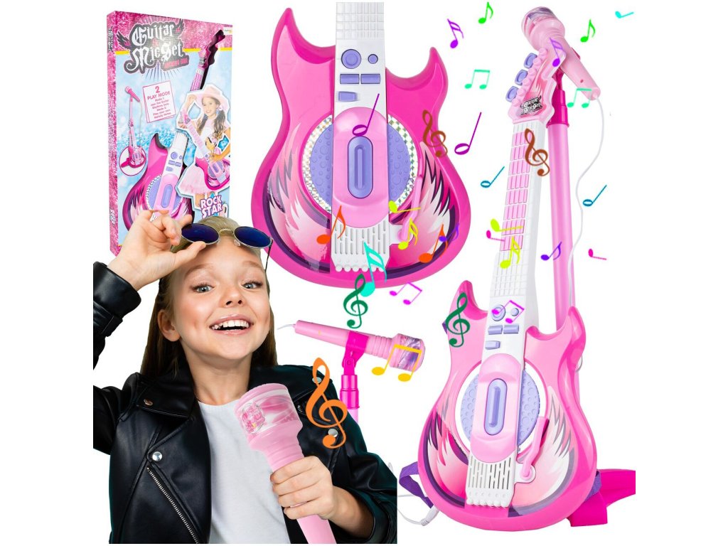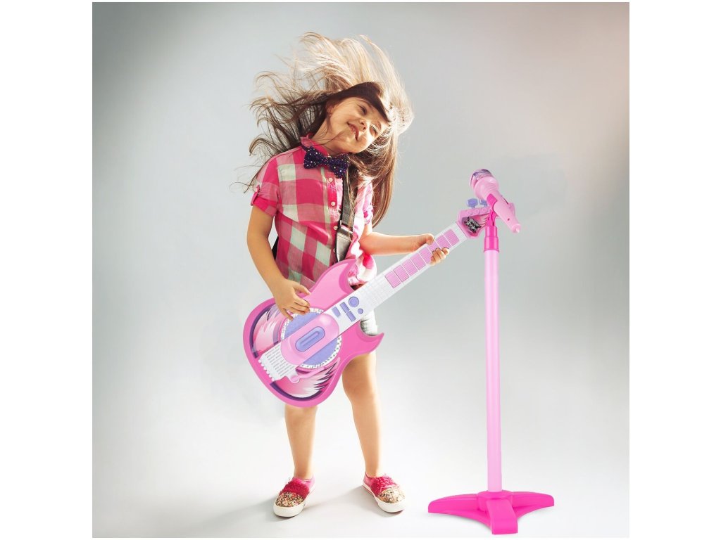 Tato růžová elektrická kytara je ideálním nástrojem pro malé hudební nadšence. S osmi tlačítky na hmatníku může dítě snadno skládat melodie pouhými pohyby prstů. Každé stisknutí tlačítka generuje unikátní kytarové sólo nebo jednotlivý tón, což z ní činí skvělý nástroj pro objevování hudby. Kytara je vybavena dlouhým spínačem u zvukového otvoru, který umožňuje dětem vytvářet různé zvuky kytary jednoduchým pohybem nahoru a dolů. Speciální páka pak přidává rockové efekty, čímž se rozšiřuje možnosti pro kreativitu malých hudebníků. Pro doplnění zábavy můžete kytaru připojit k chytrému telefonu, což umožní dětem hrát a zpívat podle svých oblíbených skladeb s vokály na pozadí. To nejenže pomáhá překonat trému, ale také podporuje jejich hudební rozvoj a fantazii. Stojan na mikrofon je nastavitelný podle výšky dítěte, což zajišťuje pohodlné používání bez ohledu na jejich velikost. Kytara disponuje třístupňovým ovládáním hlasitosti a samostatnými vstupy pro mikrofon a smartphone, což umožňuje flexibilní použití a snadnou integraci s dalším hudebním vybavením. S napájením pomocí baterií je kytara ideální pro cesty k babičce, do školky nebo na narozeninové oslavy, kde děti mohou svou hudbu předvádět bez omezení přístupu k elektrické síti. Tato kytara s mikrofonem je skvělým zdrojem zábavy a inspirace pro nejmenší hudební nadšence.