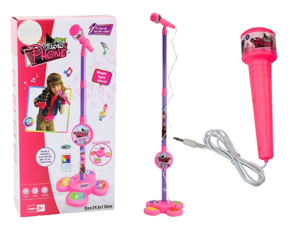 Dětský mikrofon se světelnými efekty a přehráváním přemění Vaše dítě ve skutečnou zpěvačku nebo zpěváka. Je vybavený světýlky ve soddní části stojanu. Lze ho připojit na MP3 přehrávač nebo telefon dítě si tak může pouštět své oblíbené písničky a podklady. Stojan má výšku 100 cm. Hračka je vyrobená z plastu a určena pro děti od 3 let.