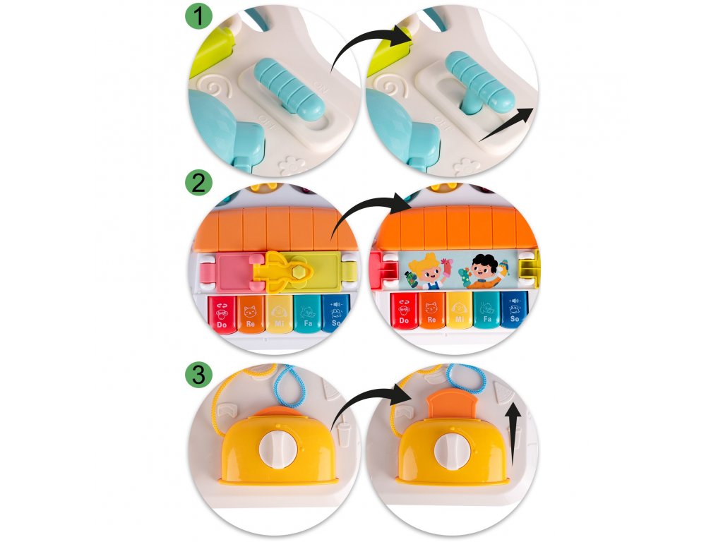 Dětský multifunkční stoleček 2v1 Game Table určen pro ty nejmenší děti. Po vyjmutí nohou stolu může dítě hrát s panelem samotným nebo ho můžete zavěsit na dětskou postýlku. Hrací deska je pokryta příjemnými barvami. Tvary stolečku jsou velmi jednoduché a zaoblené pro maximální bezpečnost dítěte. Děti se díky všem smyslům seznamují s okolním světem, a proto je důležité neustále upoutávat jejich pozornost správným a příjemným způsobem - nejlépe veselou hrou. Barevný stolek zaujme zvukovými a barevnými efekty každé dítě. Stoleček má dvoustupňovou kontrolu hlasitosti, díky níž může být hračka zcela zticha, což bude užitečné během večerní hry. Velkou výhodou stolu je kombinace všech aktivit se zvukovými a světelnými efekty, které zajímají a povzbuzují všechny děti k hraní. Tento stolek bude perfektní jak pro chlapce, tak pro dívku - hračky, které lze přesunout, jistě zaujmou každé dítě.