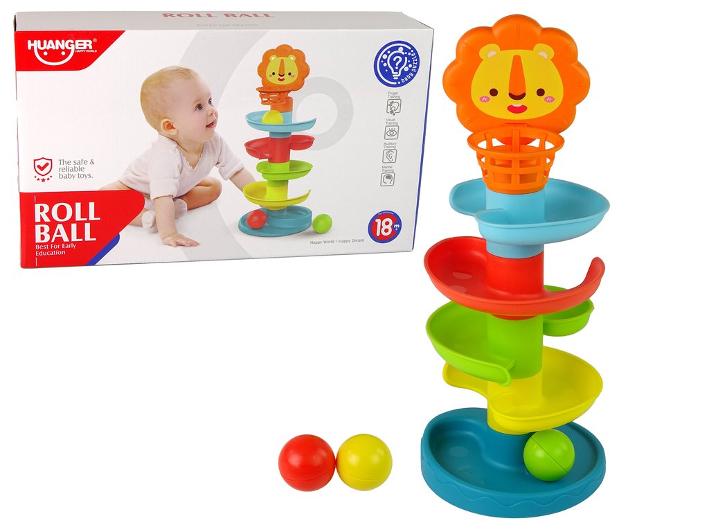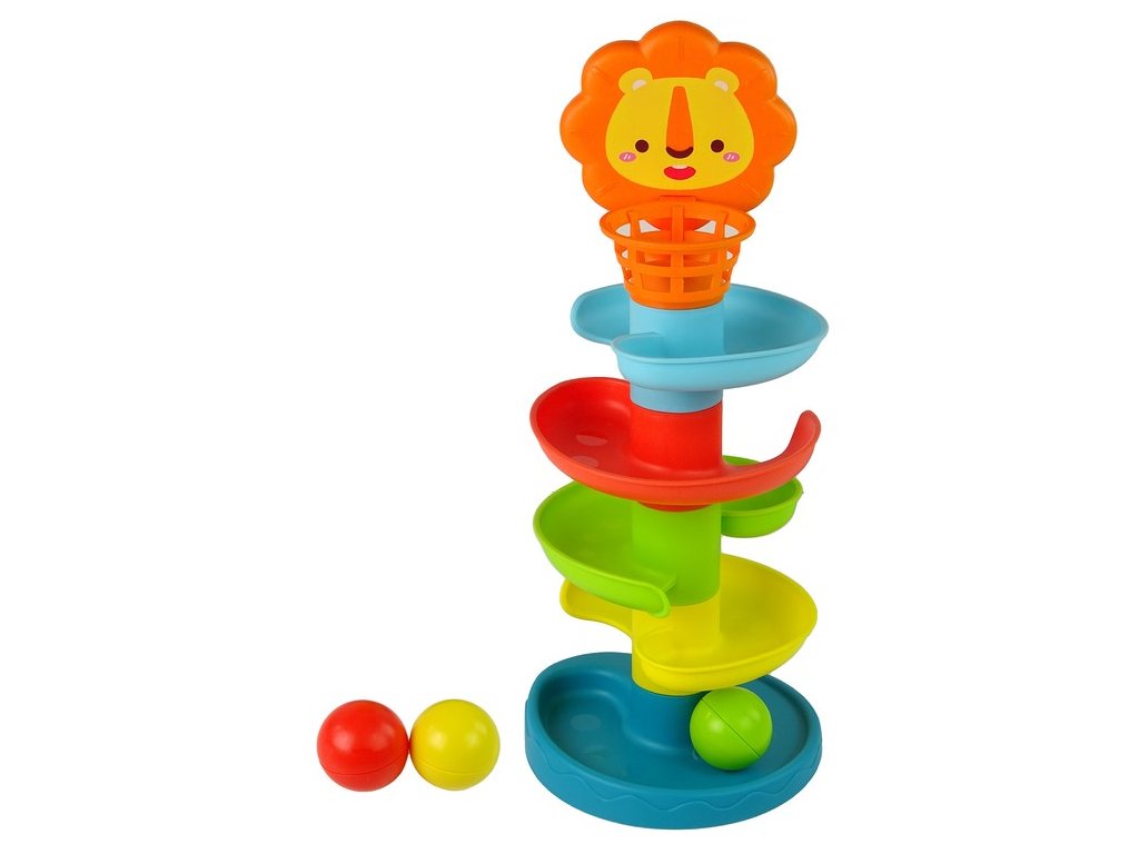 Naučná hračka ve tvaru skluzavky s 5 patry. V horní části je umístěna hlava lvíčka a malý košíček. Míčky mají uvnitř chrastící prvky. Hračka tak rozvíjí zrak dítěte a zároveň mu pomáhá stimulovat sluch. Barevné míčky slouží k trénování dovednosti chytání stejně tak rozvoji koordinace a svalové síly. Všechny prvky hračky jsou vyrobeny z certifikovaného a atestovaného plastu. Určeno pro děti od 18 měsíců věku.