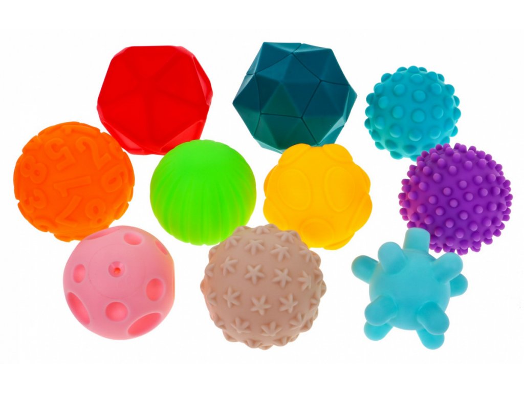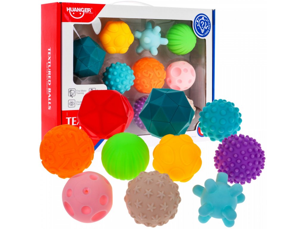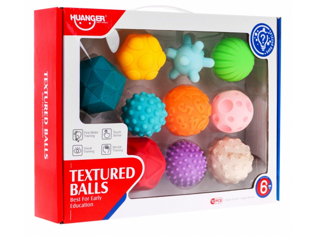 Haunger sada měkkých senzorických míčků Textured Balls je určena pro ty nejmenší děti. Stimuluje u nich představivost, mysl, zrak a sluch. Zmáčknutím se ozve zvuk a navíc tímto dítě posiluje ruce. V sadě najdete celkem 10 míčků v různých barvách, tvarech a velikostech vyrobených ze zcela bezpečného materiálu. Hračka je určena pro děti od 6 měsíců věku.