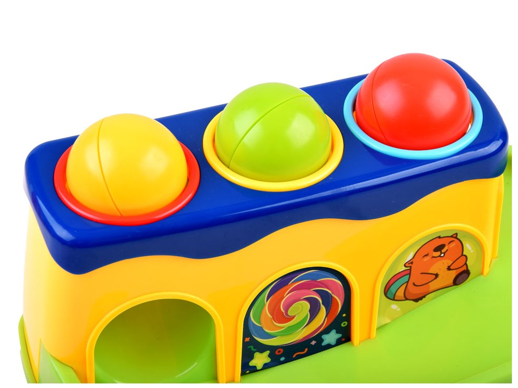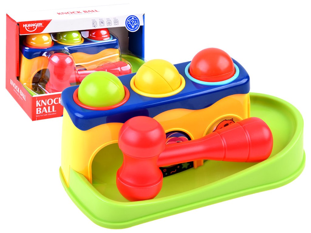 Haunger zatloukání míčků Knock Ball je určena pro ty nejmenší děti. Stimuluje u nich hmat, koordinaci, představivost a učí je rozpoznávat barvy. Pomocí přiloženého kladívko se míčky vtloukají do horních otvorů a po úspěšném zatlučení míčky sjedou po dráze dolů. Hračka je určena pro děti od 12 měsíců věku.