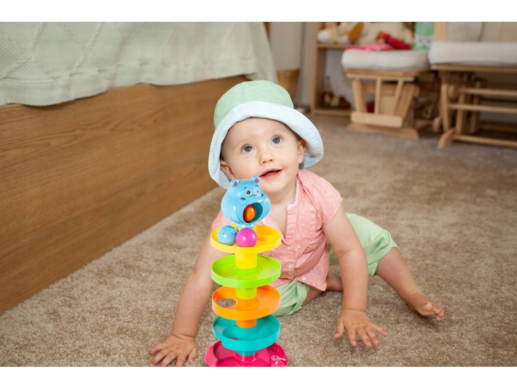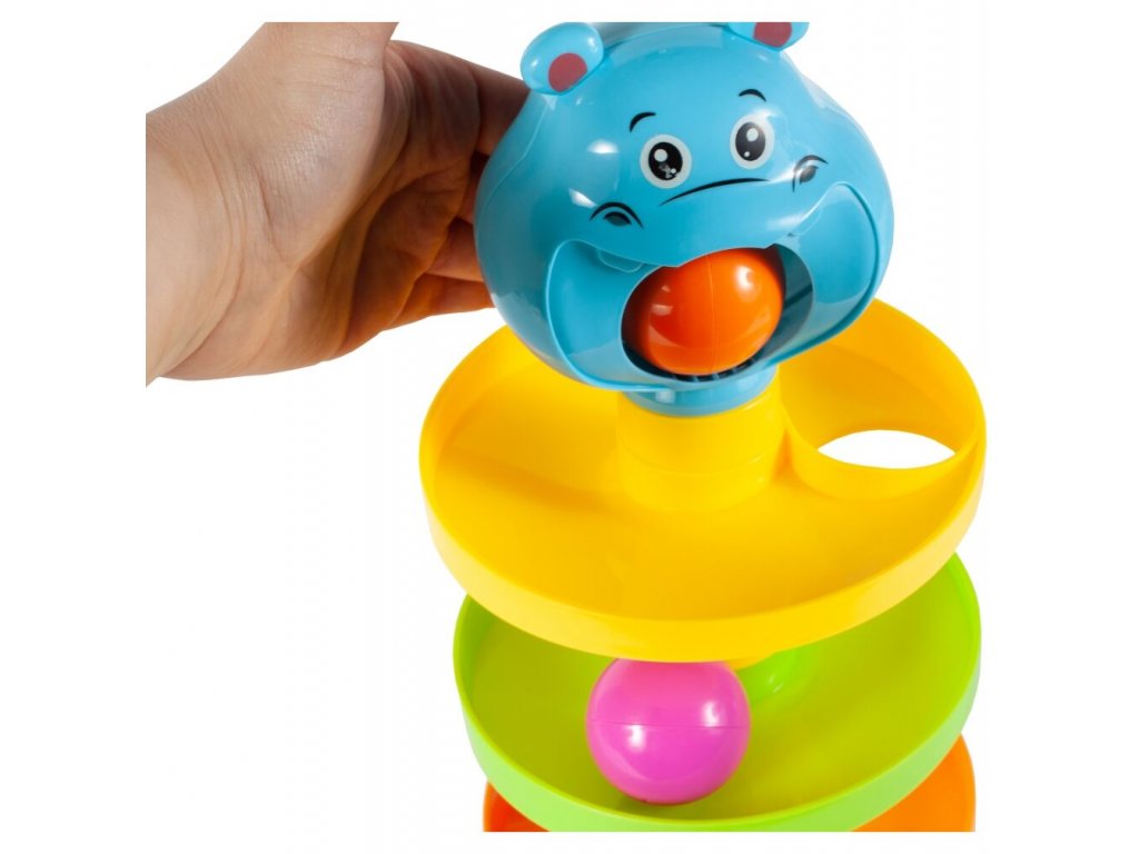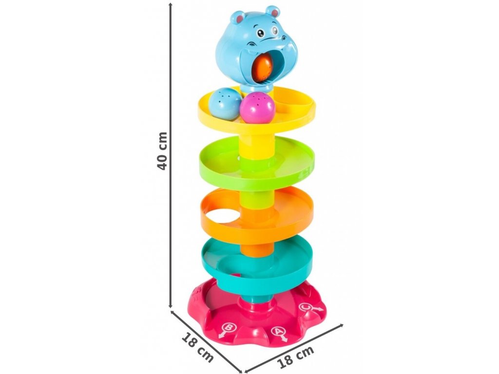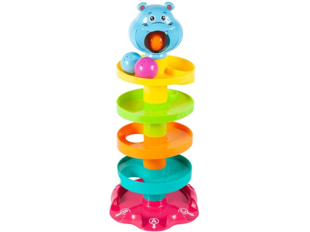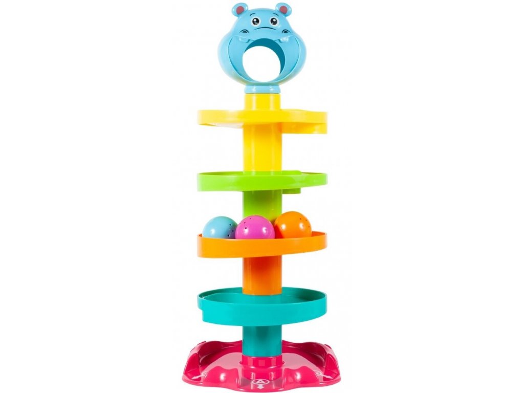 Naučná hračka ve tvaru skluzavky s 5 patry. V horní části je umístěna hlava hrošíka a malý prohazovací košíček. Hračka tak rozvíjí zrak dítěte a zároveň mu pomáhá stimulovat sluch. Barevné míčky slouží k trénování dovednosti chytání stejně tak rozvoji koordinace a svalové síly. Všechny prvky hračky jsou vyrobeny z certifikovaného a atestovaného plastu. Určeno pro děti od 18 měsíců věku.