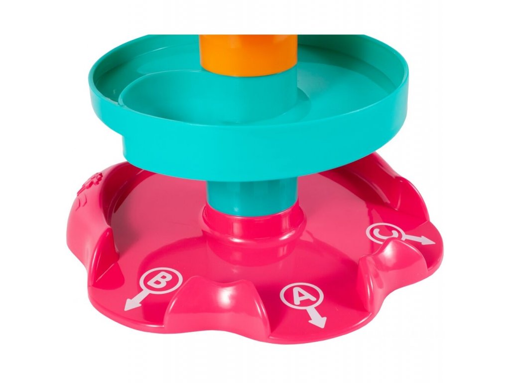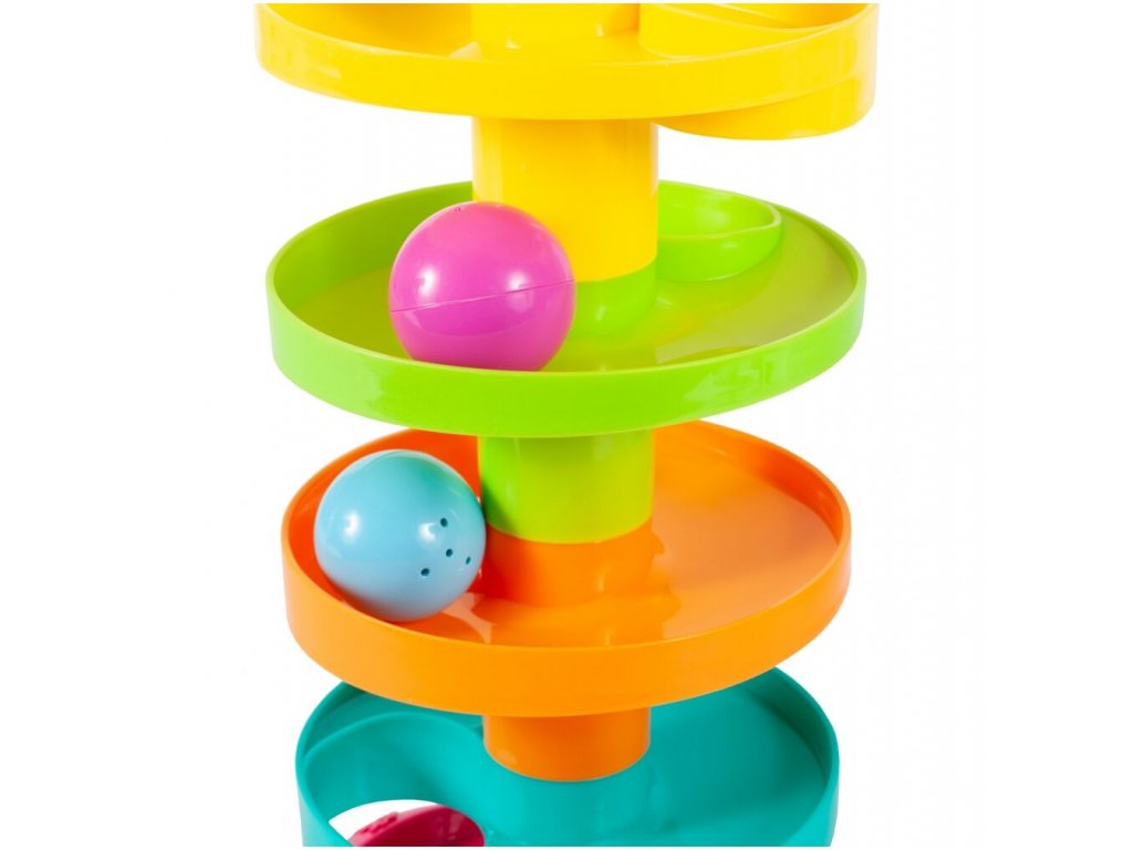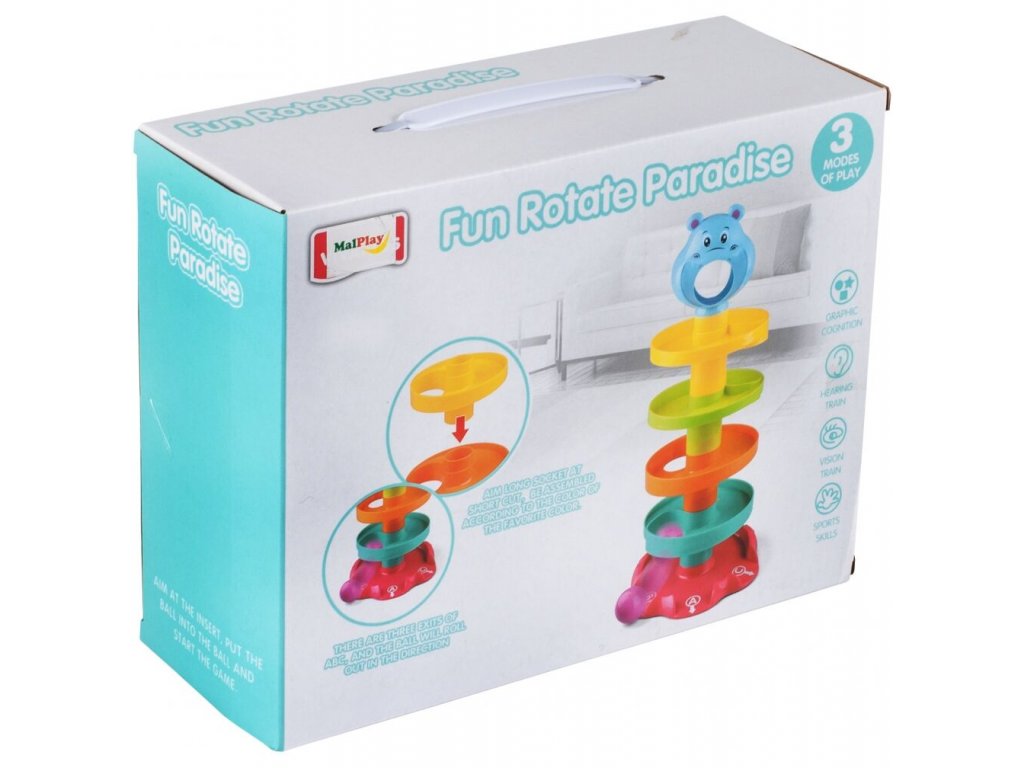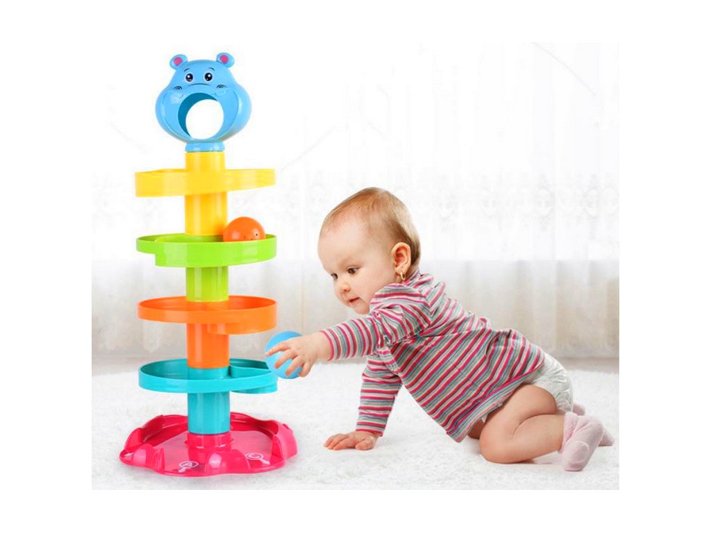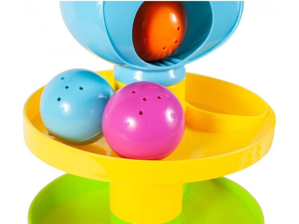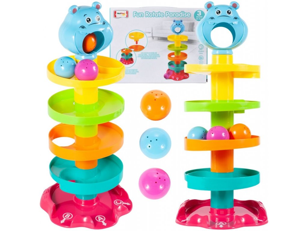 Naučná hračka ve tvaru skluzavky s 5 patry. V horní části je umístěna hlava hrošíka a malý prohazovací košíček. Hračka tak rozvíjí zrak dítěte a zároveň mu pomáhá stimulovat sluch. Barevné míčky slouží k trénování dovednosti chytání stejně tak rozvoji koordinace a svalové síly. Všechny prvky hračky jsou vyrobeny z certifikovaného a atestovaného plastu. Určeno pro děti od 18 měsíců věku.
