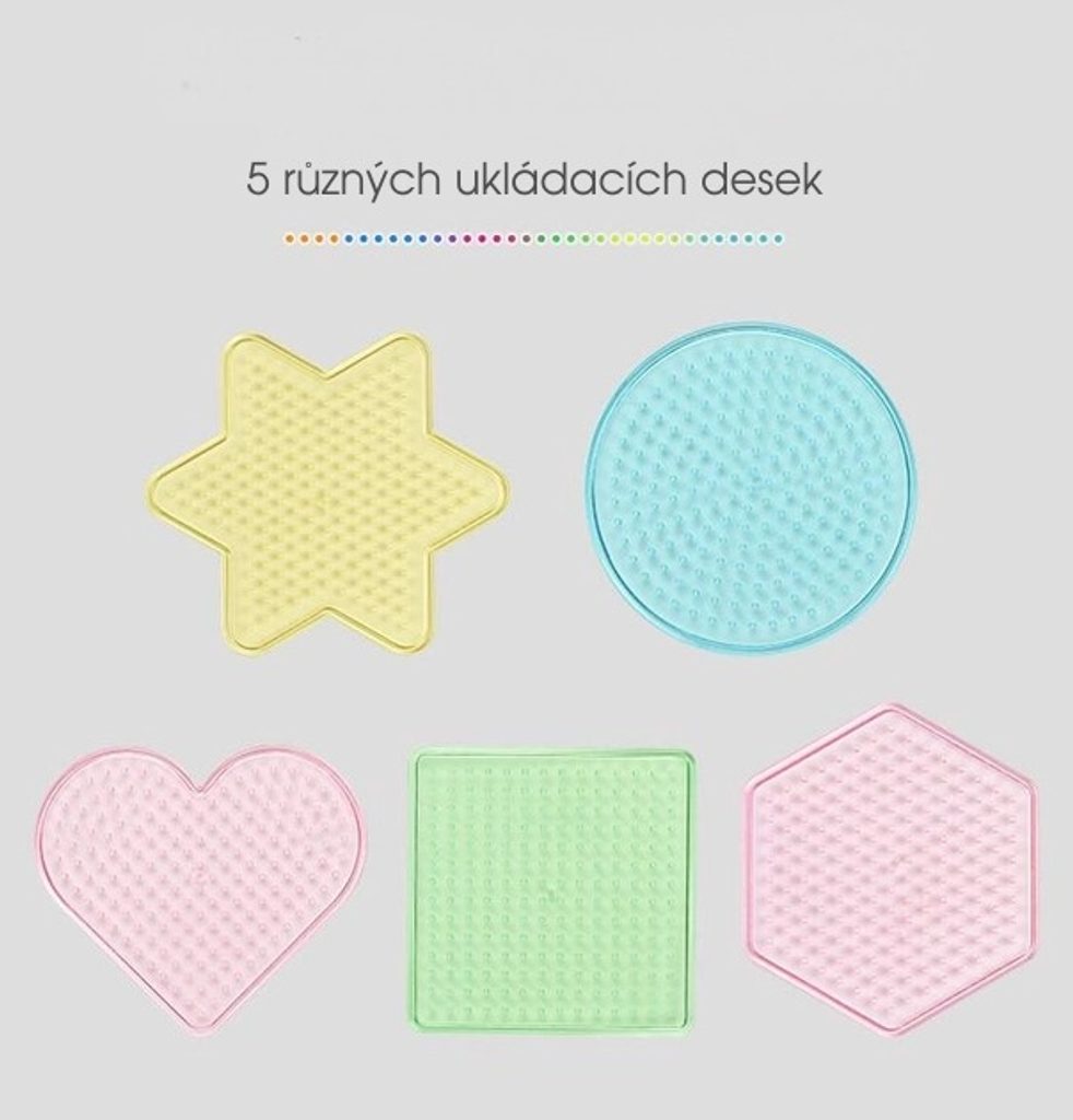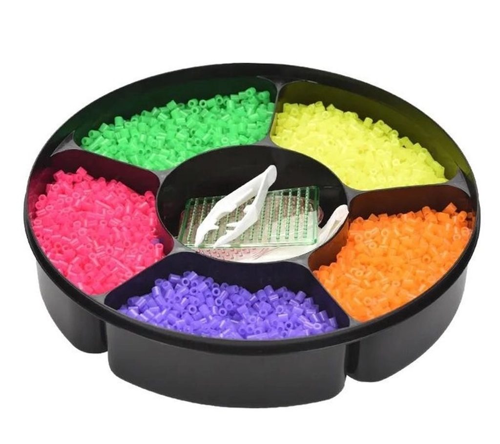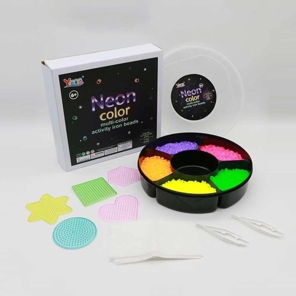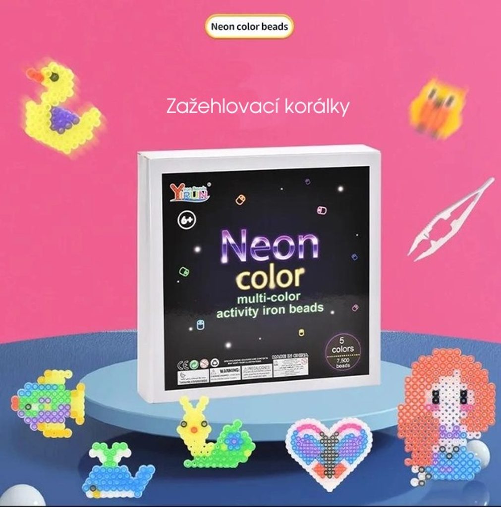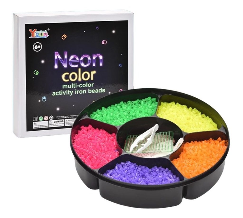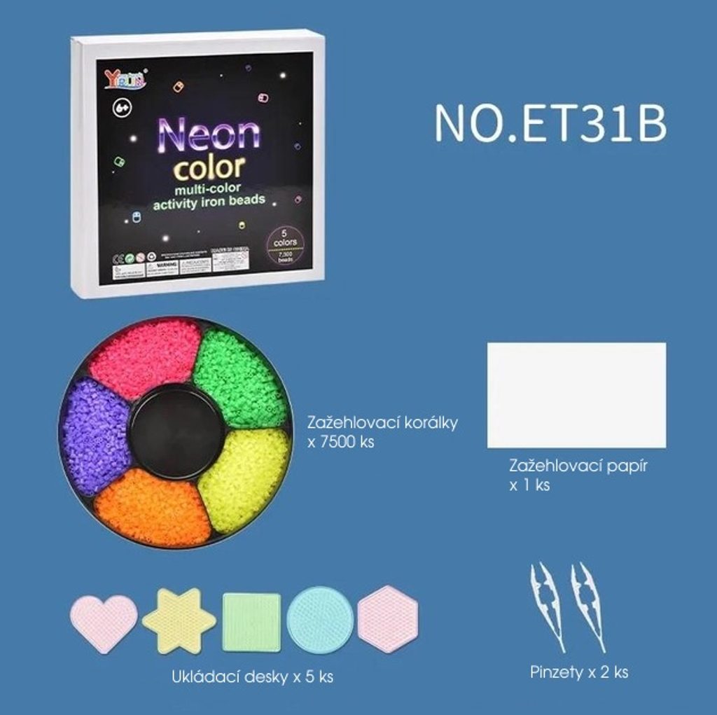 Sada neónových zažehlovacích korálků Neon Iron Beads učí dětí představivost, podporuje kreativitu a manuální dovednosti. Sada obsahuje celkem 7500 ks korálků. Lze z nich vytvářet různé vzory, tvary, náramky, 3D postavičky a náhrdelníky, které se potom zažehlí přes přiložený žehlící papír. Vše je uloženo v praktické dóze. Hračka je určena pro děti od 6 let věku.