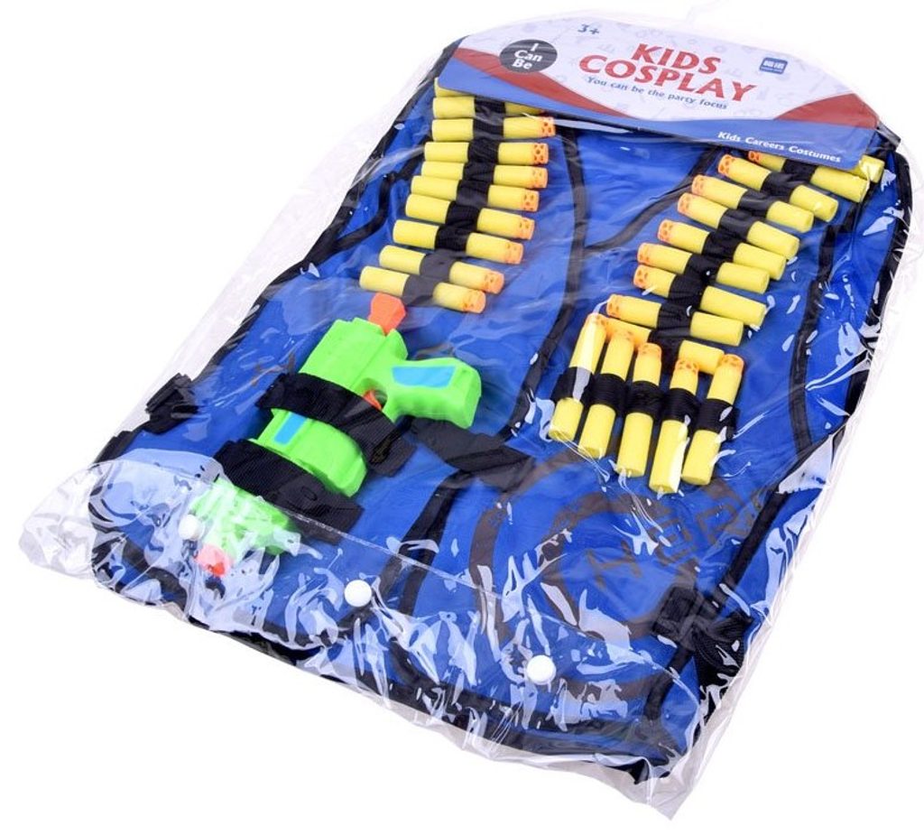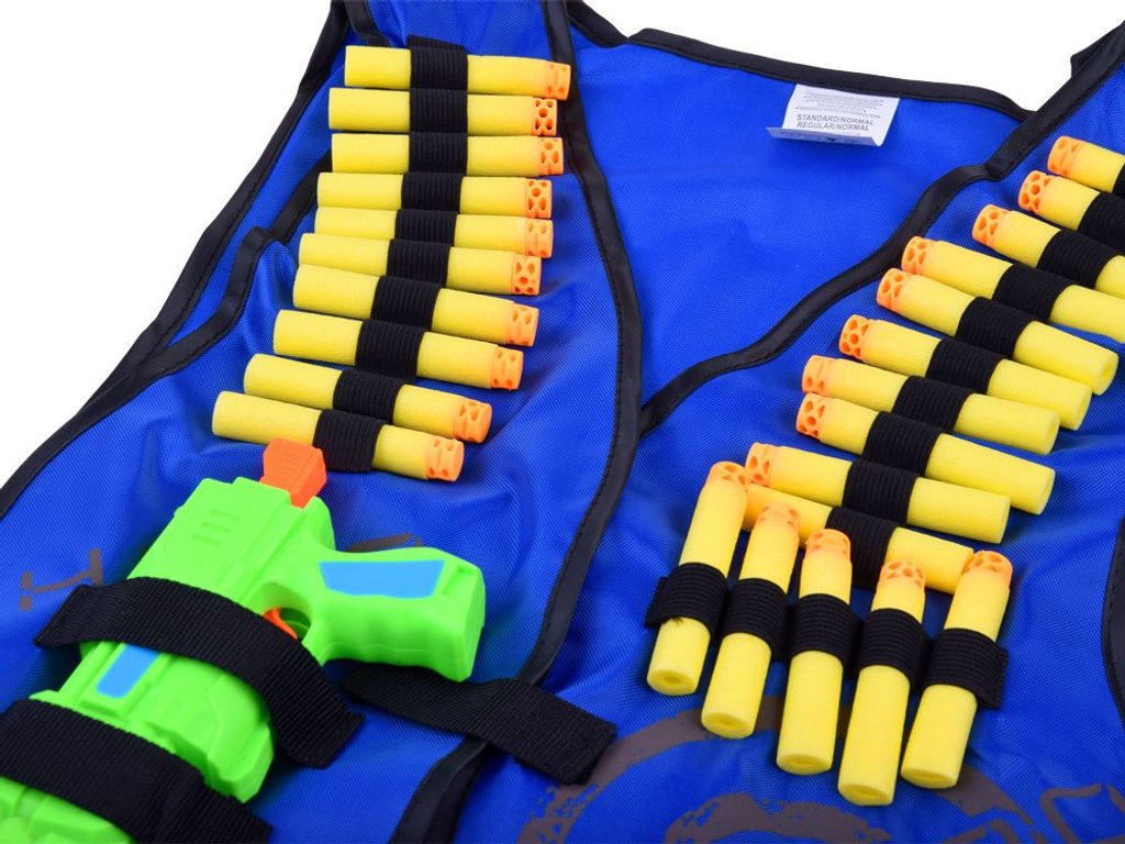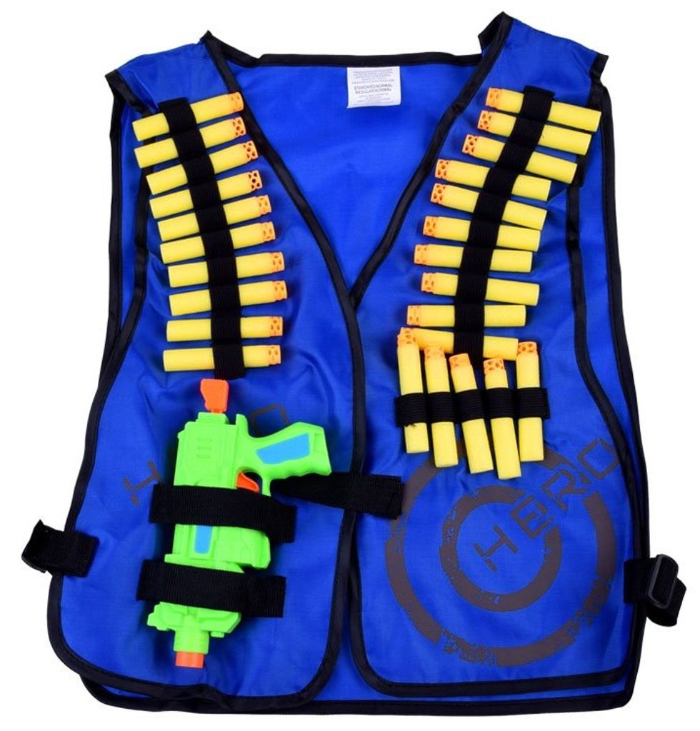 Dětská bojová vesta Hero je ideálním doplňkem ke všem zbraním ze série Nerf. Je vyrobena ze silnějšího materiálu a je vhodná pro děti od 3 do 8 let. Součástí je také malá natahovací pistolka a 25 kusů bezpečných pěnových nábojů.