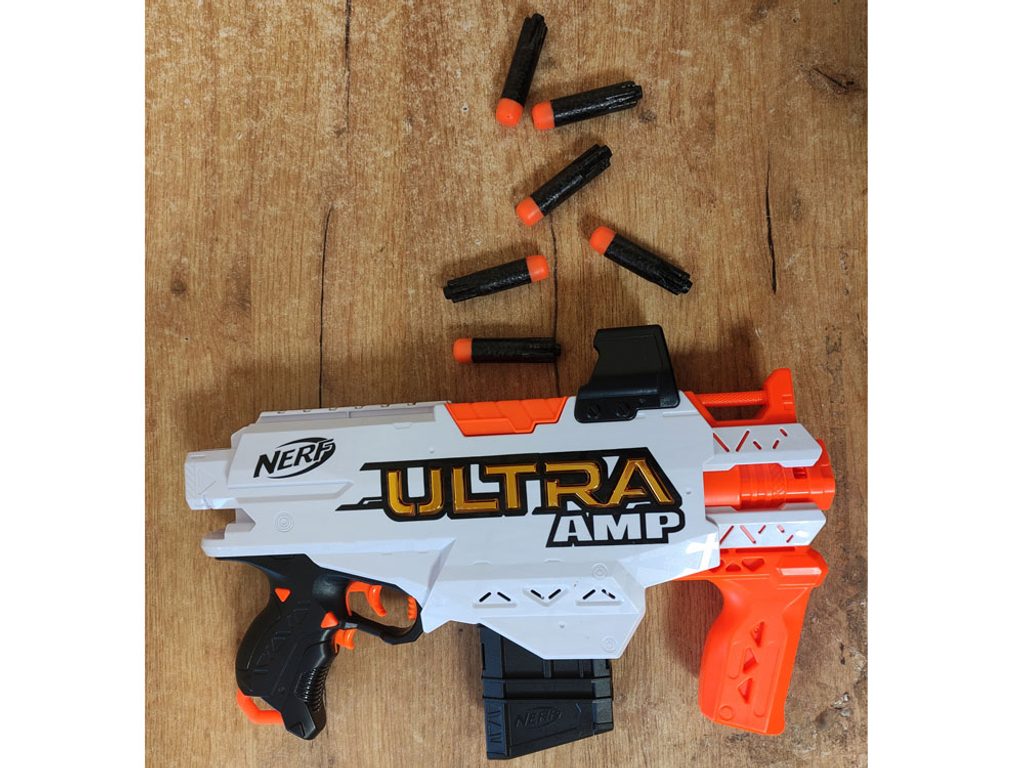 Dětský odpalovač Nerf Ultra AMP je revoluční novinkou, se kterou si užijete zábavu na maximum a je snem každého chlapce. Do zbraně můžete nabít 6 nábojů, které se vkládají do zásobníku. Zbraň má vestavěná mířidla a možnost rychlé střelby. Je napájena bateriemi, které nejsou součástí balení. Dosah střely je až 36 metrů. Jedná se o skvělou zábavu pro chlapce a můžete nám věřit, že ke hře s tímto samopalem se rádi zapojí i tatínkové.