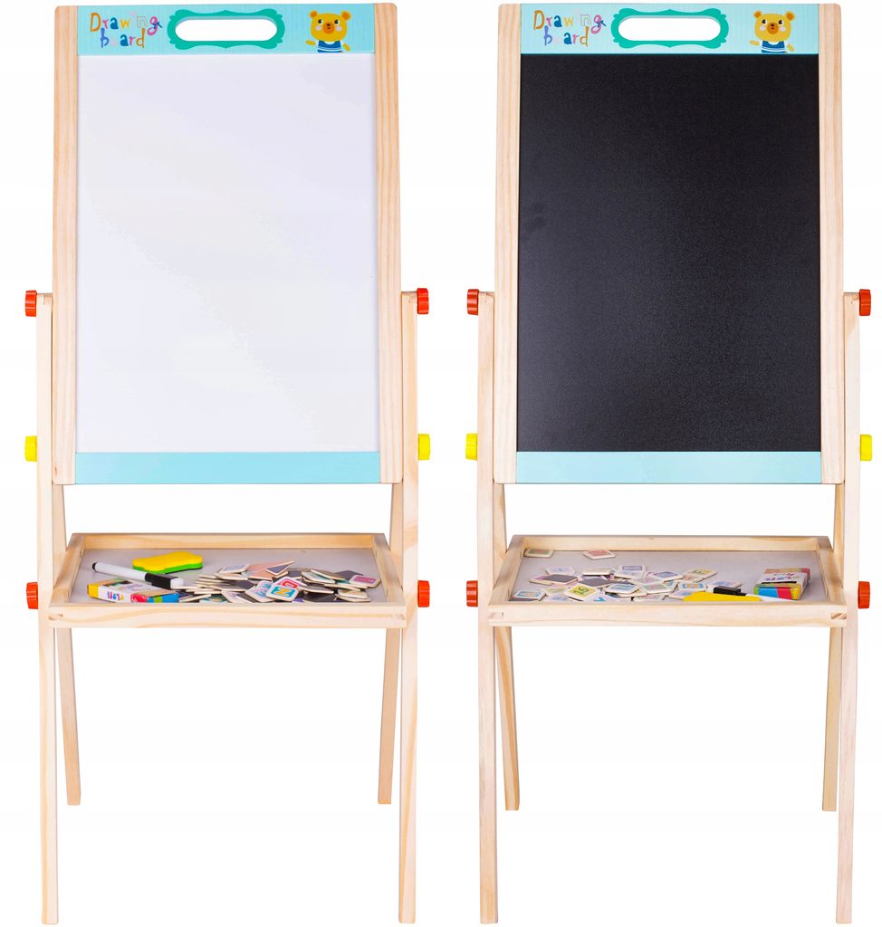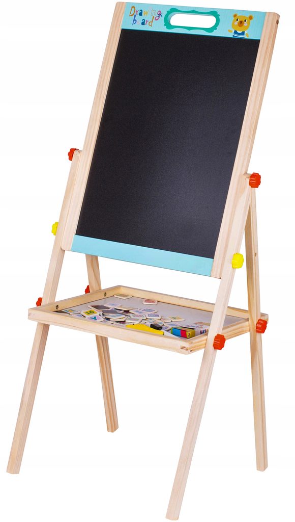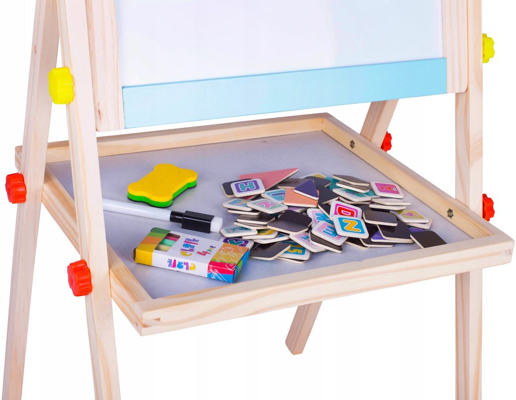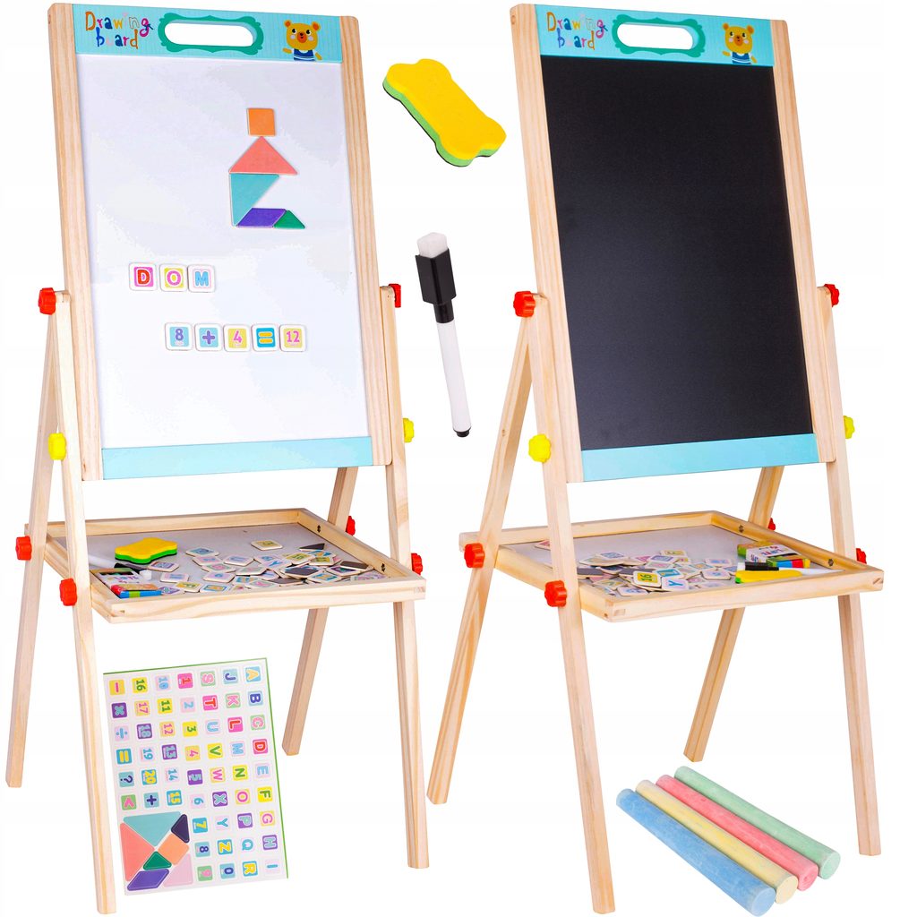 Oboustranná kreslící tabule Double Board je skvělou hračkou při nauce psaní a kreslení. Jedna strana tabule slouží pro psaní křídou, druhá strana slouží pro psaní a kreslení fixem, Ta je zároveň magnetická. Ve spodní části tabule je umístěna odkládací polička. Součástí sady jsou 4 křídy, fix, houbička a také magnetky s různými symboly. Tabuli lze jednoduše složit, zabere tak velmi málo místa. Tato hračka je určena pro děti od 3 let věku.