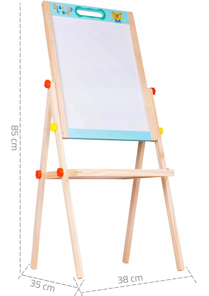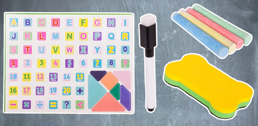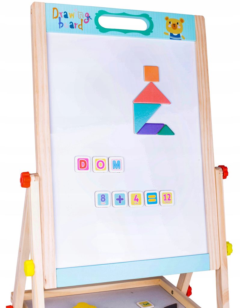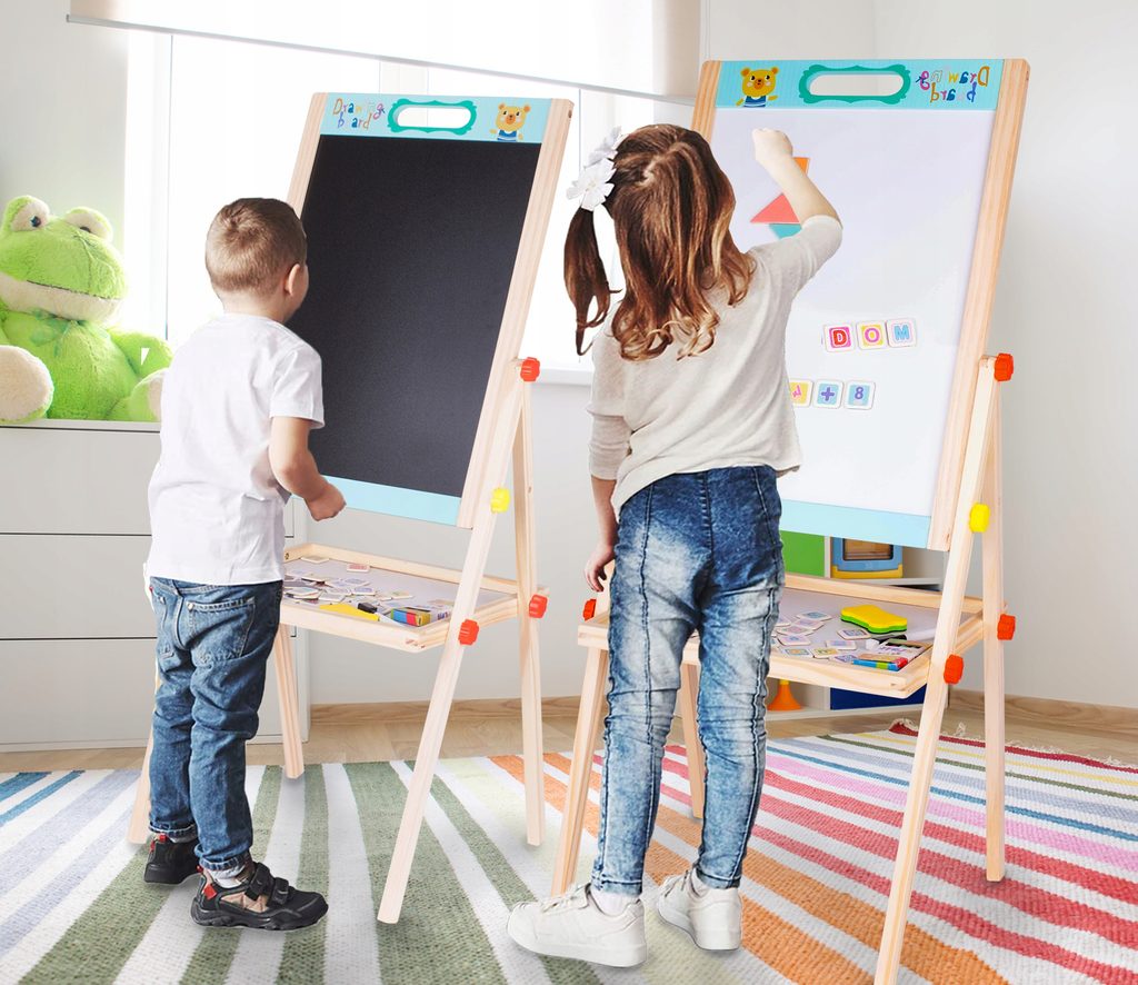 Oboustranná kreslící tabule Double Board je skvělou hračkou při nauce psaní a kreslení. Jedna strana tabule slouží pro psaní křídou, druhá strana slouží pro psaní a kreslení fixem, Ta je zároveň magnetická. Ve spodní části tabule je umístěna odkládací polička. Součástí sady jsou 4 křídy, fix, houbička a také magnetky s různými symboly. Tabuli lze jednoduše složit, zabere tak velmi málo místa. Tato hračka je určena pro děti od 3 let věku.