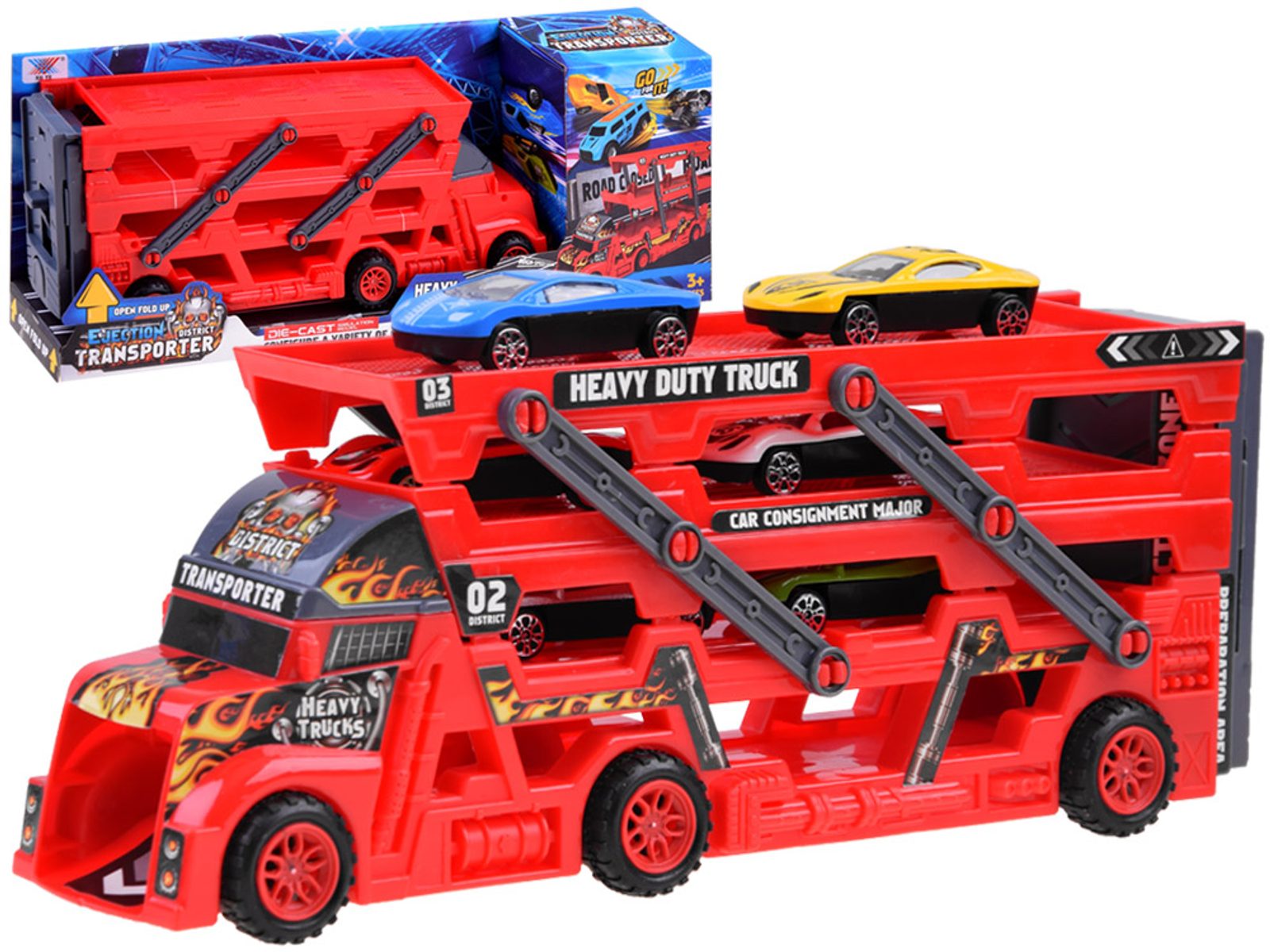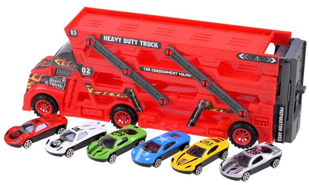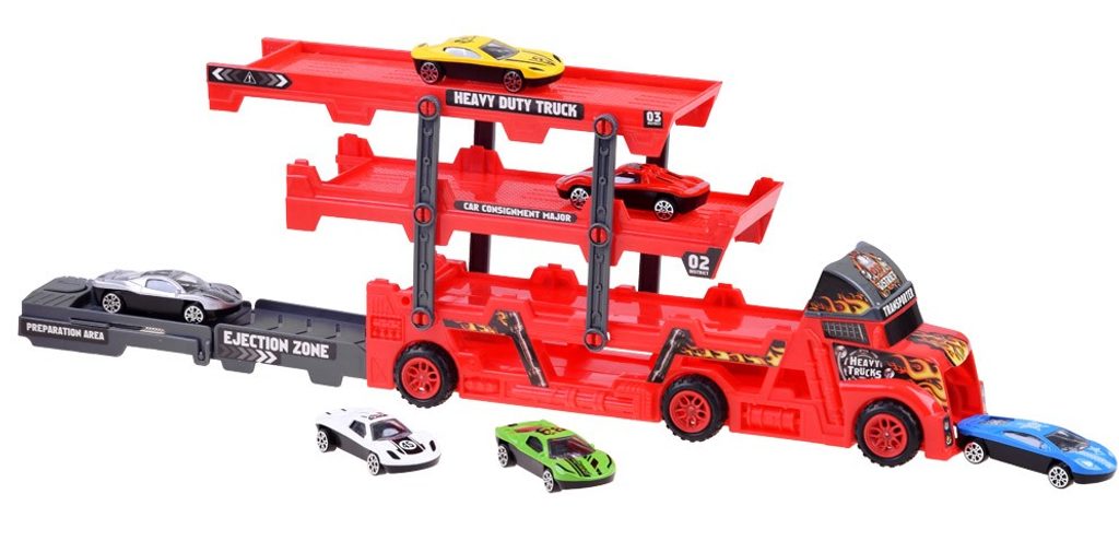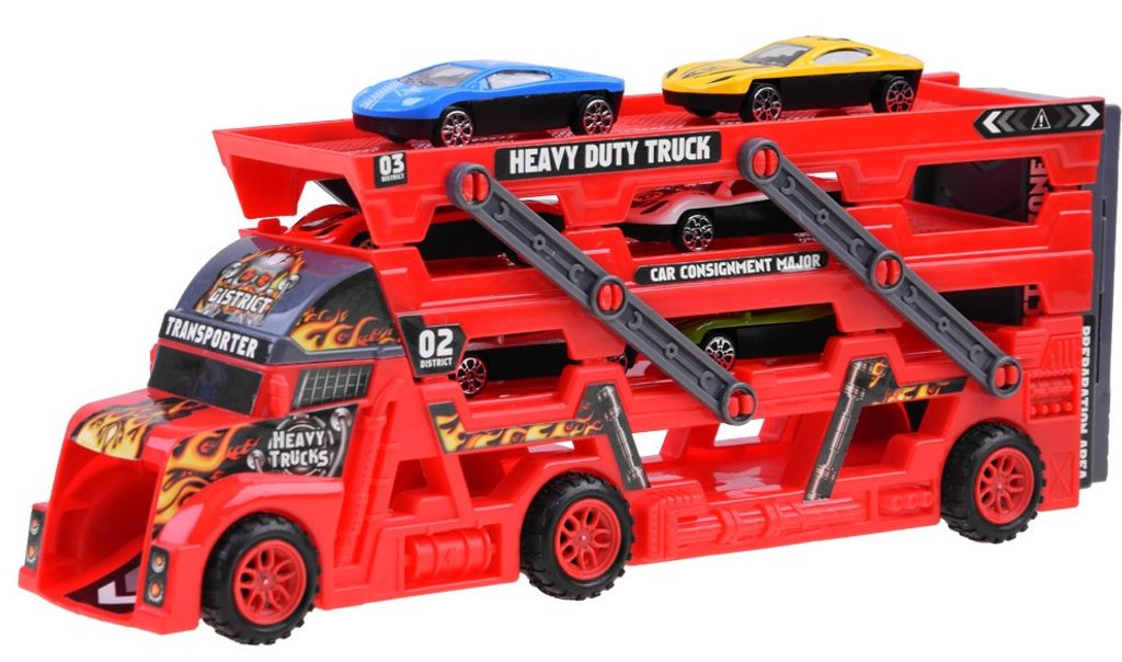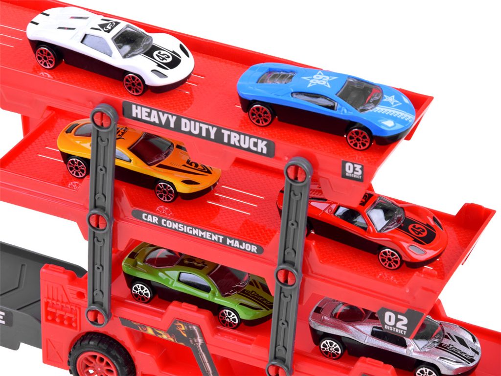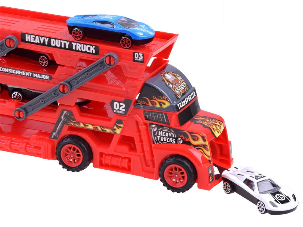 Odtahové autíčko Heavy Truck se skluzavkou a zadní rampou. Sestava obsahuje nákladní automobil s tříúrovňovou plošinou pro osobní automobily. Díky tomu, že je plošina rozložená, se všechny autíčka snadno vejdou. V zadní části vozu je odpružená rampa a autíčka mají výjezd vpředu. Součástí auta je 6 různých autíček. Hračka je určena pro děti od 36 měsíců věku.