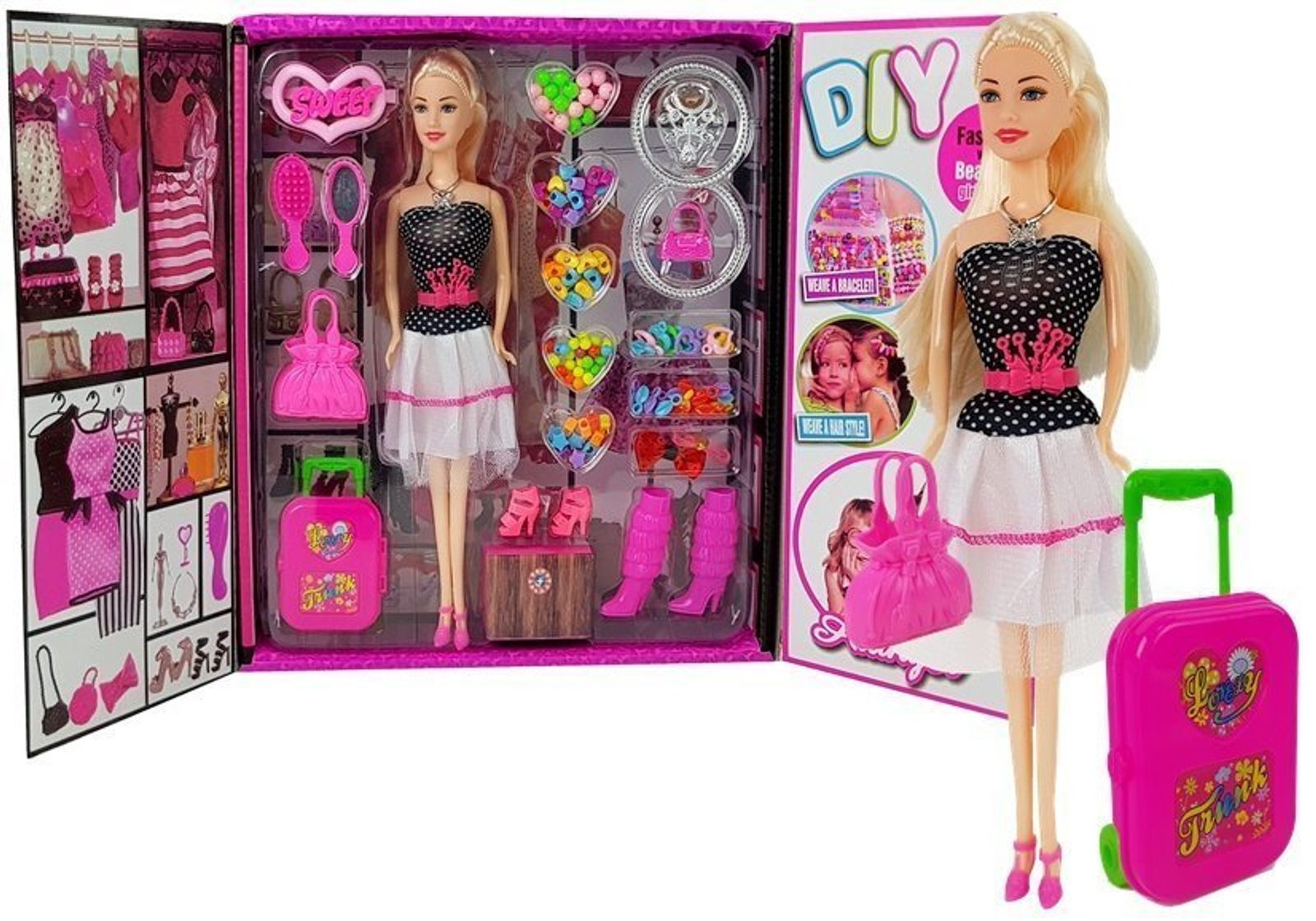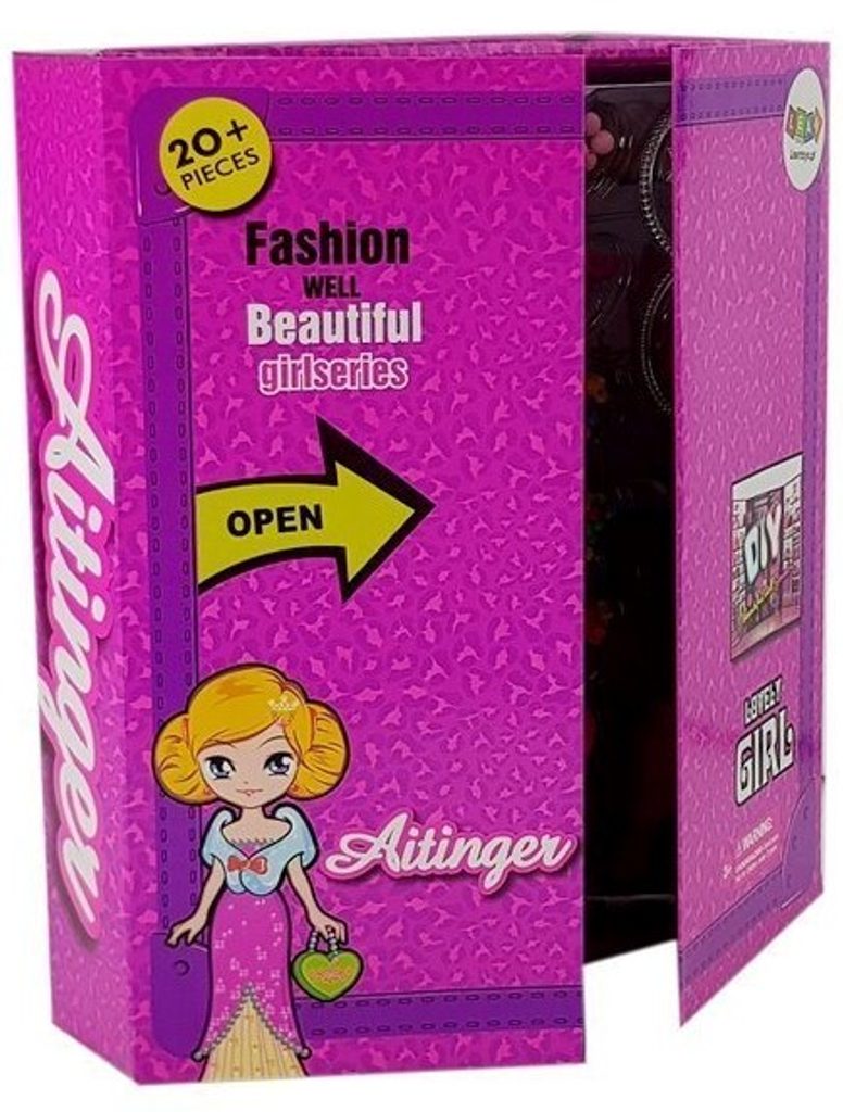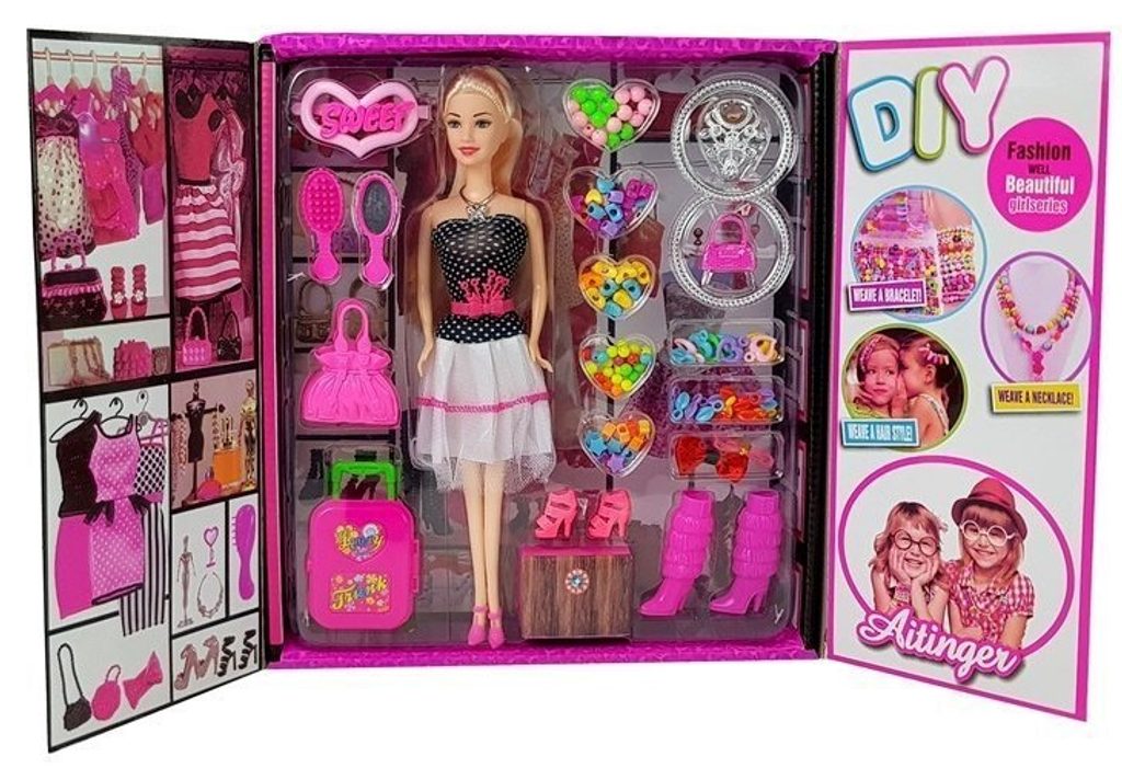 Dětské sestava Fashion Wardrobe obsahuje vše potřebné pro péči o panenku. Základem sestavy je krabice a panenka v šatech s výškou 28 cm. V sadě najdete spoustu dalších užitečných věcí jako jsou náhradní botičky, cestovní kufr, kabelka, náramky, gumičky, korálky, sponky, hřeben a zrcadlo. Hračka je určena pro děti od 36 měsíců věku.