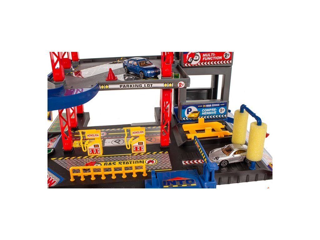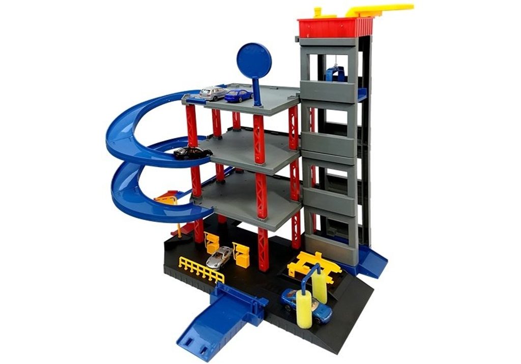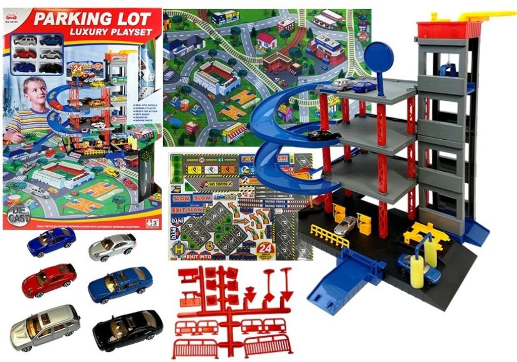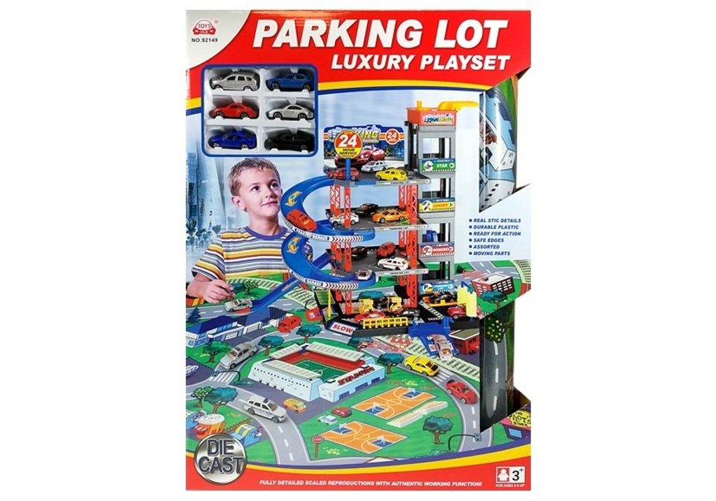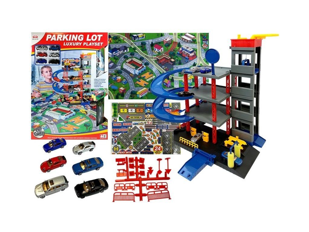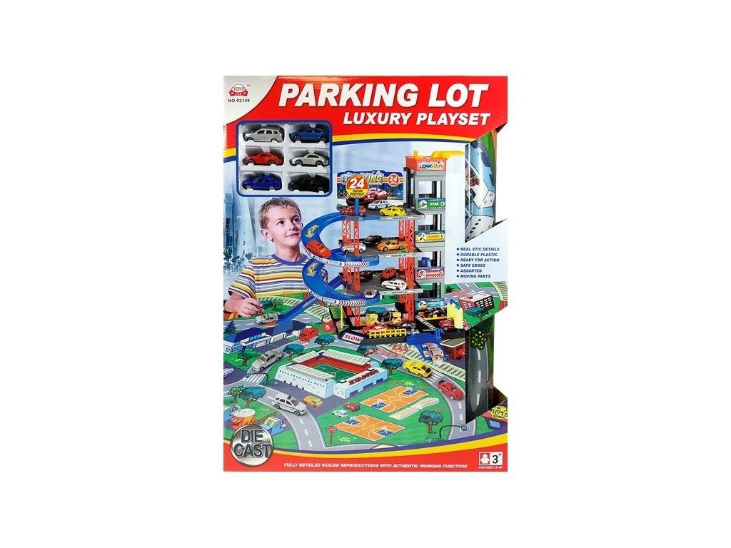 Dětská patrová garáž Parking Lot se 6 kovovými autíčky a velkou hrací podložkou s vyznačenými silnicemi. Součástí parkoviště je pohyblivý výtah, který umožňuje přesouvat autíčka mezi jednotlivými patry, pouliční osvětlení, benzínová pumpa, přistávací plocha vrtulníku a dopravní značky. Jednotlivá patra jsou propojena spirálovitou dráhou. Mladý motoristický nadšenec zde nalezne vše co potřebuje. Vyrobena z velmi kvalitního materiálu bez ostrých hran.