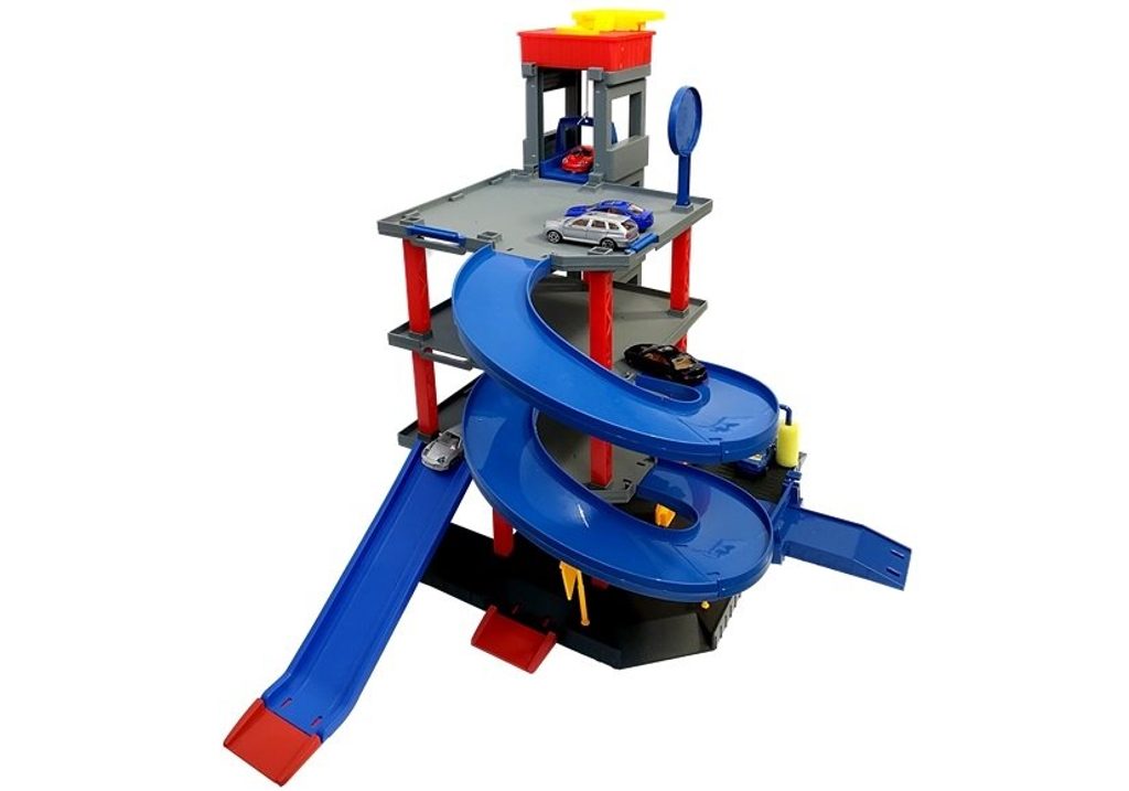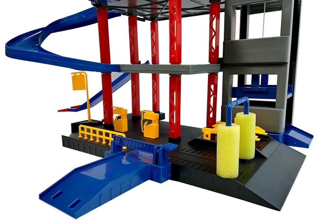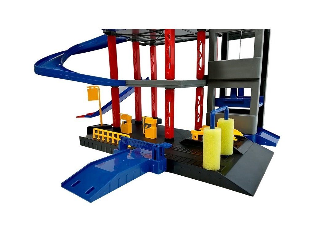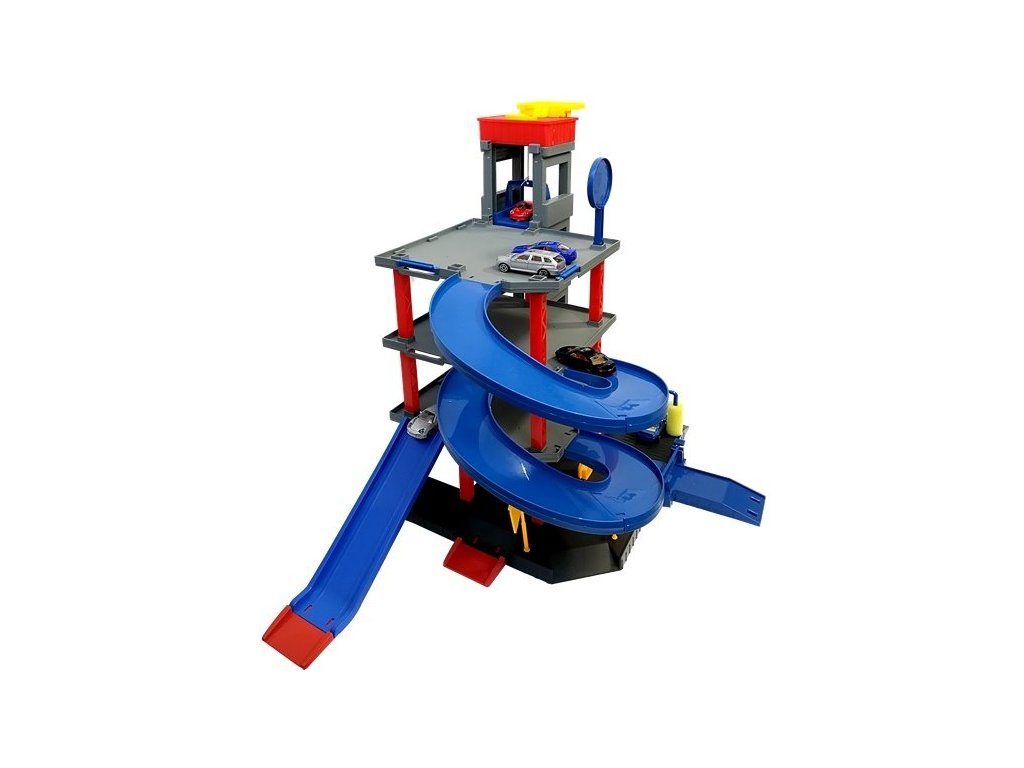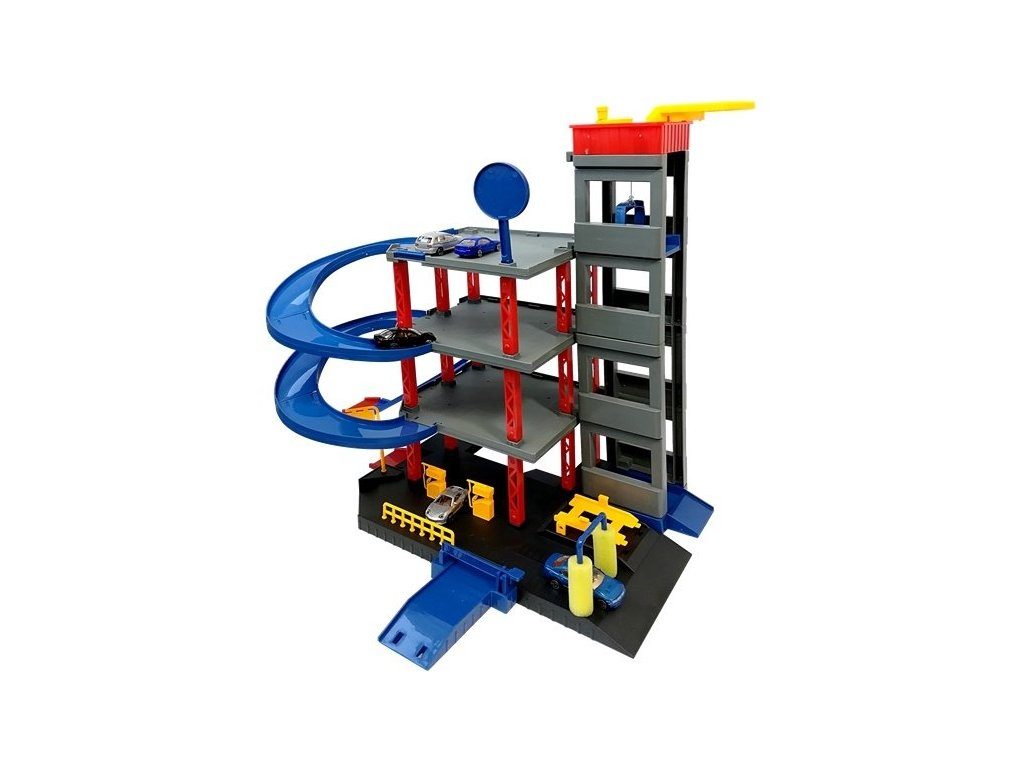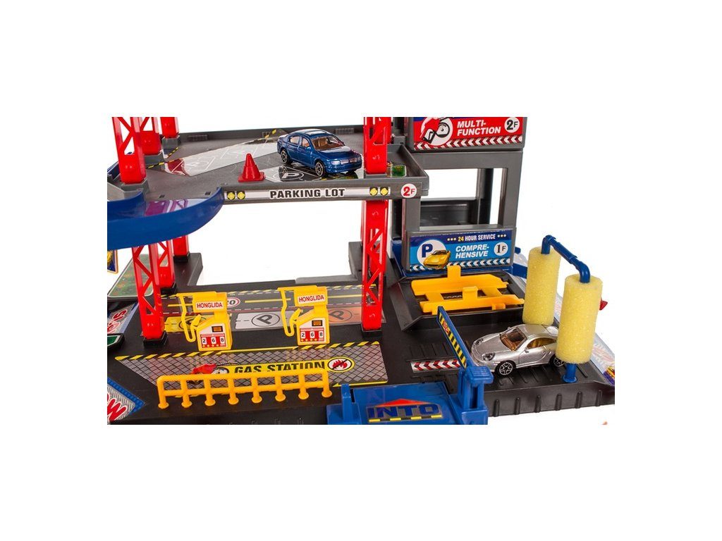 Dětská patrová garáž Parking Lot se 6 kovovými autíčky a velkou hrací podložkou s vyznačenými silnicemi. Součástí parkoviště je pohyblivý výtah, který umožňuje přesouvat autíčka mezi jednotlivými patry, pouliční osvětlení, benzínová pumpa, přistávací plocha vrtulníku a dopravní značky. Jednotlivá patra jsou propojena spirálovitou dráhou. Mladý motoristický nadšenec zde nalezne vše co potřebuje. Vyrobena z velmi kvalitního materiálu bez ostrých hran.