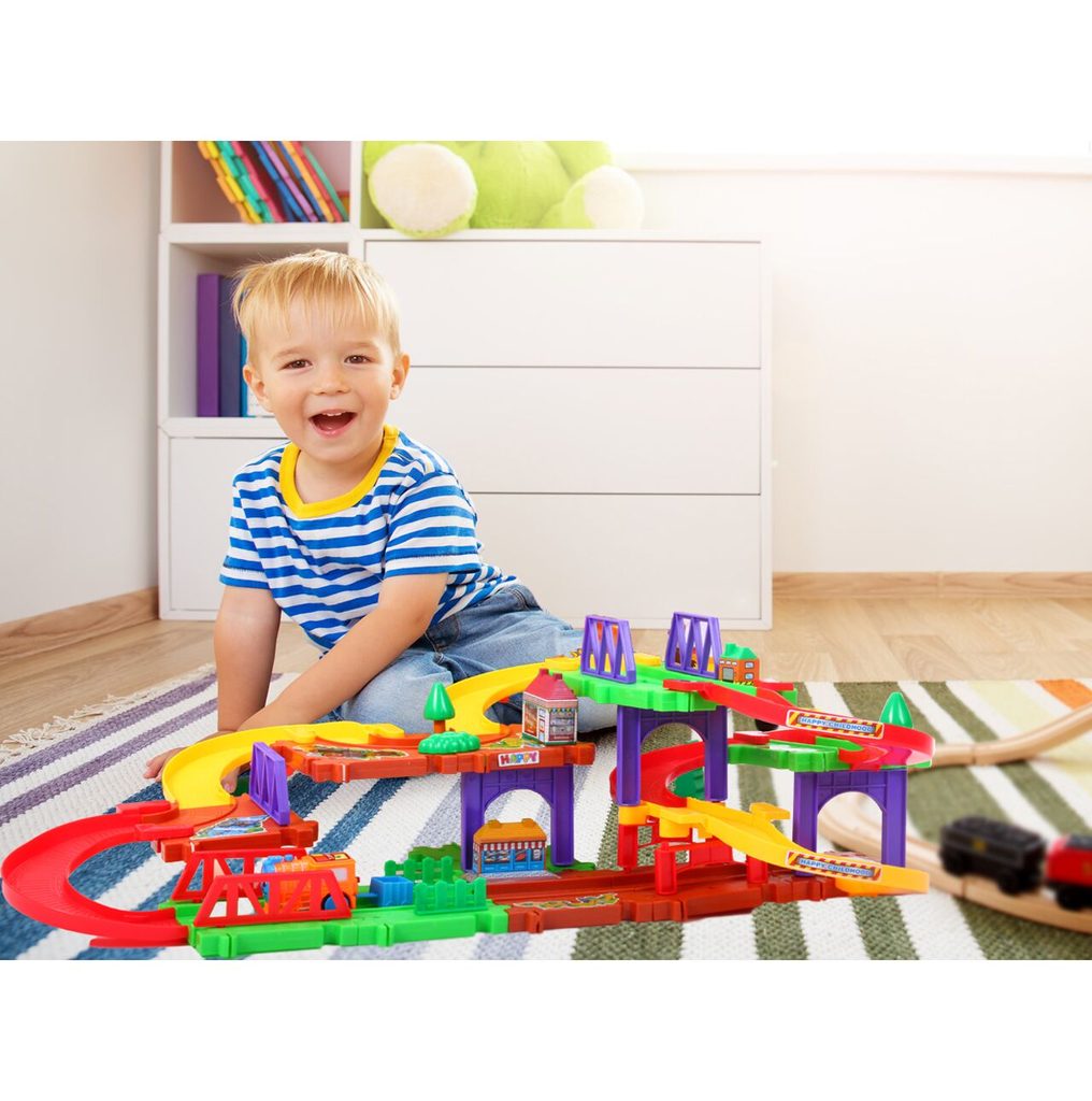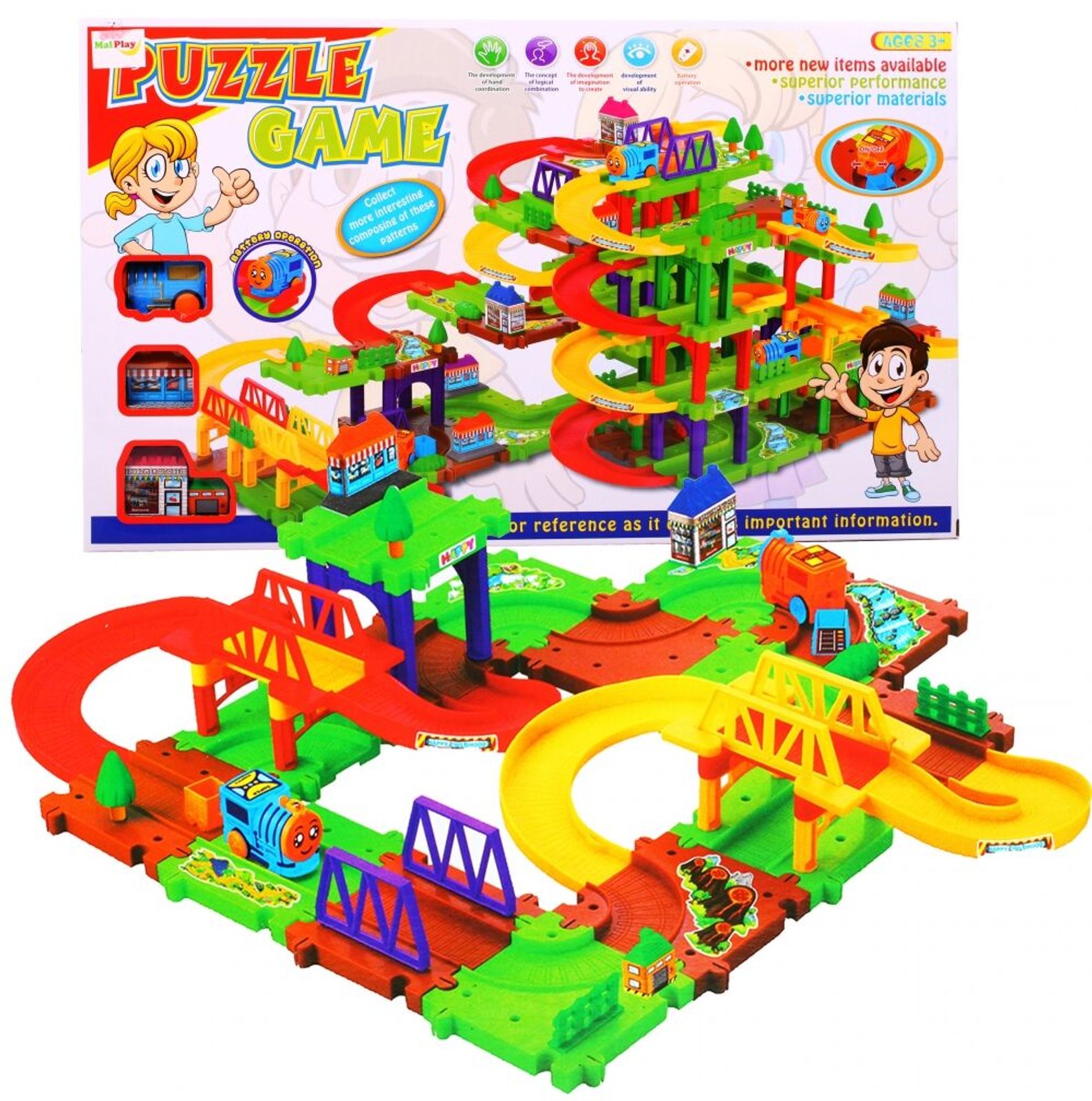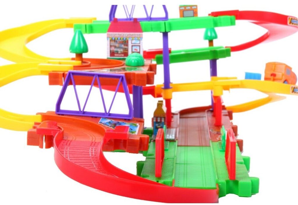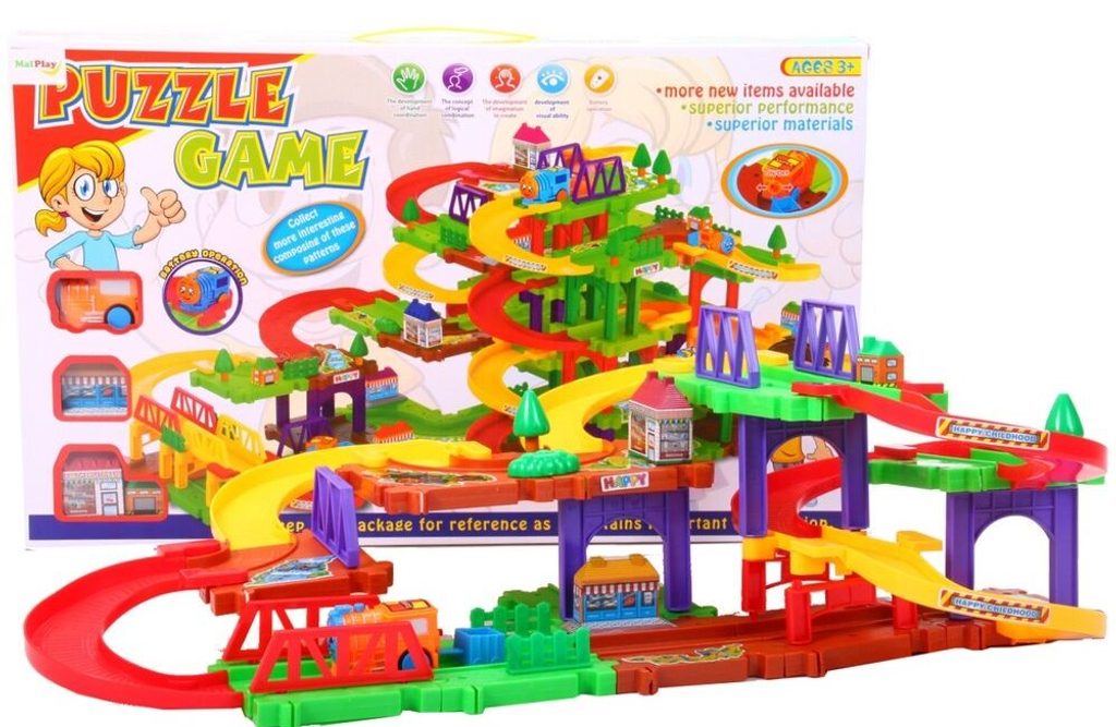 Dětská parkovací garáž s lokomotivou na baterie a příslušenstvím Puzzle Parking. Podlaží jsou propojena sjížděcí dráhou. Garáž má ve výbavě lokomotivu, která se po vložení baterie pohybuje. Jednotlivé prvky garáže lze libovolně kombinovat. Mladý motoristický nadšenec zde nalezne vše co potřebuje. Je vyrobena z plastu bez ostrých hran a určena pro děti od 3 let.