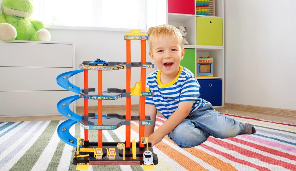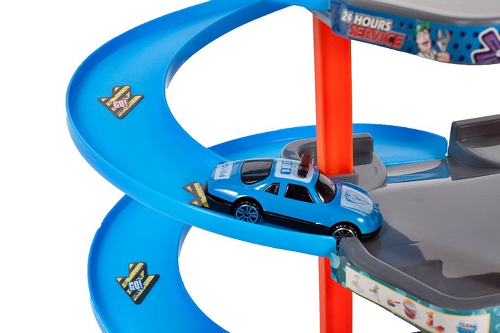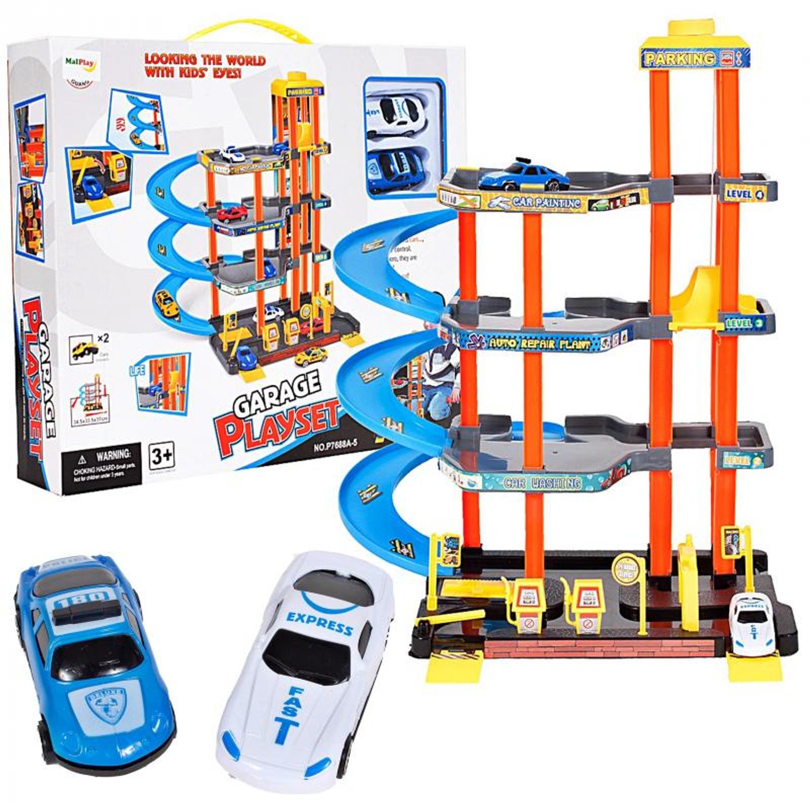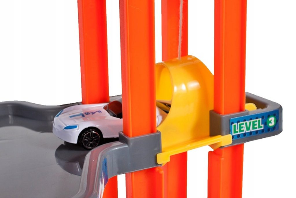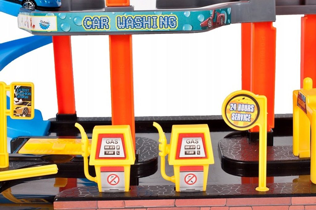 Dětská patrová garáž se 2 autíčky Garage Playset. Součástí parkoviště je pohyblivý výtah, který umožňuje přesouvat autíčka mezi jednotlivými patry, benzínové stojany, závora, dopravní znaky a spirálová dráha. Mladý motoristický nadšenec zde nalezne vše co potřebuje. Je vyrobena z materiálu bez ostrých hran a určena pro děti od 3 let věku.