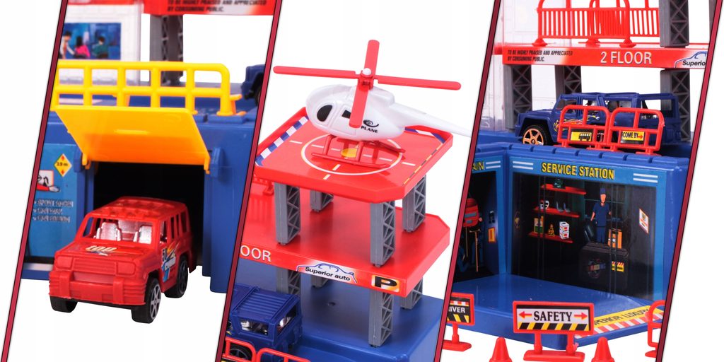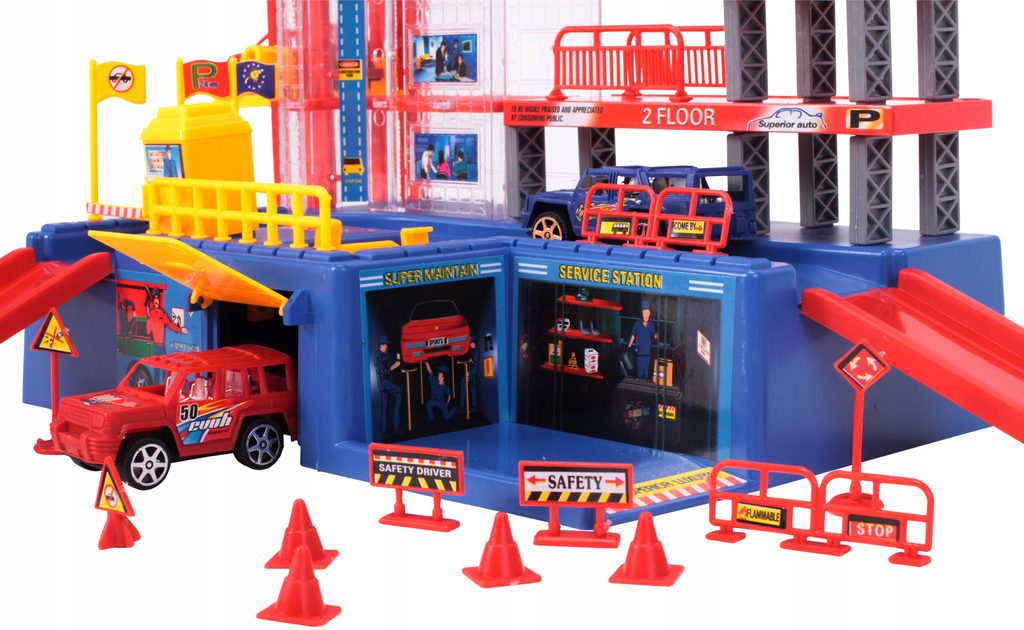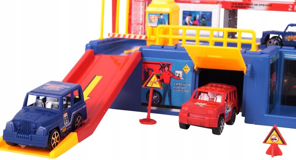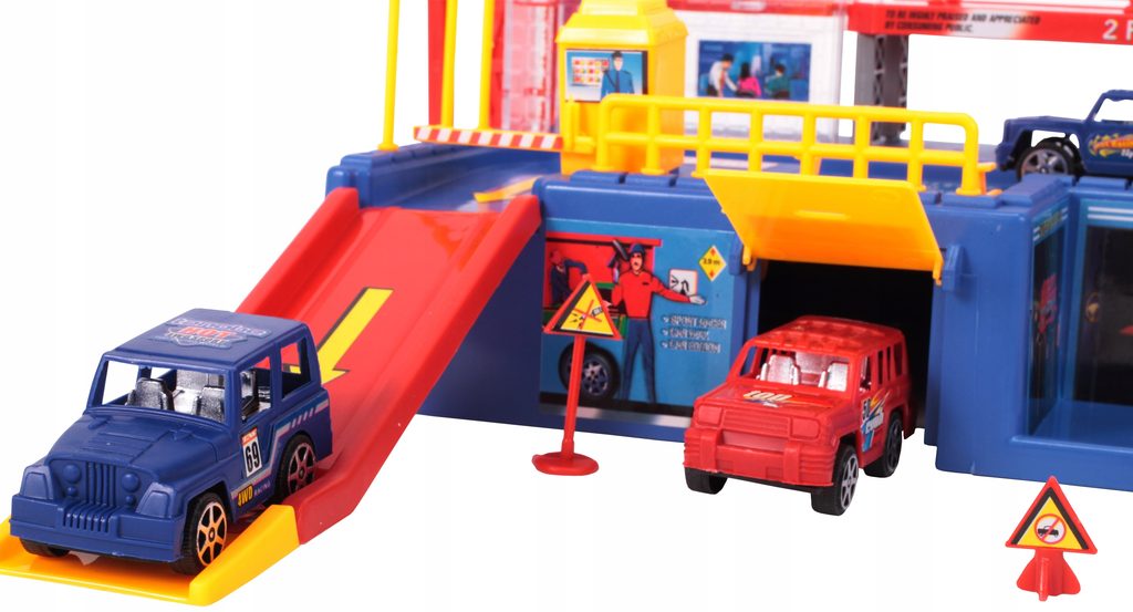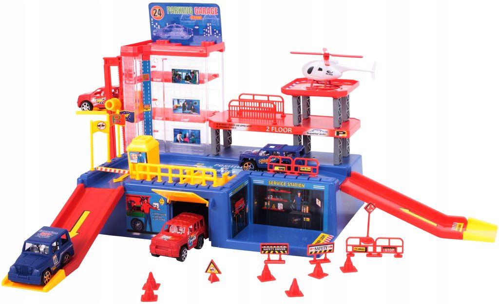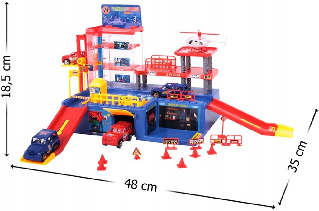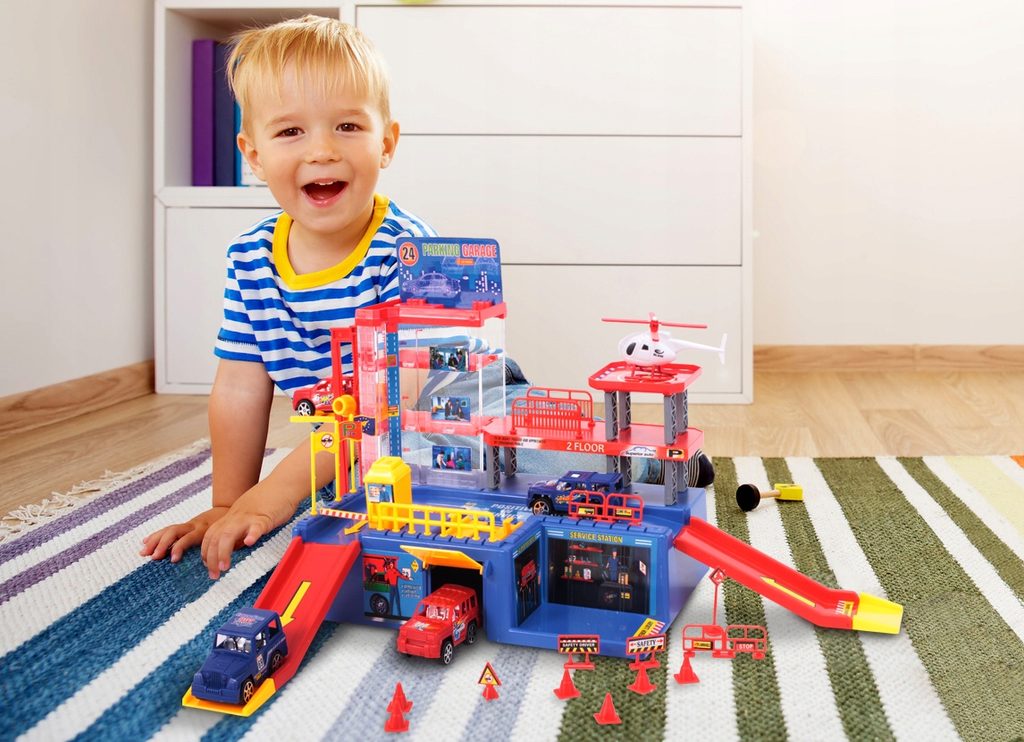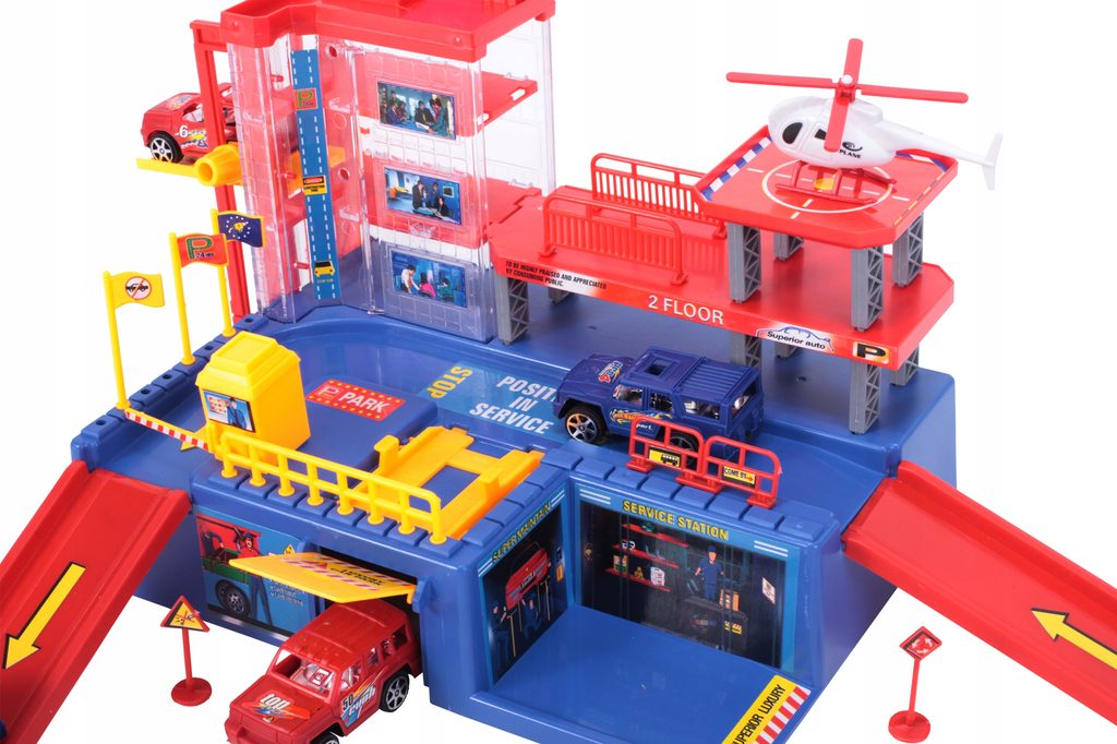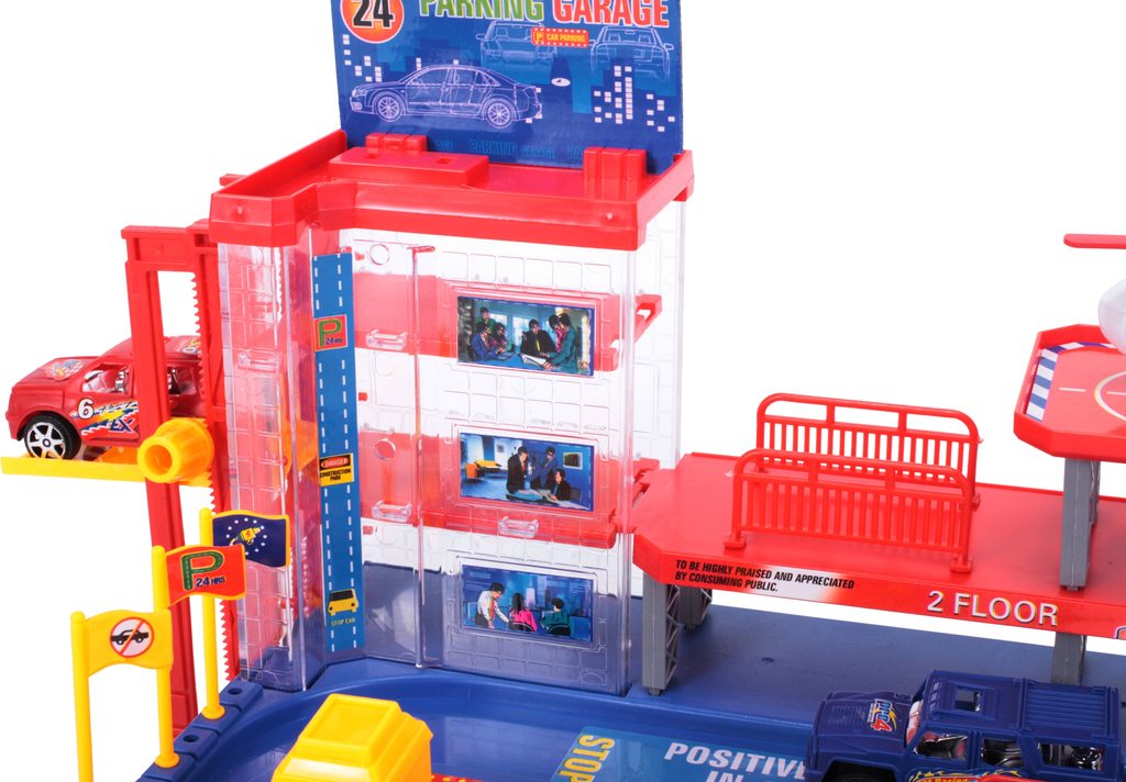 Dětská patrová garáž se 4 autíčky a helikoptérou Parking lot. Součástí parkoviště je pohyblivý výtah, který umožňuje přesouvat autíčka mezi jednotlivými patry, garáž, závora, dopravní značení, servisní plocha a dráha. Mladý motoristický nadšenec zde nalezne vše co potřebuje. Je vyrobena z materiálu bez ostrých hran a určena pro děti od 3 let věku.