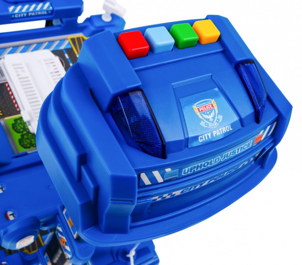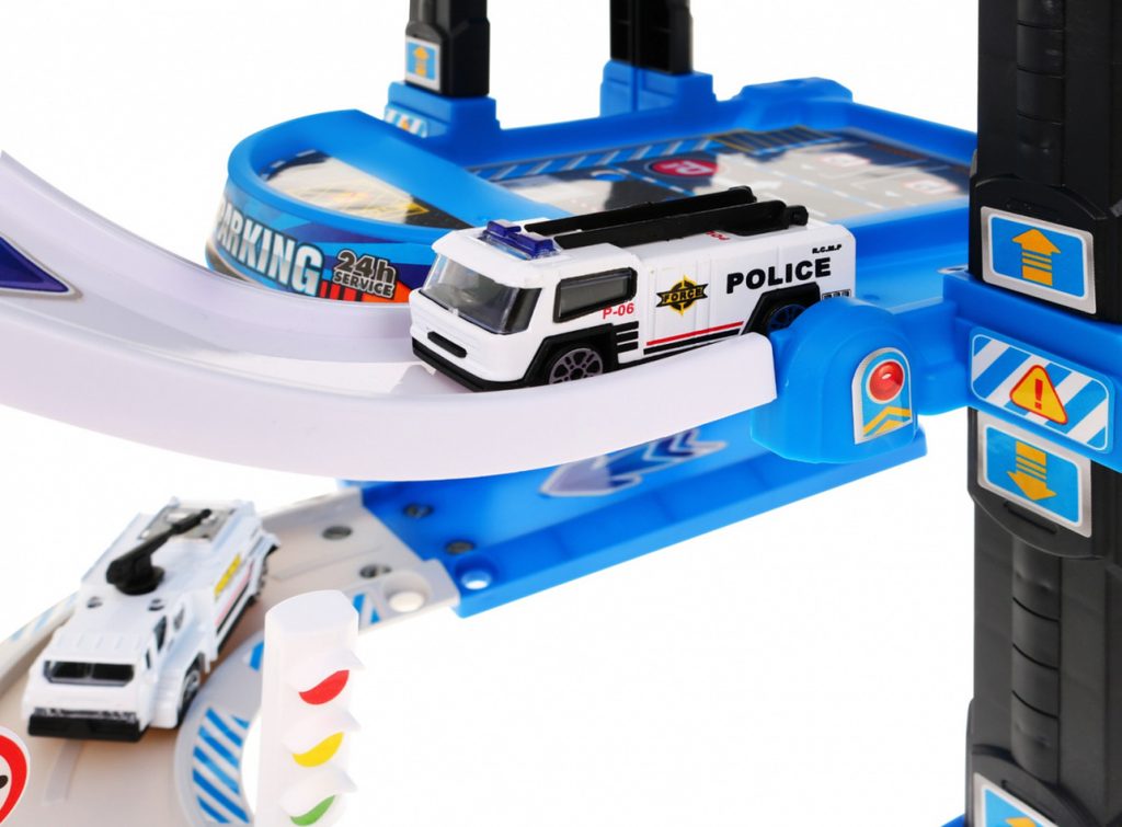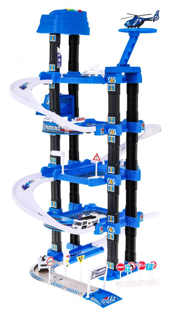 Dětská pětipatrová garáž se 2 autíčky, helikoptérou a pohyblivým výtahem a příslušenstvím Police Garage. Všechna podlaží jsou propojena sjížděcí dráhou a také pohyblivým výtahem na baterie, který za jízdy bliká a vydává zvuky jízdy nahoru a dolů. Součástí sady je také barevná podložka s vyobrazenými cestami a budovami a také dopravní značky. Mladý motoristický nadšenec zde nalezne vše co potřebuje. Je vyrobena z plastu bez ostrých hran a určena pro děti od 3 let.