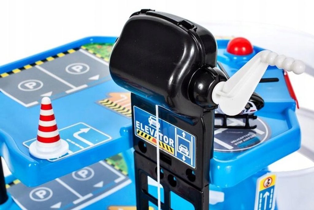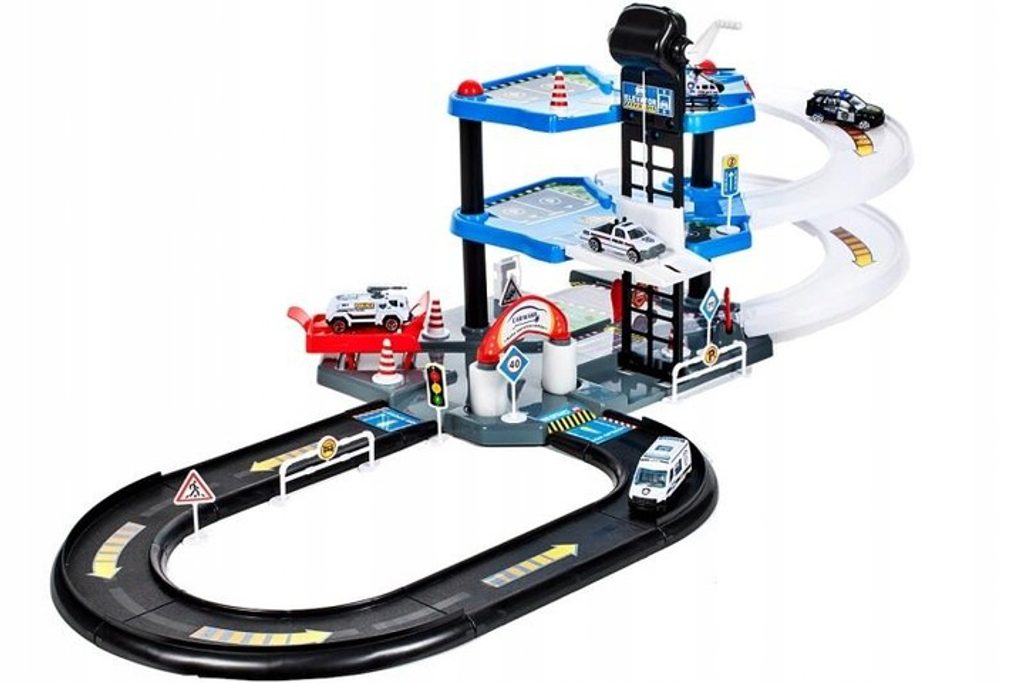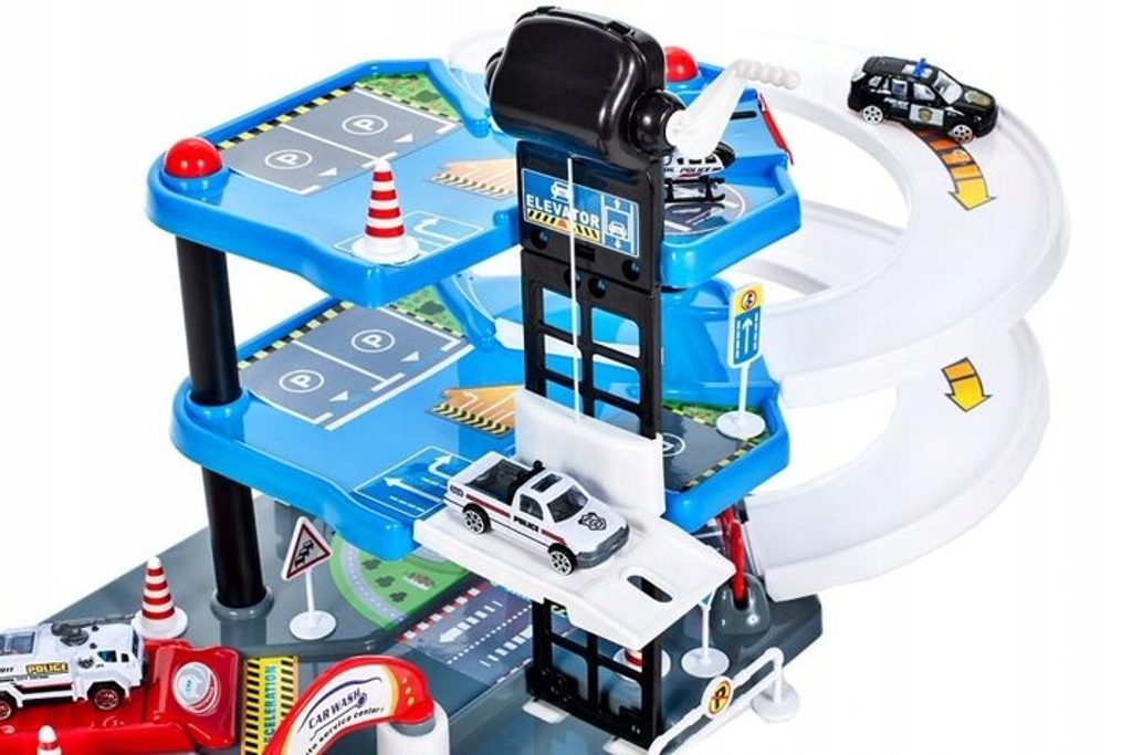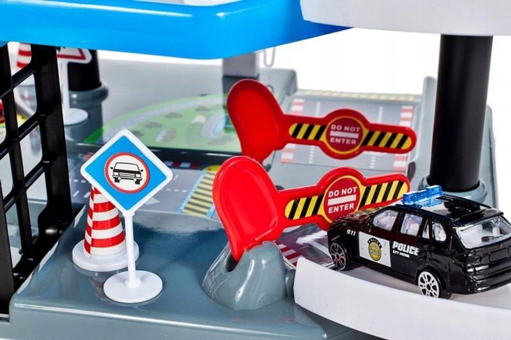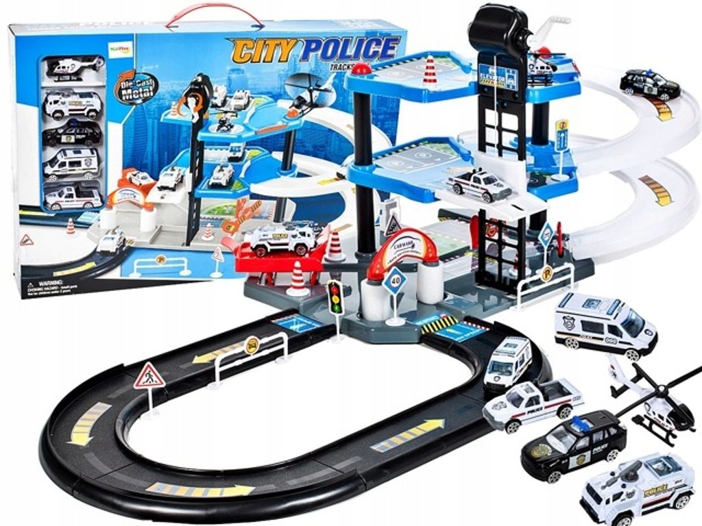 Dětská patrová garáž City Police se 4 různými policejními autíčky je ideální hračkou pro každého malého motoristu. Součástí parkoviště je pohyblivý výtah, který umožňuje přesouvat autíčka mezi jednotlivými patry, dopravní značení, skluzavka, dopravní značky a také vrtulník. Mladý motoristický nadšenec zde nalezne vše co potřebuje. Garáž je vyrobena z materiálu bez ostrých hran a je určena pro děti od 3 let věku.