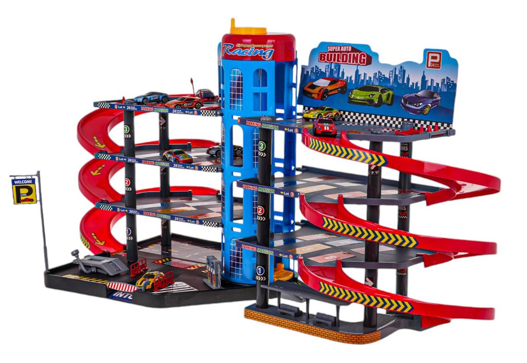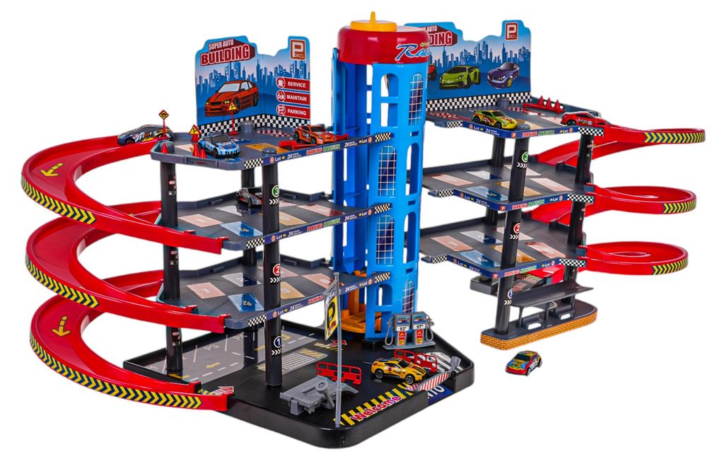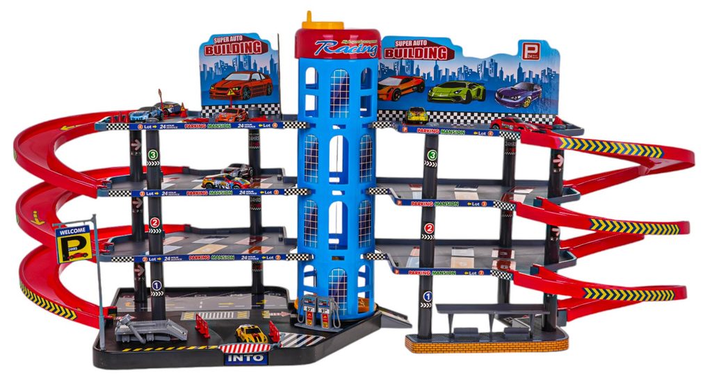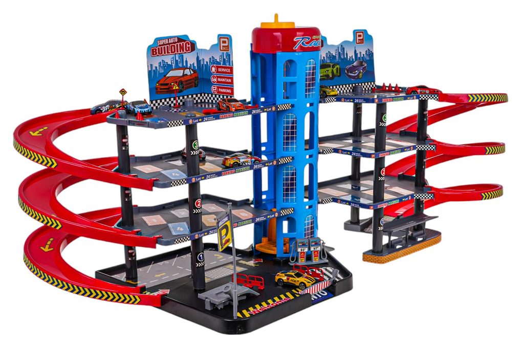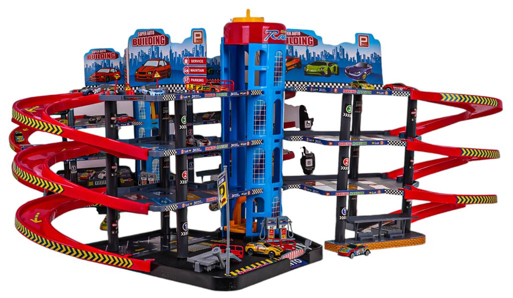 Dětská čtyřpatrová XXL garáž s 8 autíčky, helikoptérou a pohyblivým výtahem a příslušenstvím Mega Parking. Všechna podlaží jsou propojena sjížděcí dráhou a také pohyblivým výtahem. Ve spodní části parkoviště se nachází benzínová pumpa, vjezdy a závora. Mladý motoristický nadšenec zde nalezne vše co potřebuje. Je vyrobena z plastu bez ostrých hran a určena pro děti od 3 let.
