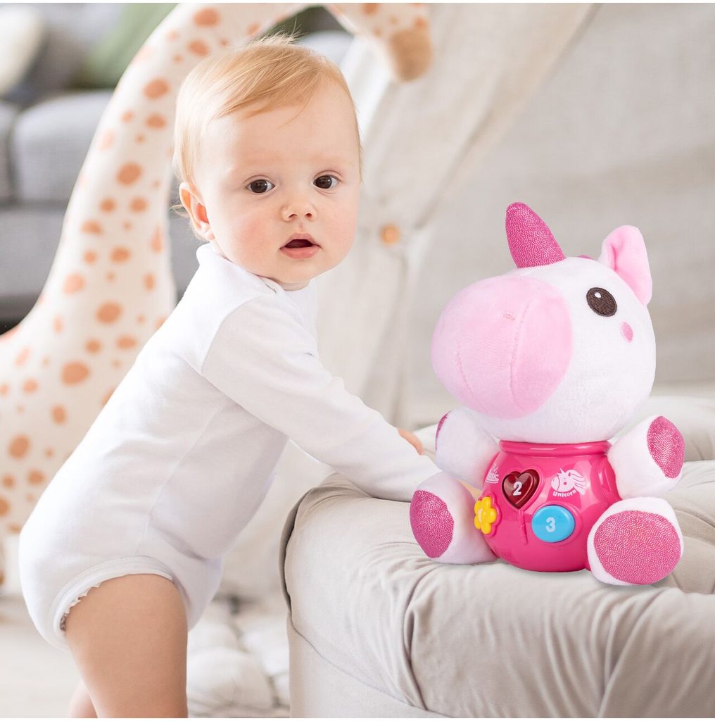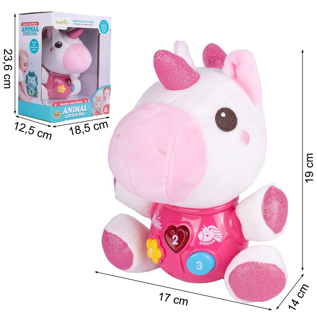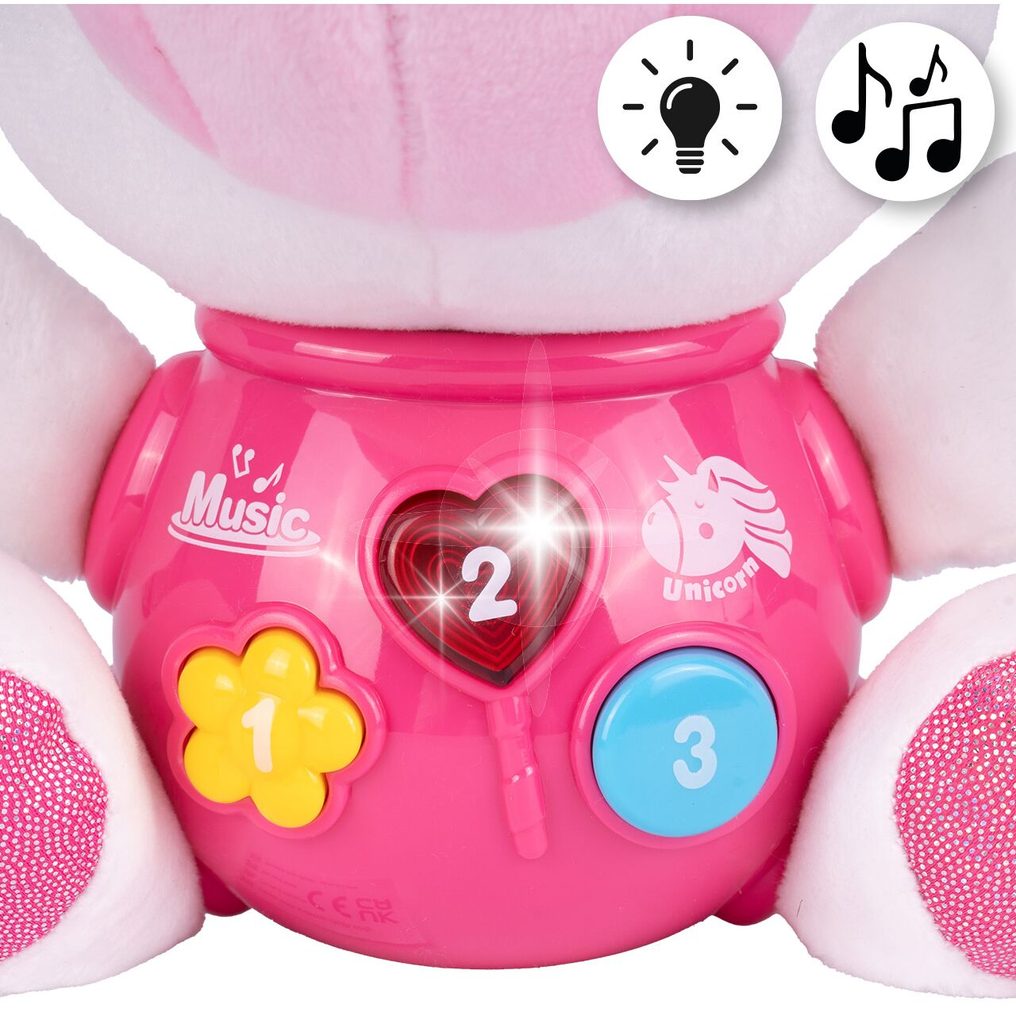 Interaktivní plyšový jednorožec Magic Unicorn je ideální hračkou nejmenší děti. Je vyroben z jemného na dotyk příjemného materiálu. Po zmáčkutí tlačítek se spustí, osvětlení, zvuky a melodie.  Hračka je určena pro děti od 6 měsíců věku.