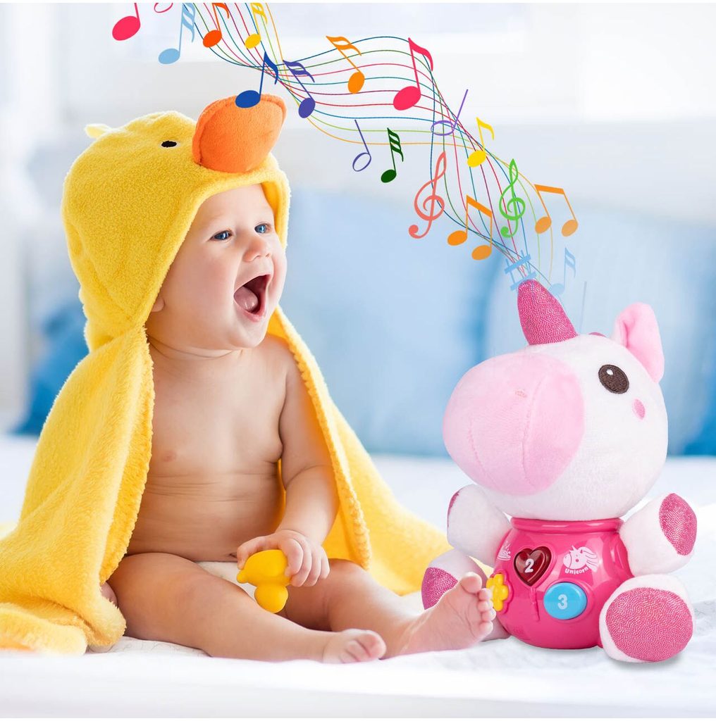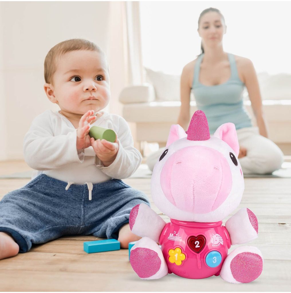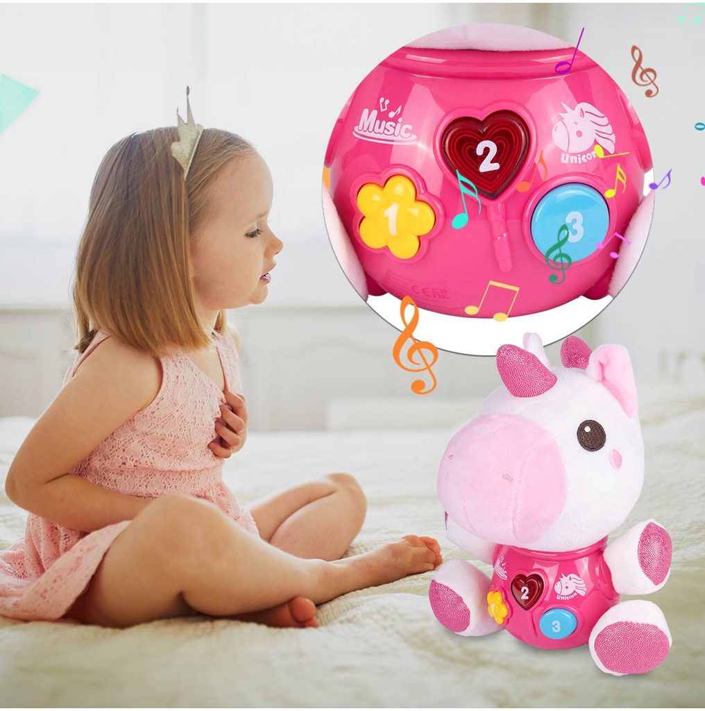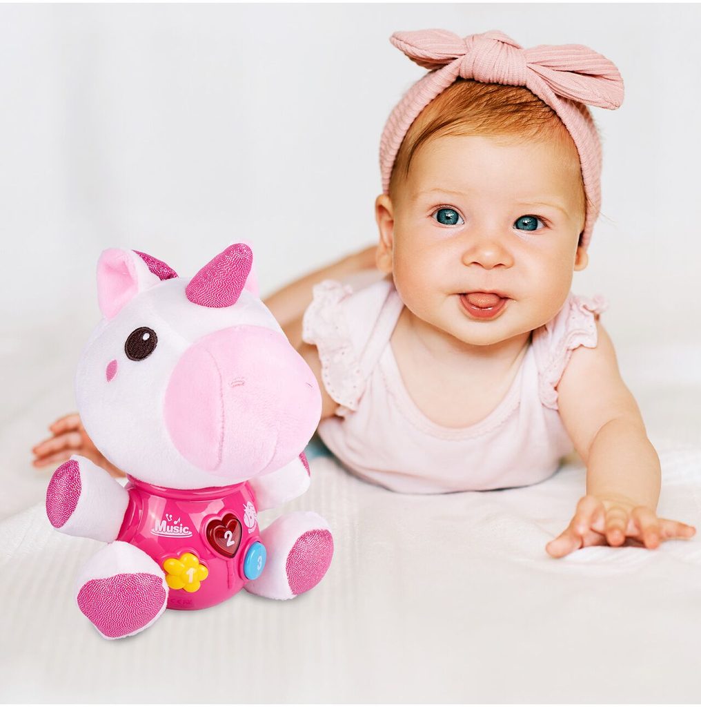 Interaktivní plyšový jednorožec Magic Unicorn je ideální hračkou nejmenší děti. Je vyroben z jemného na dotyk příjemného materiálu. Po zmáčkutí tlačítek se spustí, osvětlení, zvuky a melodie.  Hračka je určena pro děti od 6 měsíců věku.