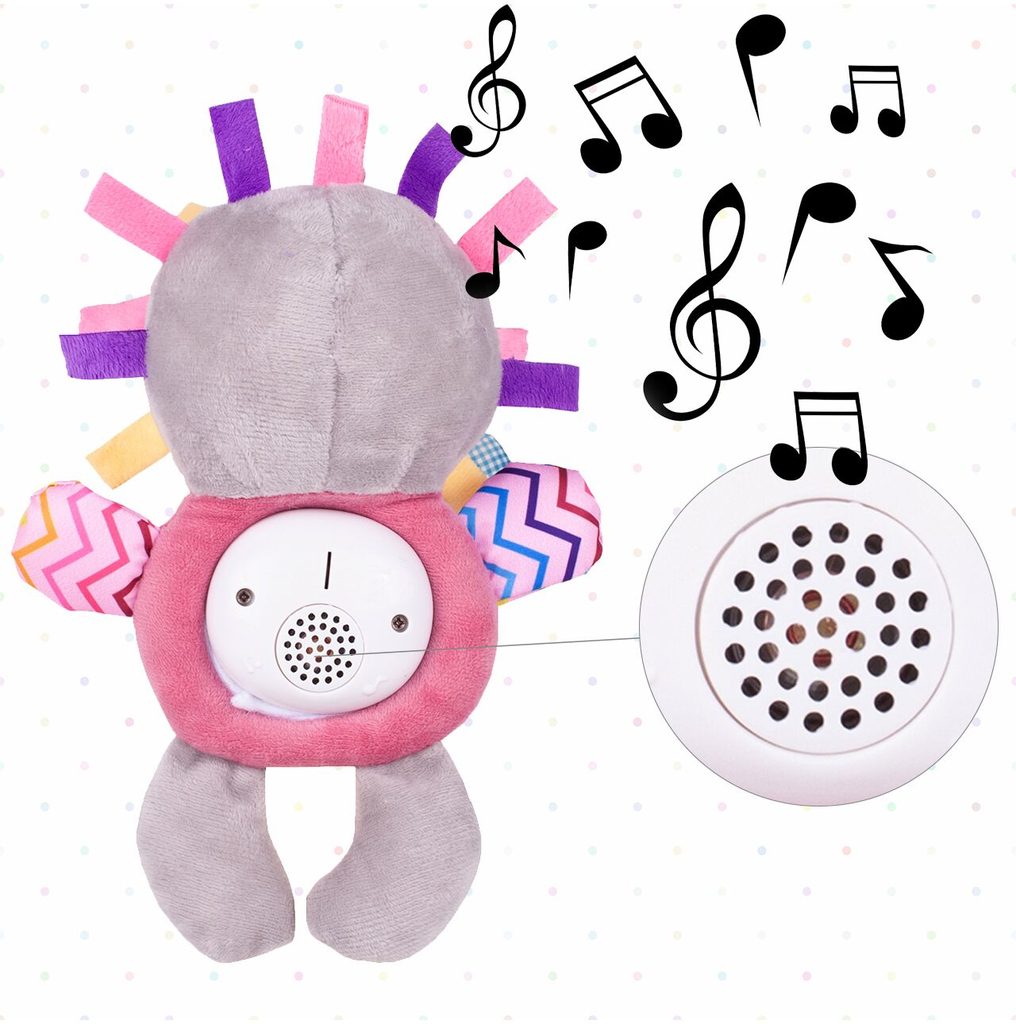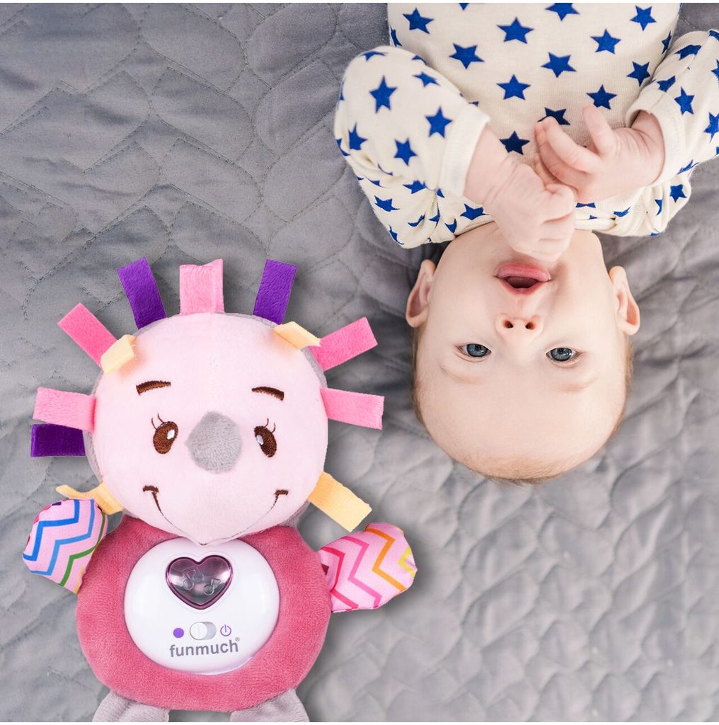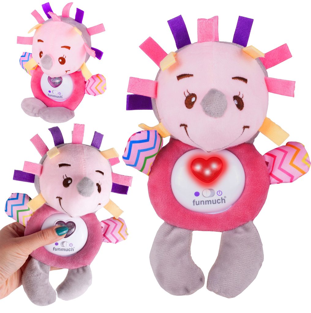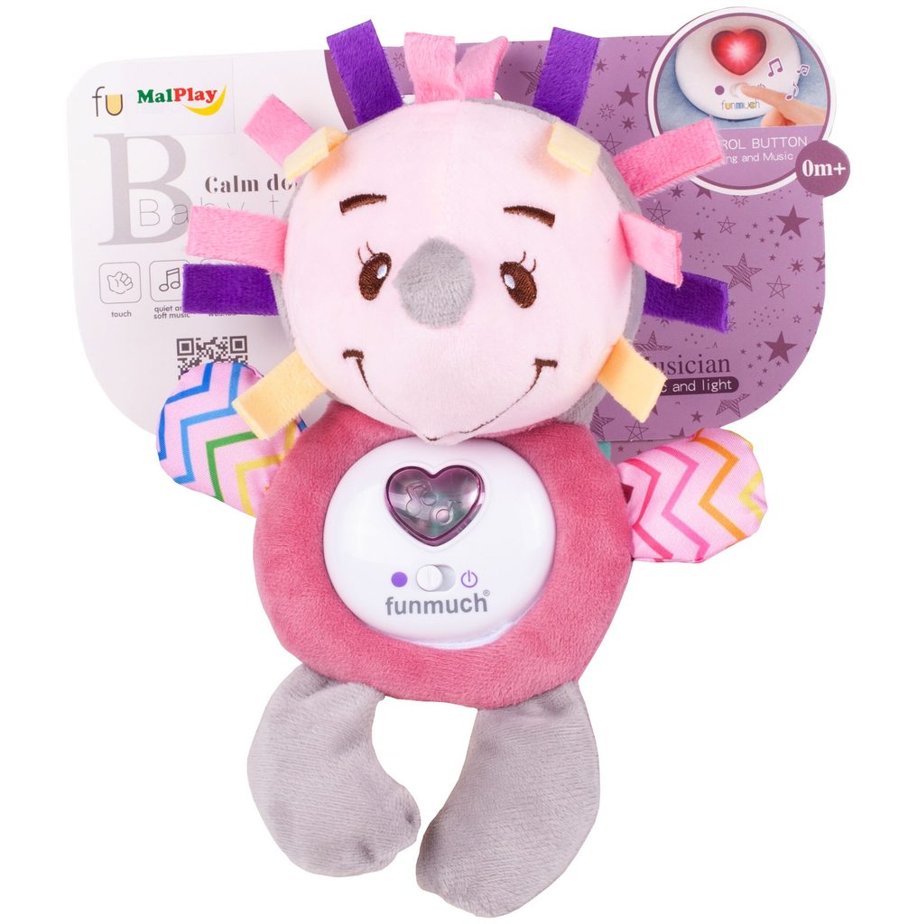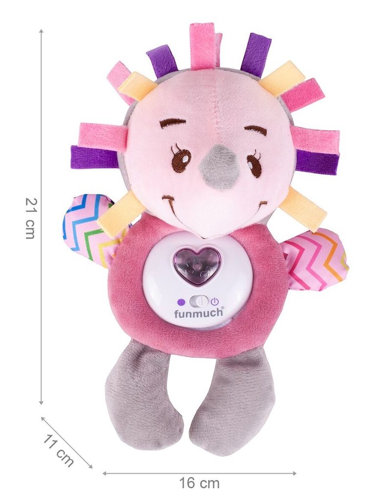 Interaktivní plyšový ježek Baby Calm je ideální hračkou pro ty nejmenší děti kdy jim pomůže snadno usnout. Je vyrobena z jemného na dotyk příjemného materiálu. Je vybavena různými písničkami, melodiemi a zvuky. Ty se přepínají zmáčknutím tlačítka ve tvaru srdíčka. To také během hry svítí. Hračka je určena pro děti od narození.