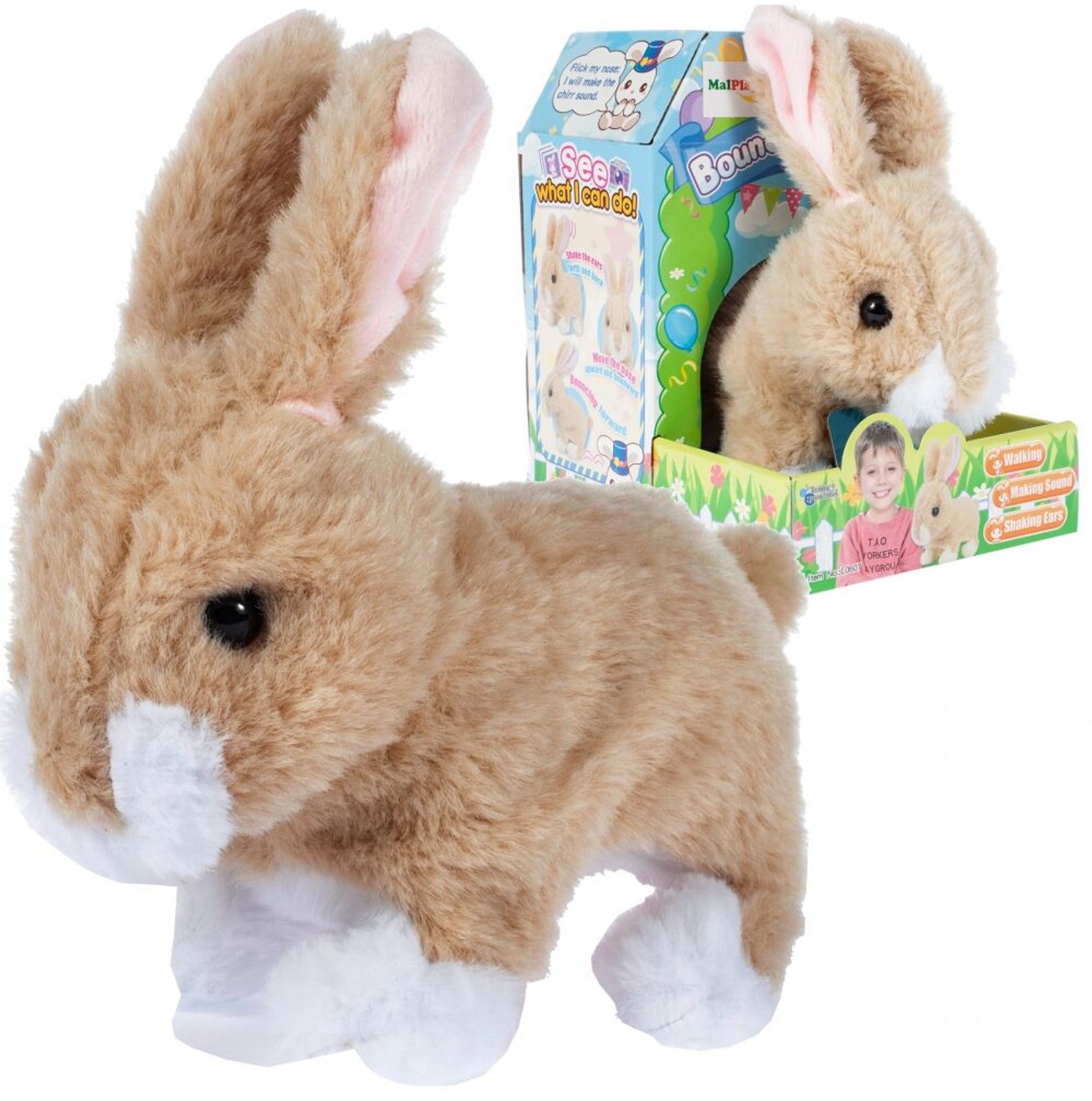 • po zapnutí skáče, hýbe oušky, nosem a vydává zvuky