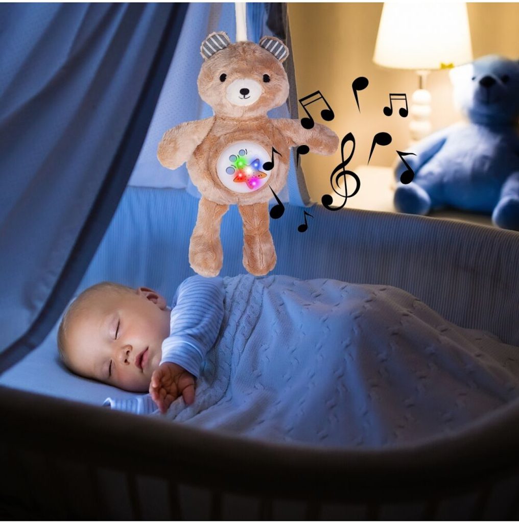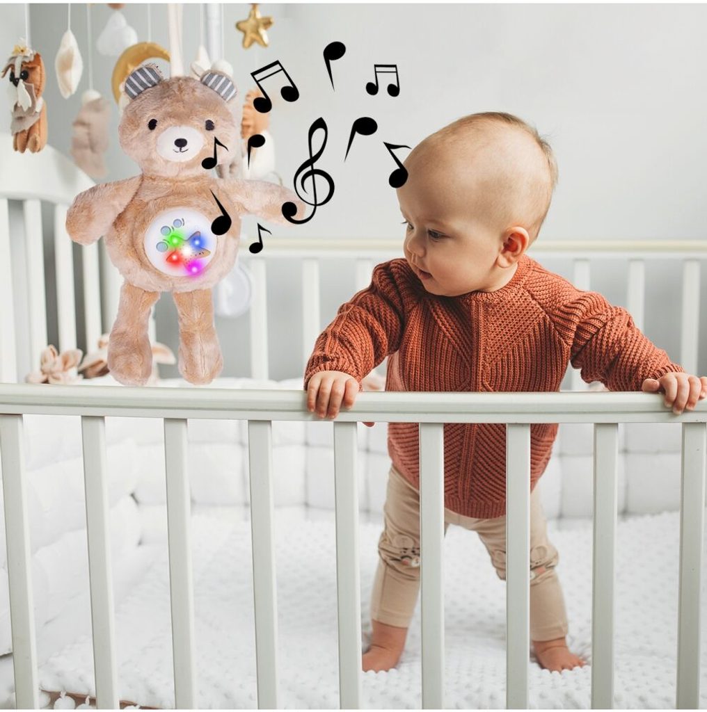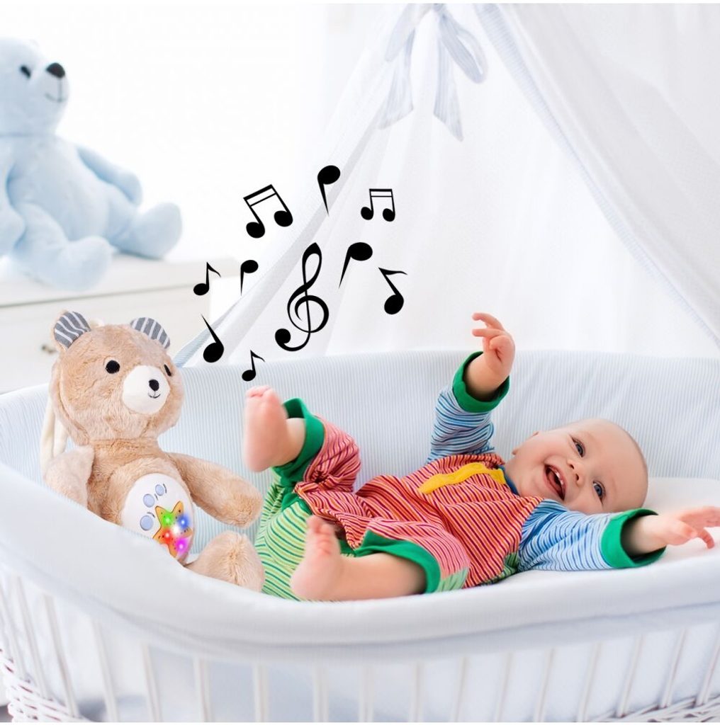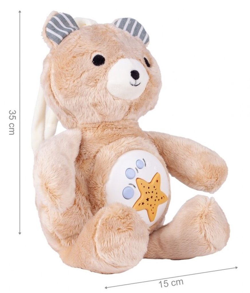 Plyšový medvídek Cuddle Bear se světelným a hudebním projektorem skrytým v bříšku je ideální hračkou pro ty nejmenší děti kdy jim pomůže snadno usnout. Měkké, jemné a příjemné na dotek vycpané zvíře s mechanismem skrytým v bříšku, díky kterému čas, který dítě tráví s maskotem, doprovází příjemná hudba a světelné efekty. Medvídek přehrává zvuky přírody. Je vybavený regulací hlasitosti a možností melodie vypnout. Hračka je určena pro děti od narození.