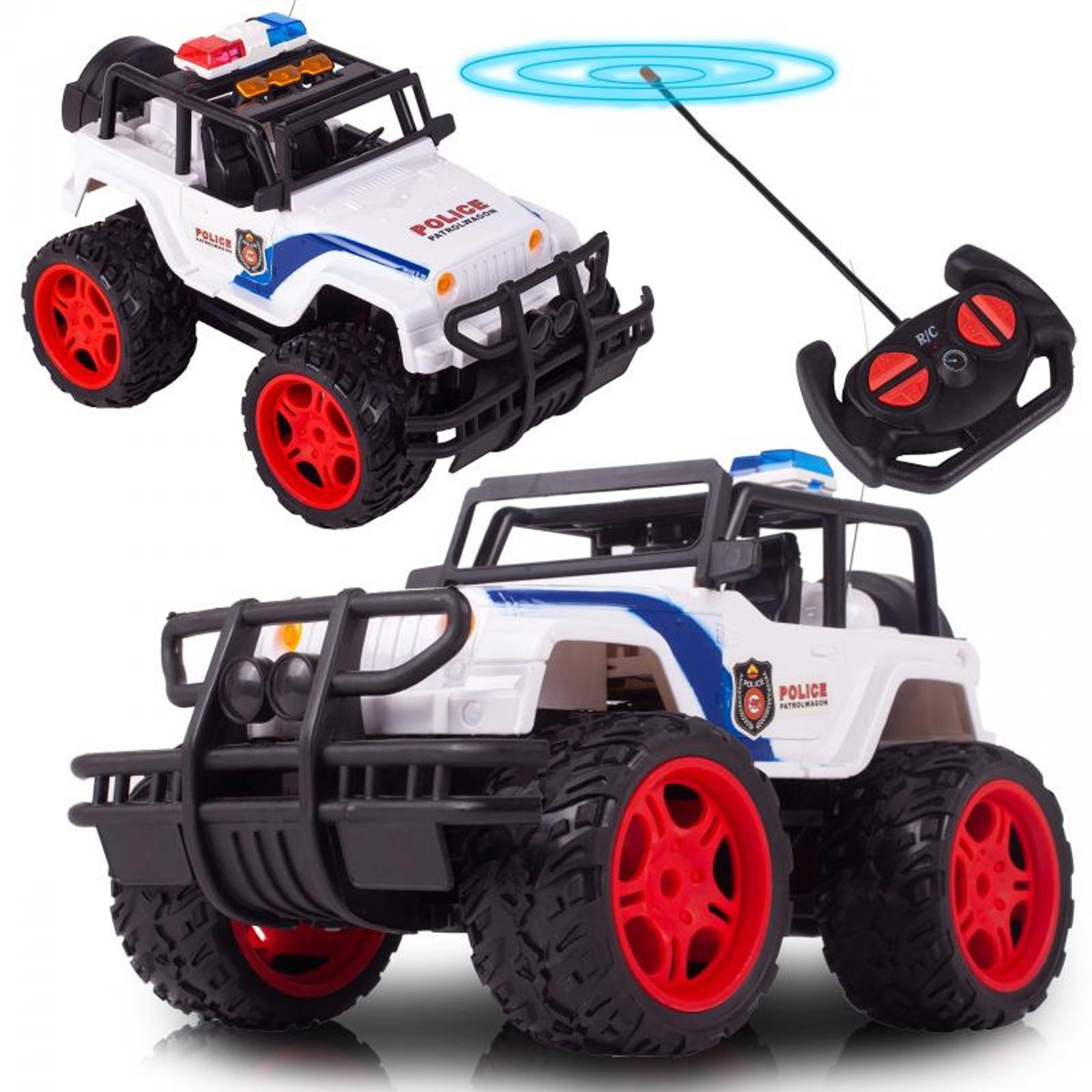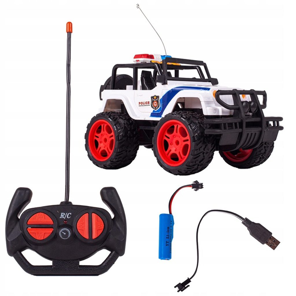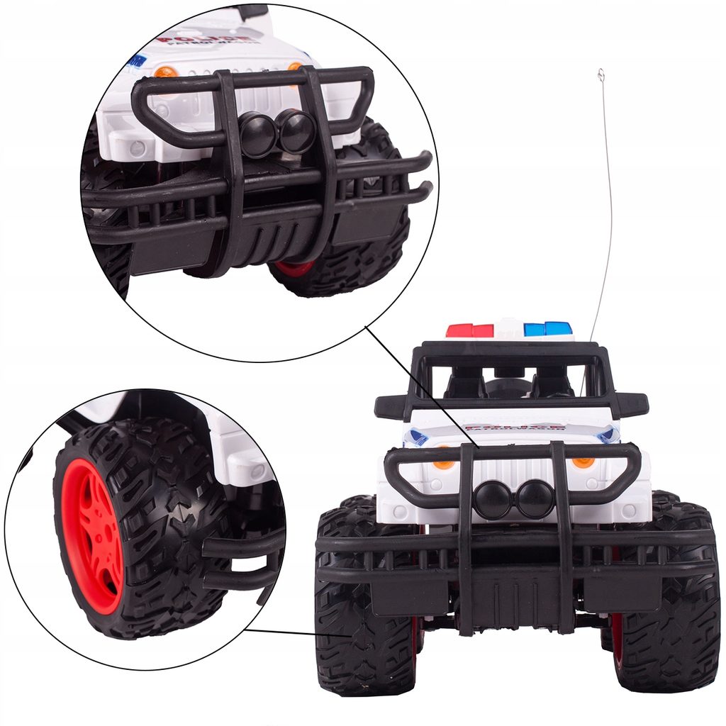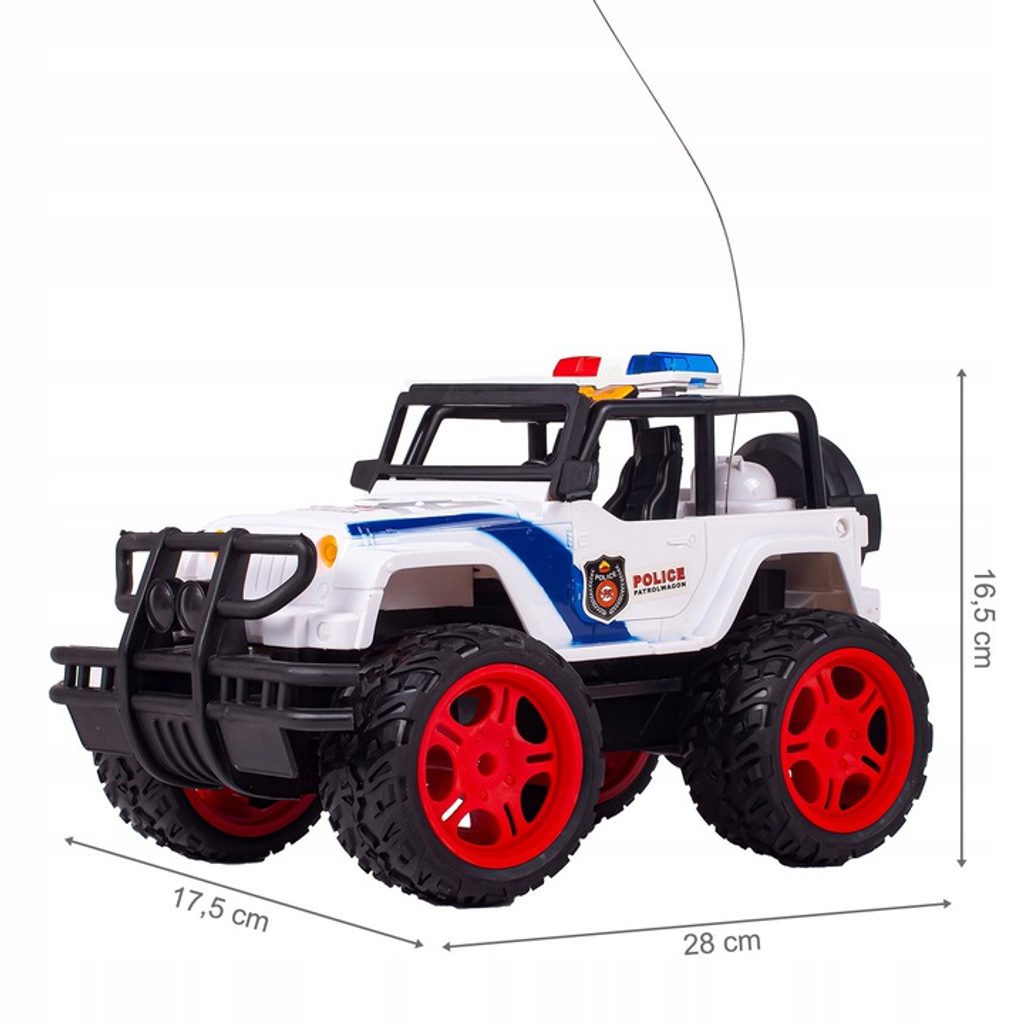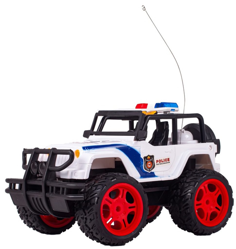 Policejní terénní autíčko Super Police Car s dálkovým ovládáním 27MHz v provedení policejního vozu umožnuje jízdu dopředu a dozadu, zatáčí doprava a doleva. Je vybaveno velkými gumovými koly o průměru 8 cm. Dveře auta jsou otevírací. Na střeše jsou umístěny imitace majáků. Součástí balení je dálkový ovladač se 4 tlačítky pro změnu směru jízdy a jízdu vpřed a vzad. Ovladač je napájen bateriemi, které nejsou součástí balení. Autíčko je vyrobeno z plastu a má certifikaci CE.
