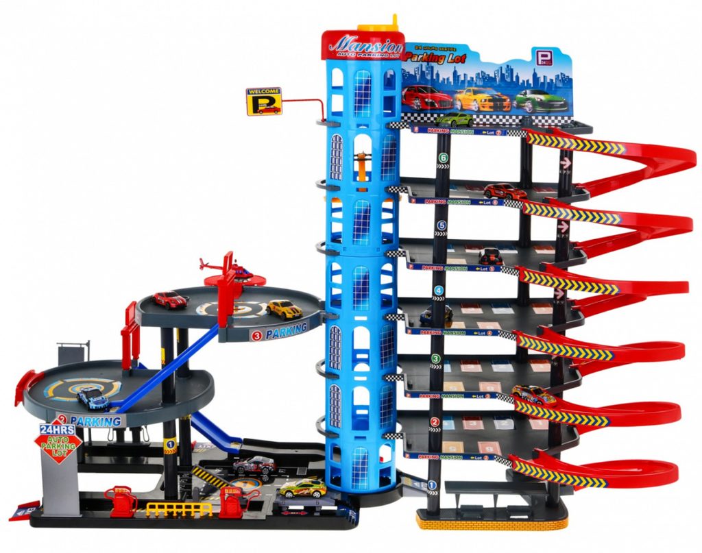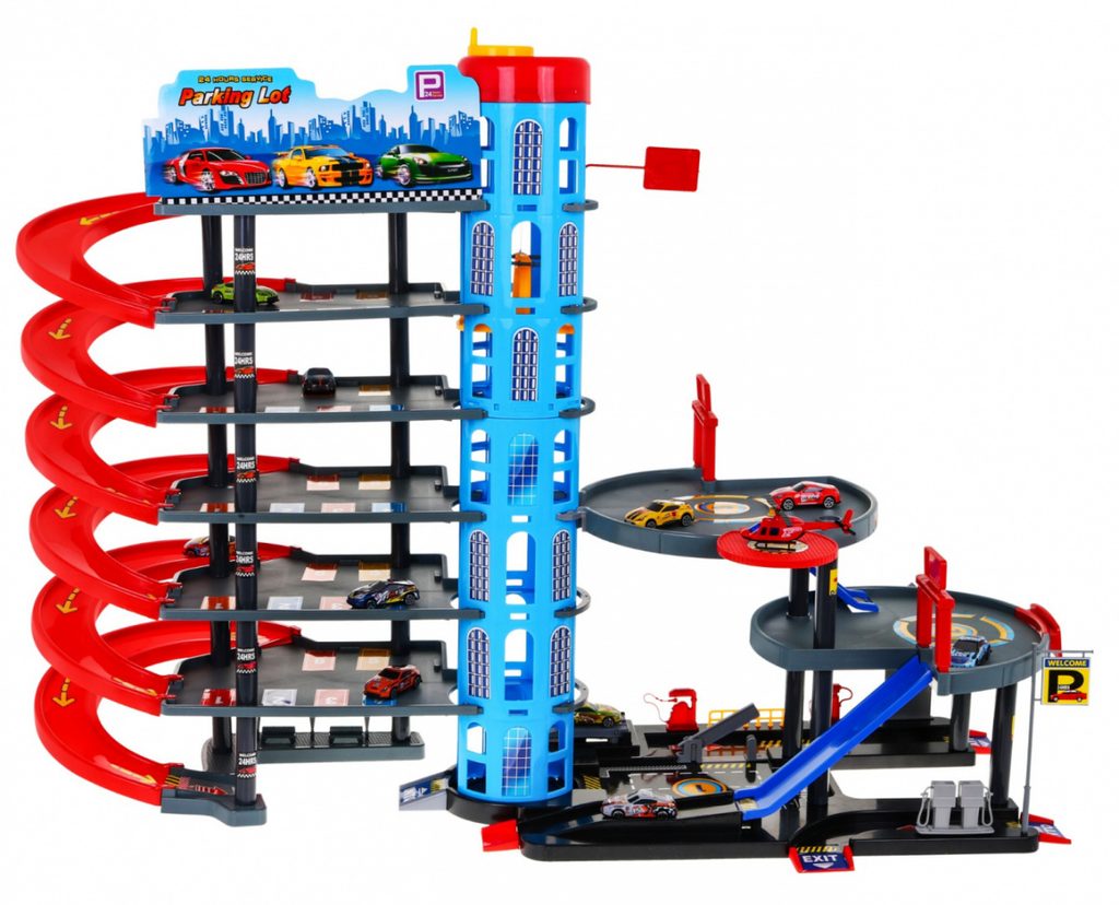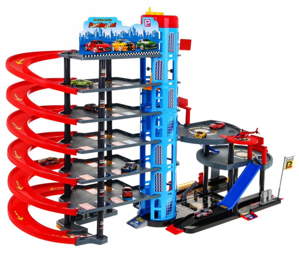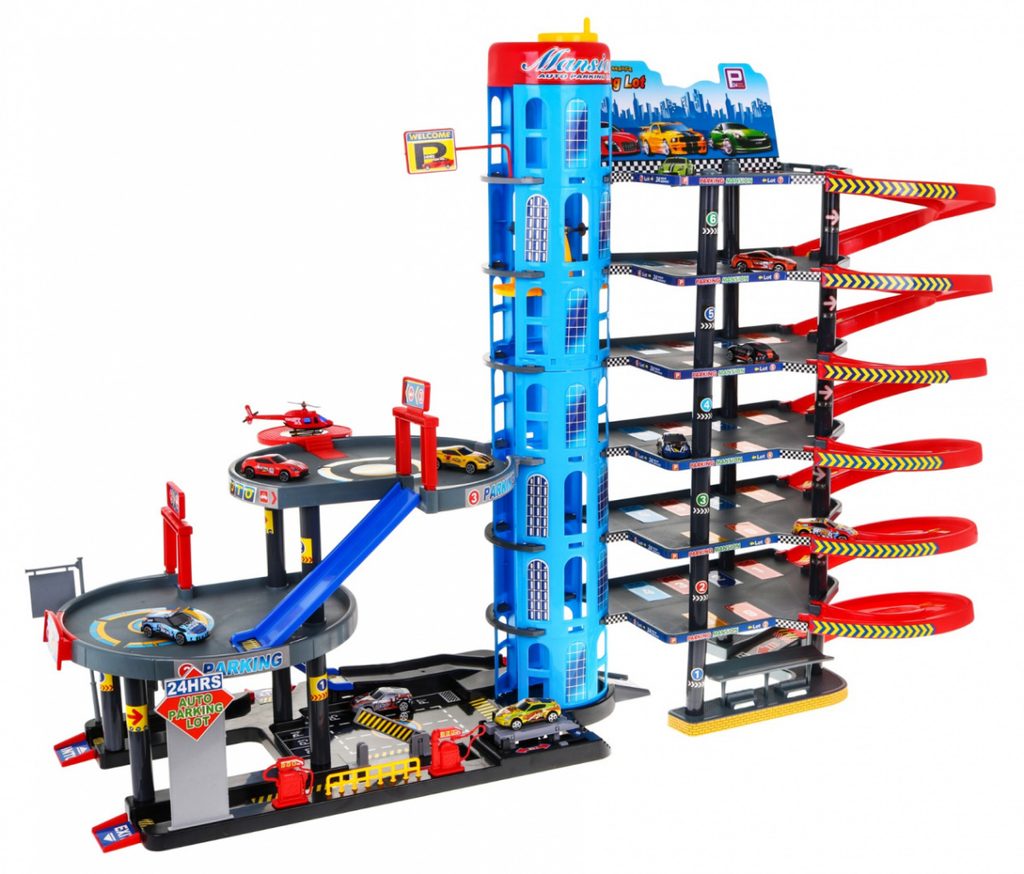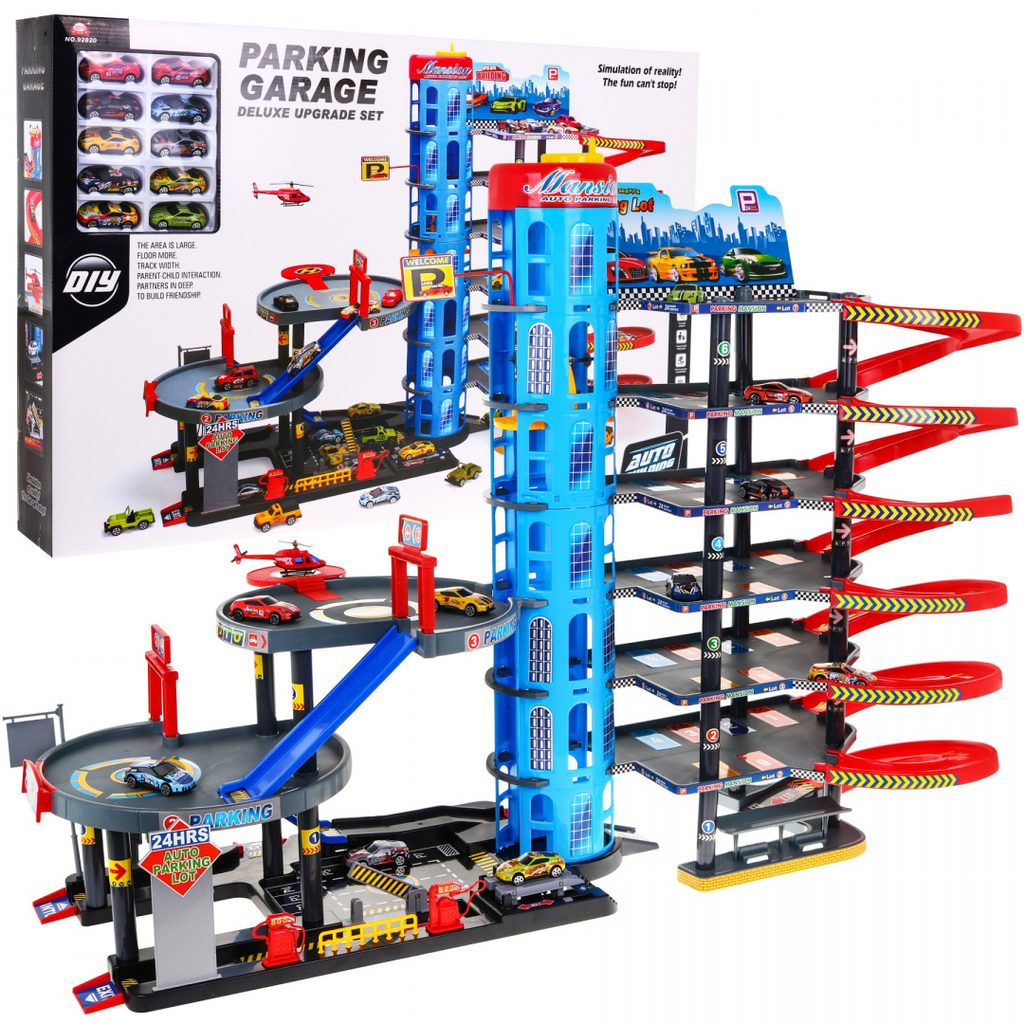 Dětská šestipatrová XXL garáž s 10 autíčky, helikoptérou a pohyblivým výtahem a příslušenstvím Mega Parking. Všechna podlaží jsou propojena sjížděcí dráhou a také pohyblivým výtahem. Ve spodní části parkoviště se nachází benzínová pumpa, vjezdy a závora. Mladý motoristický nadšenec zde nalezne vše co potřebuje. Je vyrobena z plastu bez ostrých hran a určena pro děti od 3 let.