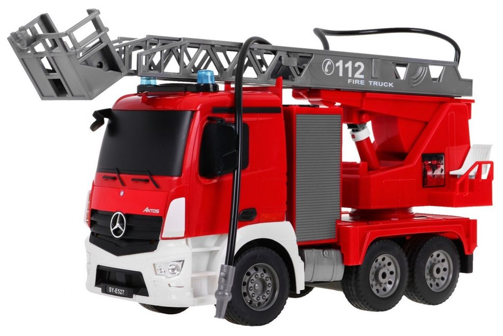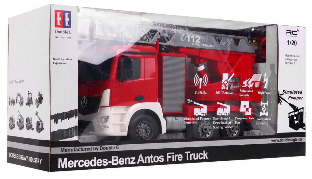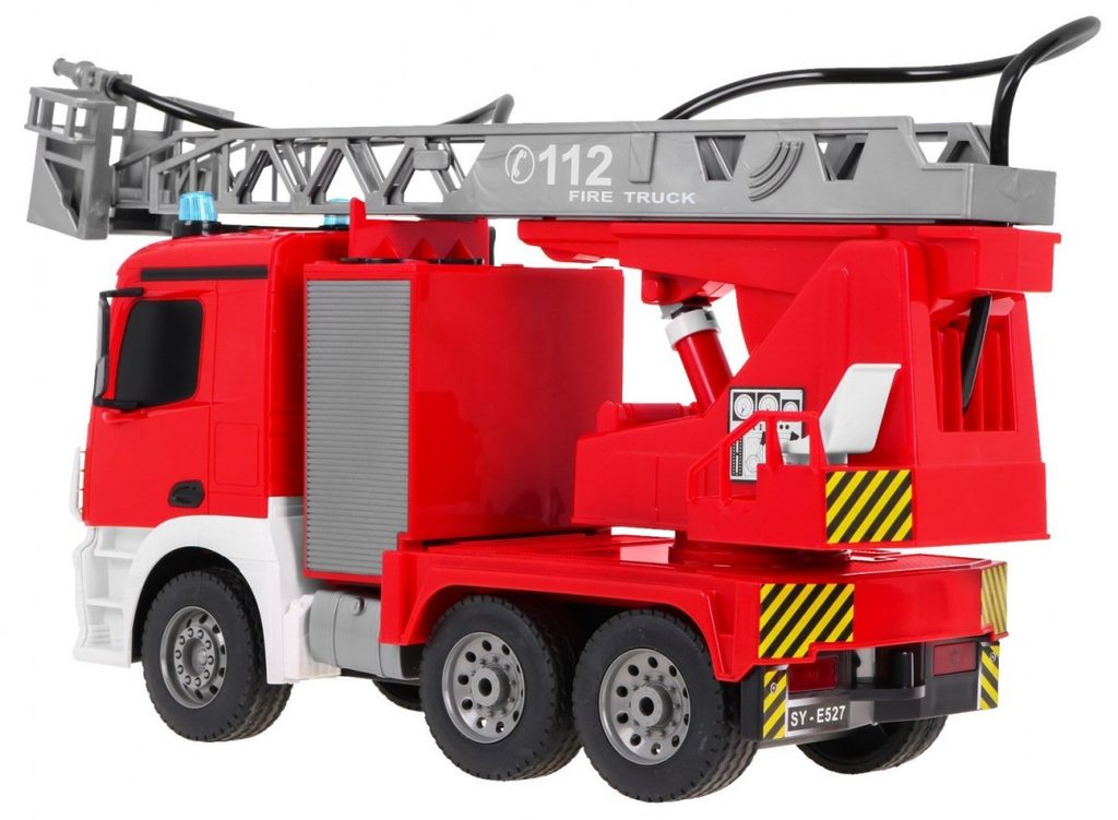 Požární auto na dálkové ovládání Mercedes-Benz Arocs s dálkovým ovládáním 2,4G umožnuje jízdu dopředu a dozadu, má otáčecí gumová kola doprava a doleva, výsuvný žebřík. Ve výbavě jsou také přední a zadní světla, zvukové efekty, tlumiče nárazů, zásobník na vodu a požární hadice. Ovládání je velmi jednoduché pomocí ovladače se 2 joysticky a 7 tlačítky. Součástí balení je akumulátor a USB nabíječka. Dálkové ovládání je napájeno bateriemi, které nejsou součástí balení. Auto je vyrobeno z plastu a má certifikaci CE.