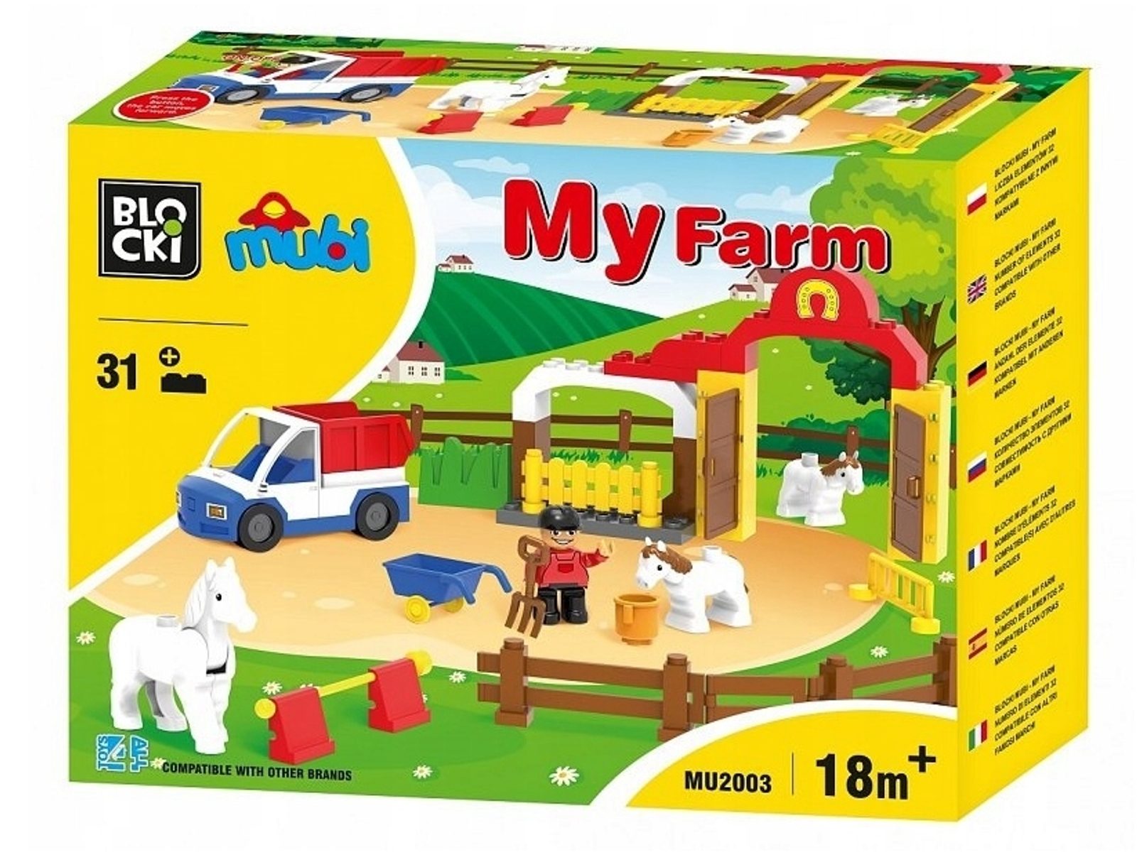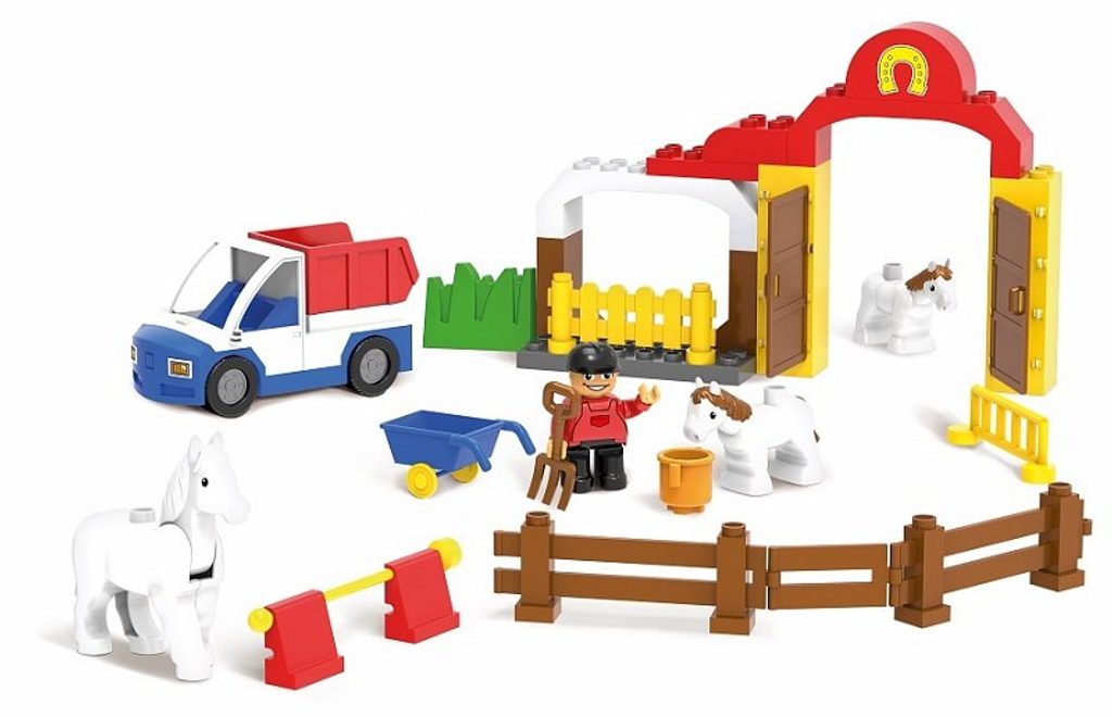 Stavebnice Blocki Mubi Farma s koníky udělá z Vašeho dítěte pravého farmáře nebo farmářku. Budova farmy s příslušenstvím v nádherném barevném provedení. Součástí stavebnice jsou celkem 3 figurky: farmář a 2 koníci a také automobil. Stavebnice zaručí dětem mnoho hodin zábavy, pomůže jim rozvíjet kreativitu, manuální dovednosti a zlepšuje logické myšlení. Stavebnice je kompatibilní se stavebnicemi ostatních světových značek jako je Lego Duplo a další. Všechny dílky stavebnice se velmi snadno propojují a jsou vyrobeny z kvalitního plastu. Tato stavebnice je určena pro děti od 3 let věku.
