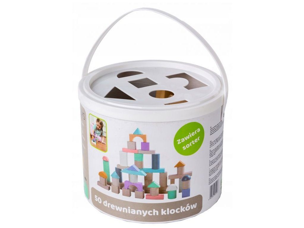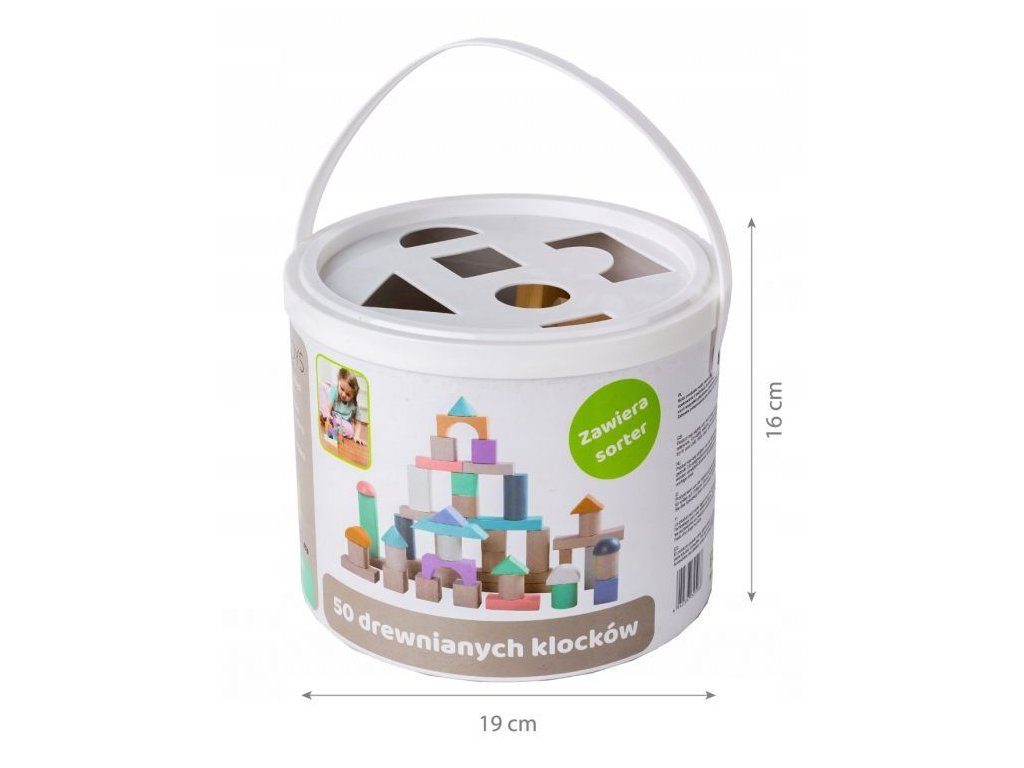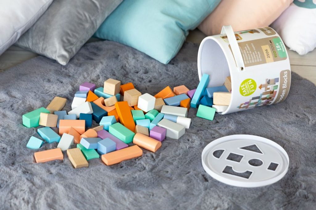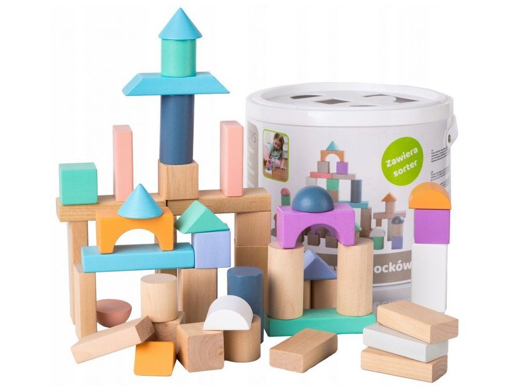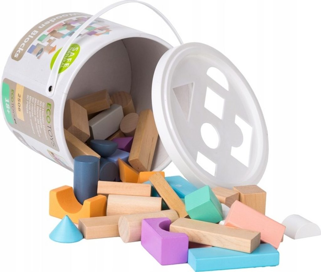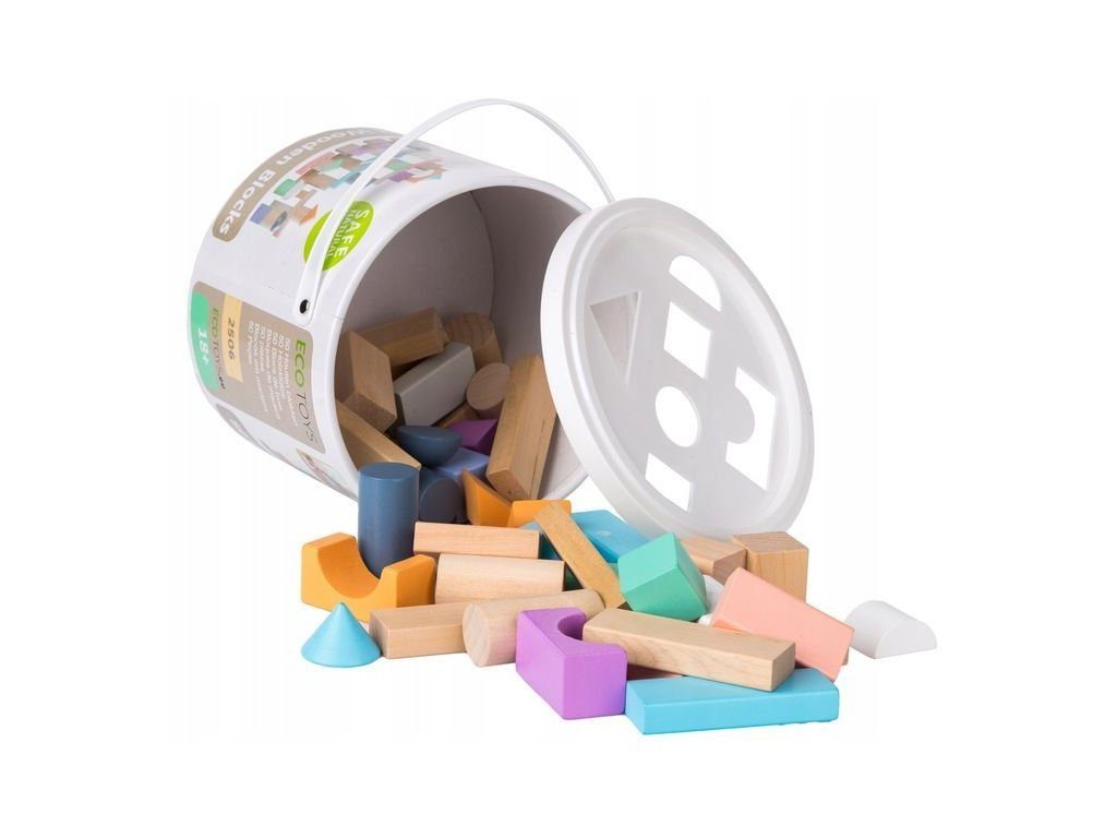 Ecotoys sada barevných dřevěných kostek v praktickém boxu. Horní plastová část má vhazovací otvory, takže dítě může po skončení hry kostky zábavným způsobem vrátit zpět do boxu. Všechny kostky mají zaoblené hrany a jsou vyrobeny pouze z kvalitního dřeva. Hra s nimi podporuje u dětí představivost a motoriku. Hračka je určena pro děti od 18 měsíců věku.