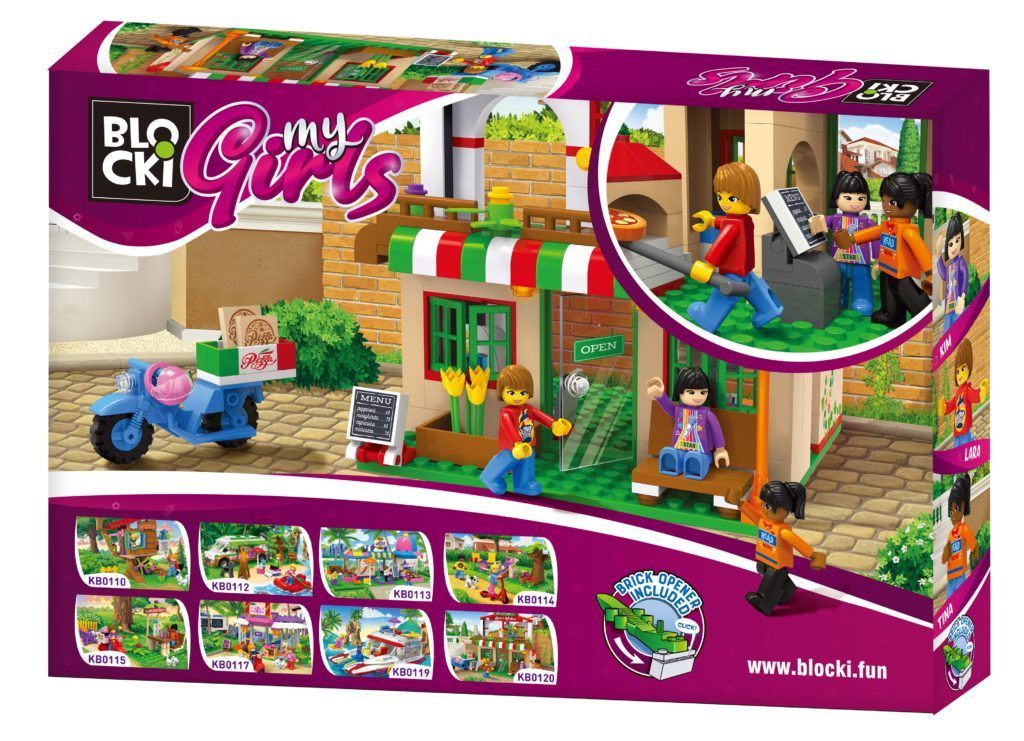 Stavebnice Blocki MyGirls pizzerie umožní Vašemu dítěti stát se majitelem restaurace. Kompletně vybavená jachta se skládá z 364 dílků a součástí jsou také 3 figurky holčiček - Lara, Kim a Tiny Stavebnice zaručí dětem mnoho hodin zábavy, pomůže jim rozvíjet kreativitu, manuální dovednosti a zlepšuje logické myšlení. Stavebnice je kompatibilní se stavebnicemi ostatních světových značek jako je Lego, Sluban a další. Všechny dílky stavebnice se velmi snadno propojují a jsou vyrobeny z kvalitního plastu.