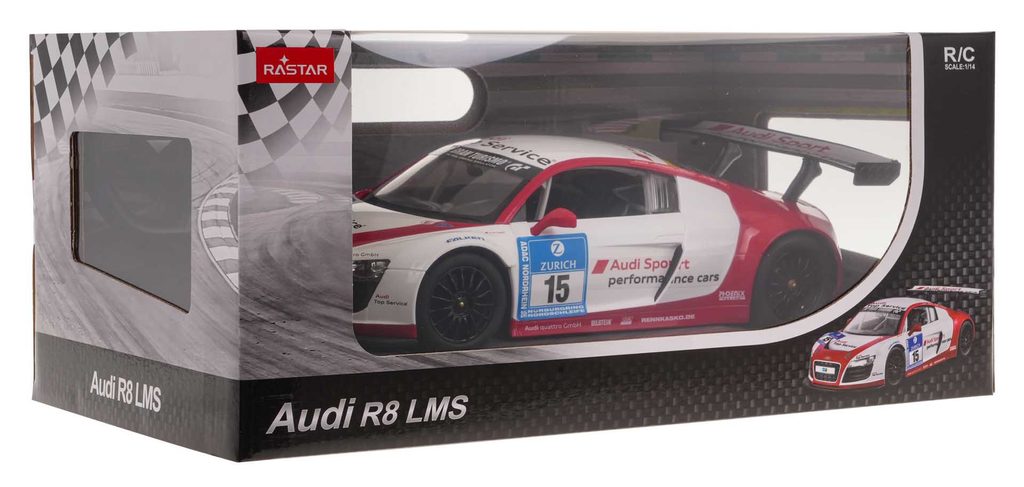 Rastar auto na dálkové ovládání Audi R8 LMS Performance s dálkovým ovládáním 2,4 GHz umožňuje jízdu dopředu a dozadu, zatáčí doprava a doleva. Je osazeno gumovými koly s velmi dobrou přilnavostí a je vybaveno tlumiči nárazů. Je vybaveno předním a zadním LED osvětlením. Dálkové ovládání i autíčko jsou napájeny bateriemi, které nejsou součástí balení. Autíčko je vyrobeno z odolného plastu a má certifikaci CE.