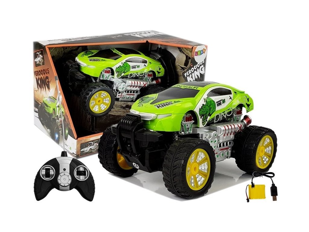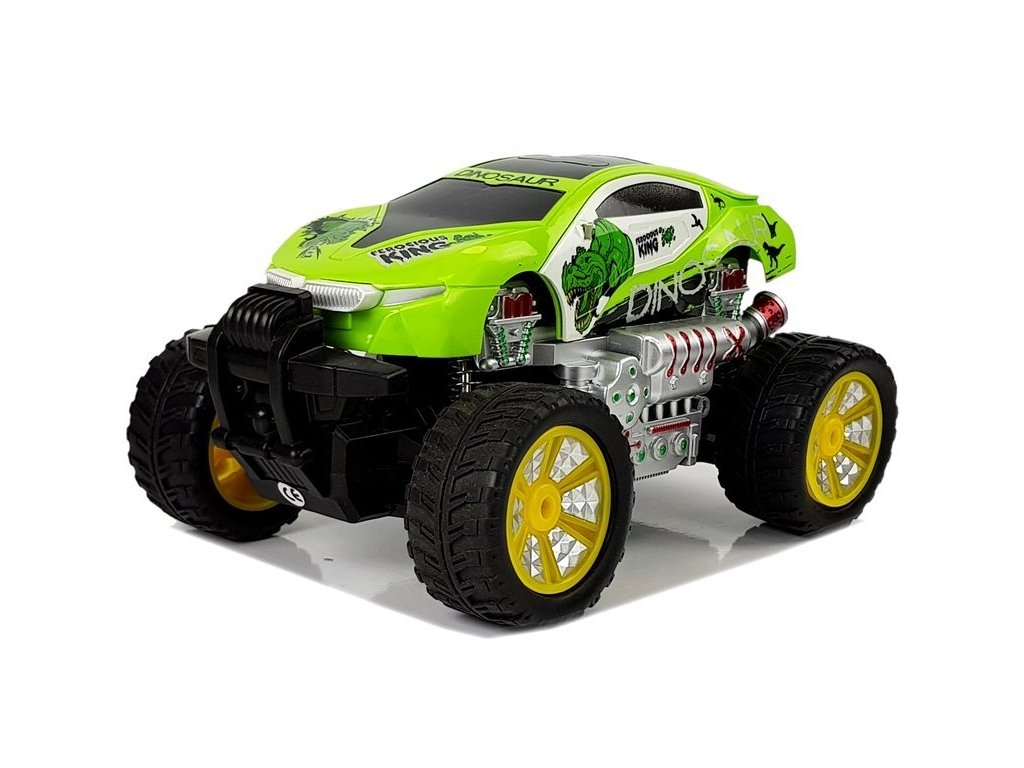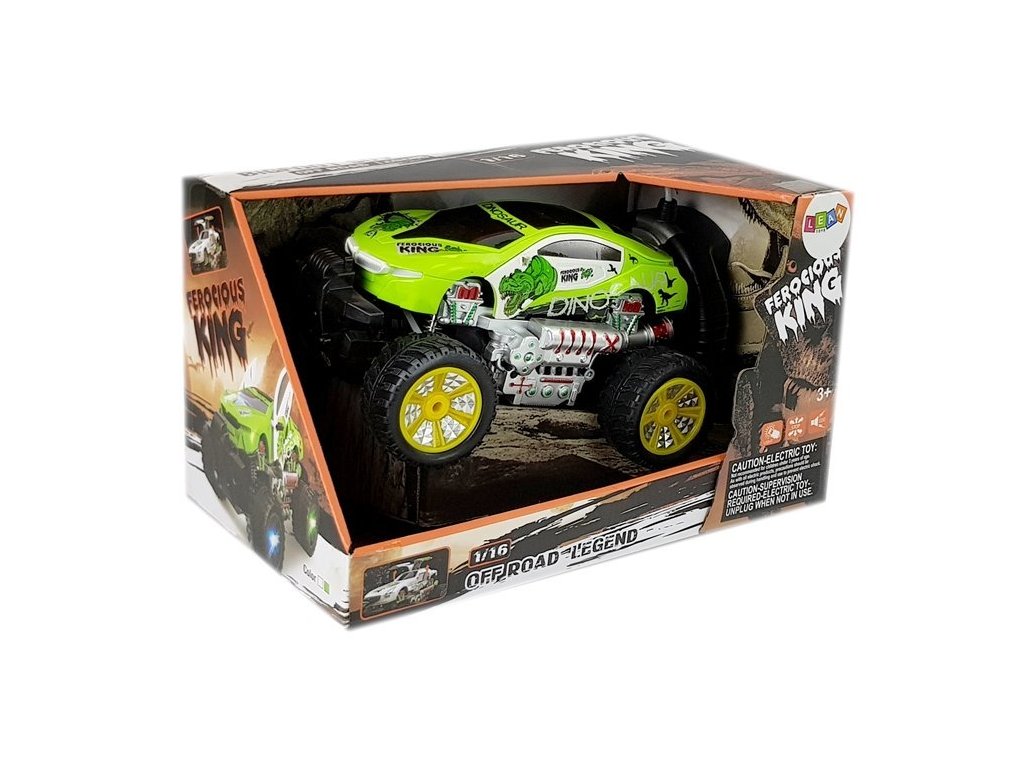 Off-road autíčko Dinosaurus s dálkovým ovládáním 2,4G se zvýšeným podvozkem umožnuje jízdu dopředu a dozadu, zatáčí doprava a doleva. Je osazeno gumovými koly s velmi dobrou přilnavostí a je vybaveno silnými tlumiči nárazů. Během svítí přední světla. Součástí balení je baterie napájení autíčka a dálkový ovladač se 2 páčkami pro ovládání jízdy. Dálkové ovládání je napájeno bateriemi, které nejsou součástí balení. Autíčko je vyrobeno z odolného plastu a má certifikaci CE.