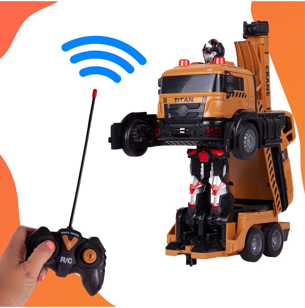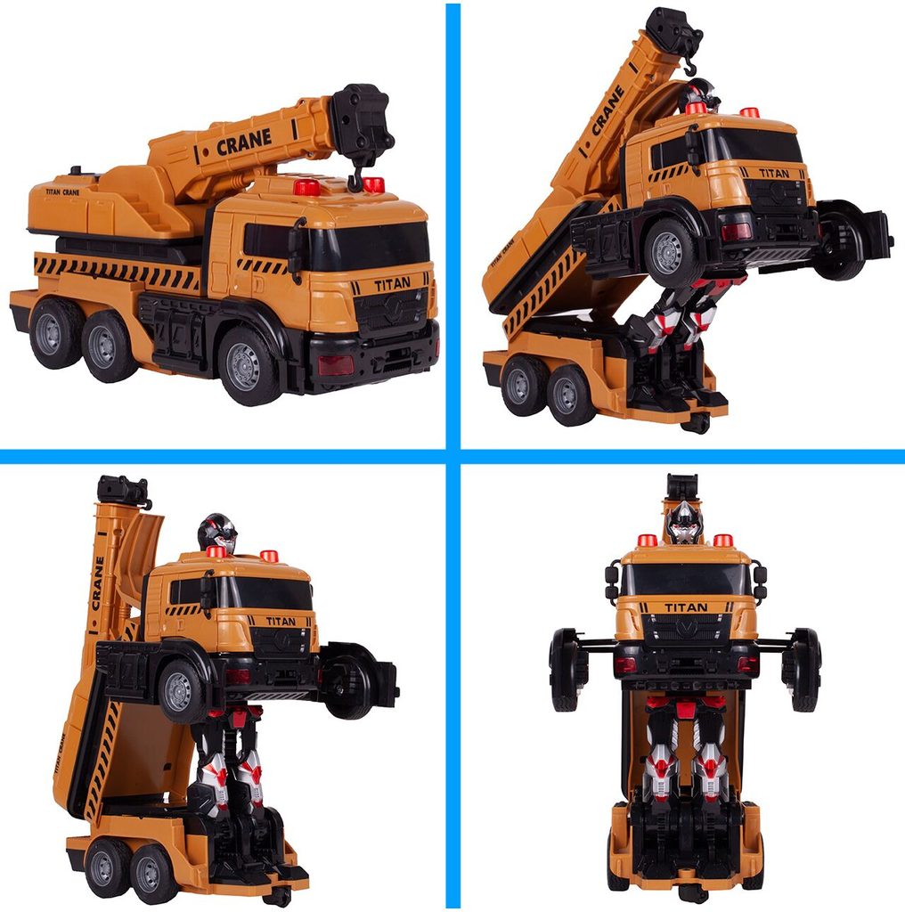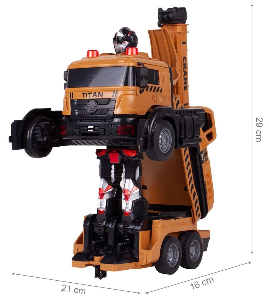 Dálkově ovládaný robot - transformer Titan je perfektní hračka pro děti, které mají rády technologické novinky. Lze ho využít jako robot nebo snadno přeměnit na jeřáb. Je vybaven pohonem na přední kola, dálkovým ovládáním 40 MHz, světelnými a zvukovými efekty. Autíčko má zabudovaný 4,8V akumulátor, který snadno nabijete přiloženou USB nabíječkou. Hračka je určena pro děti od 6 let věku.