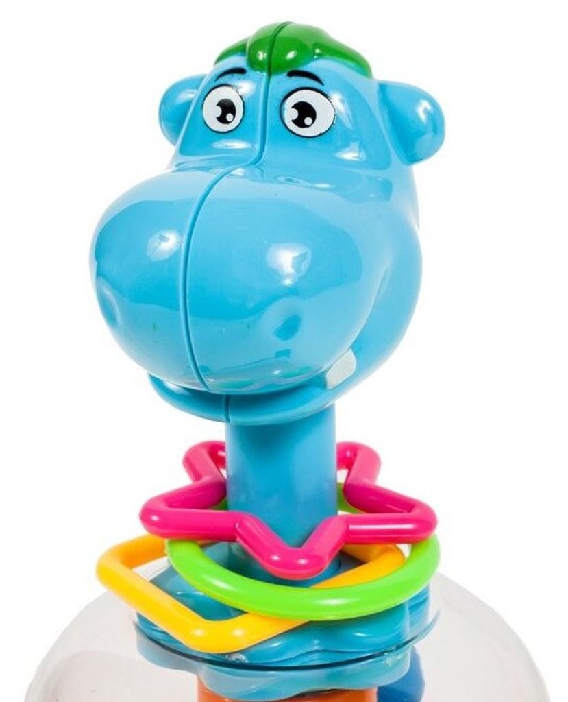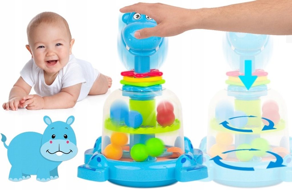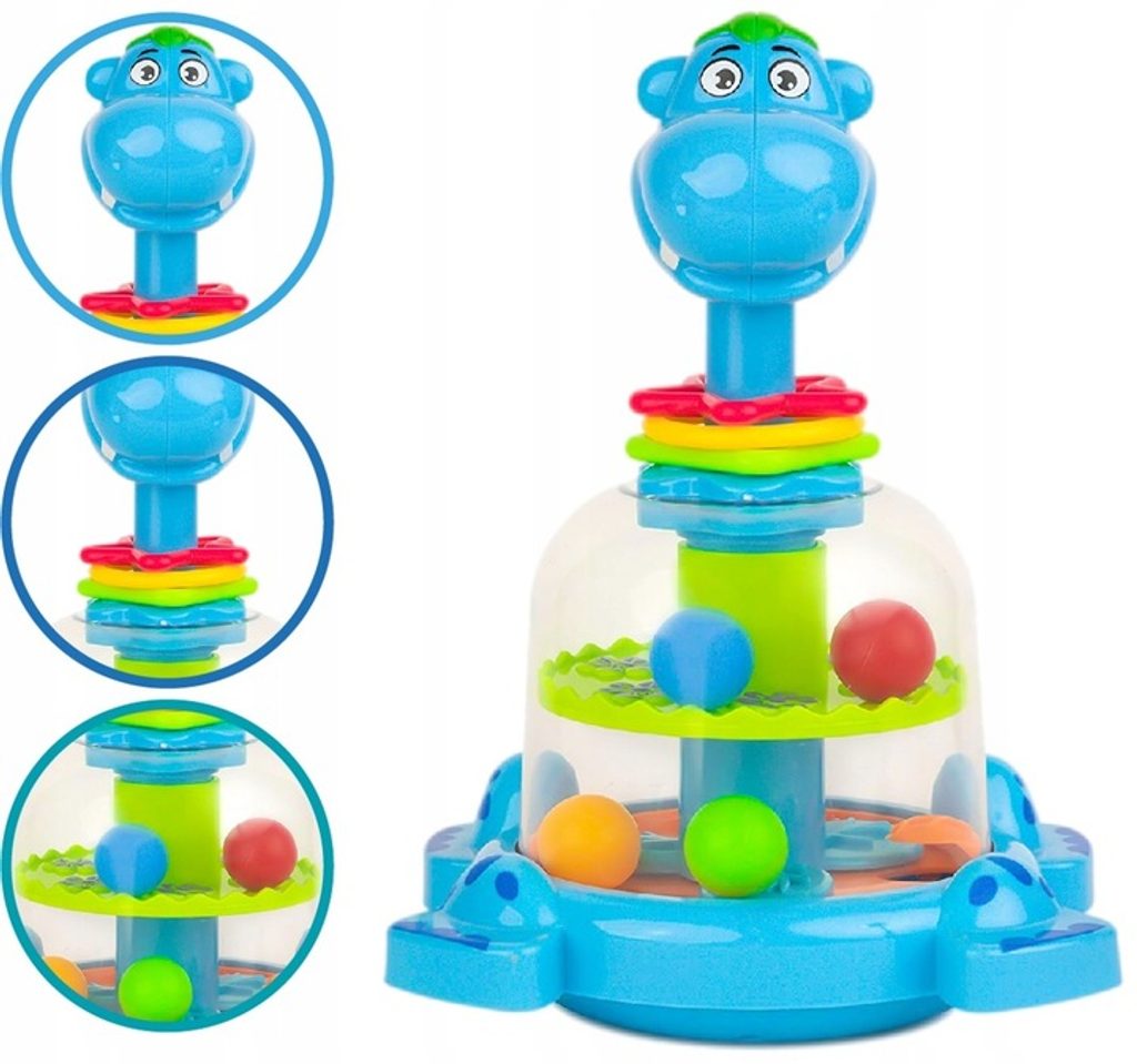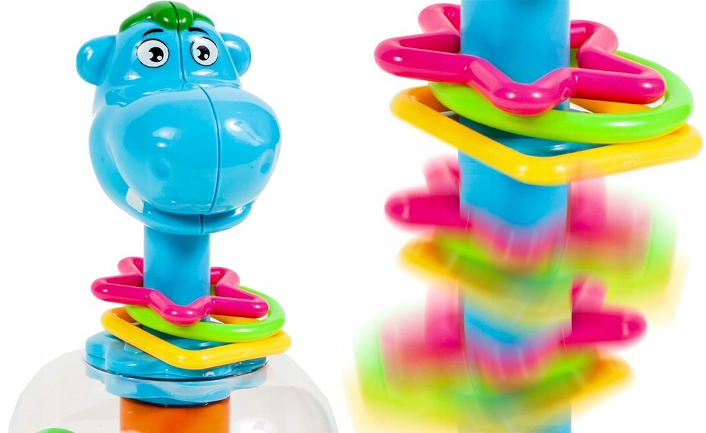 Rotující hračka Hippo Spinner je ideální hračkou pro ty nejmenší děti kdy jim pomůže rozvíjet logické myšlení, rozpoznávání barev a tvarů a také motorickou koordinaci. Zmáčknutím hlavy hrocha se roztočí kruh uvnitř hračky, rozpohybuje kuličky a ta začnou padat do předem určených míst. Na krku hrocha jsou potom umístěny obruče ve tvaru kruhu, čtverce a hvězdy. Hračka je určena pro děti od 12 měsíců věku.