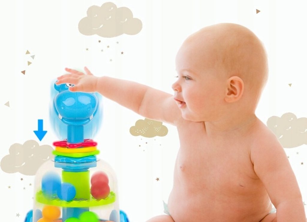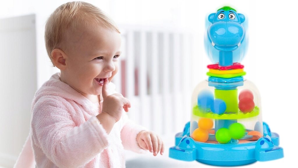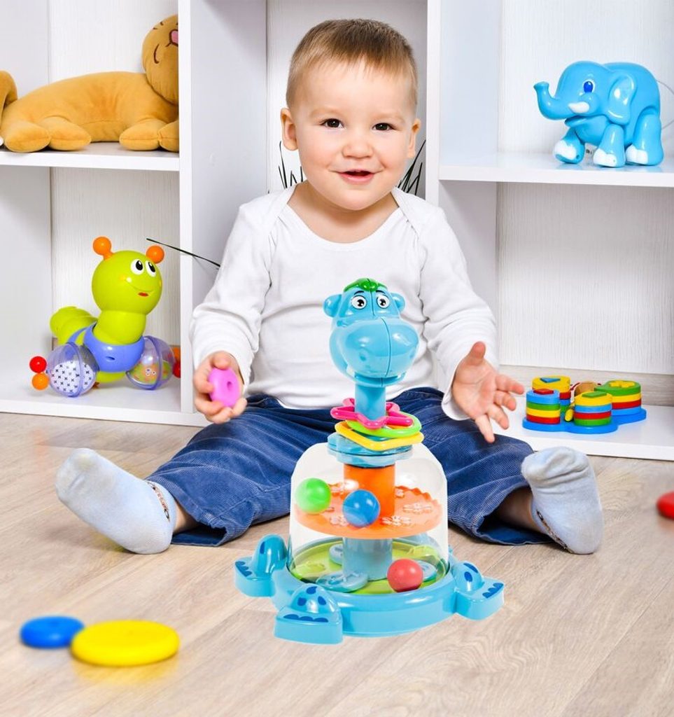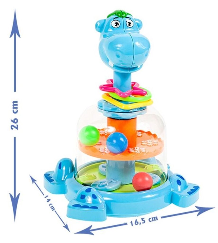 Rotující hračka Hippo Spinner je ideální hračkou pro ty nejmenší děti kdy jim pomůže rozvíjet logické myšlení, rozpoznávání barev a tvarů a také motorickou koordinaci. Zmáčknutím hlavy hrocha se roztočí kruh uvnitř hračky, rozpohybuje kuličky a ta začnou padat do předem určených míst. Na krku hrocha jsou potom umístěny obruče ve tvaru kruhu, čtverce a hvězdy. Hračka je určena pro děti od 12 měsíců věku.