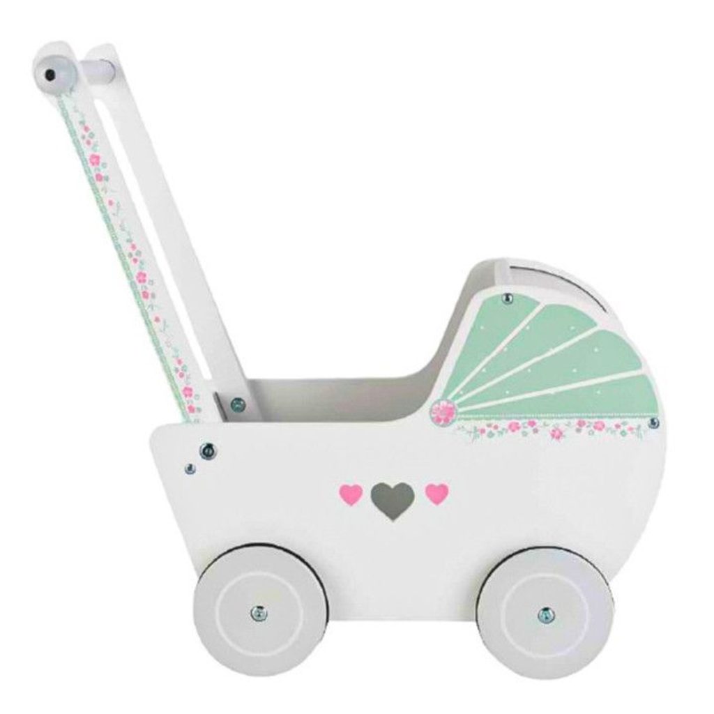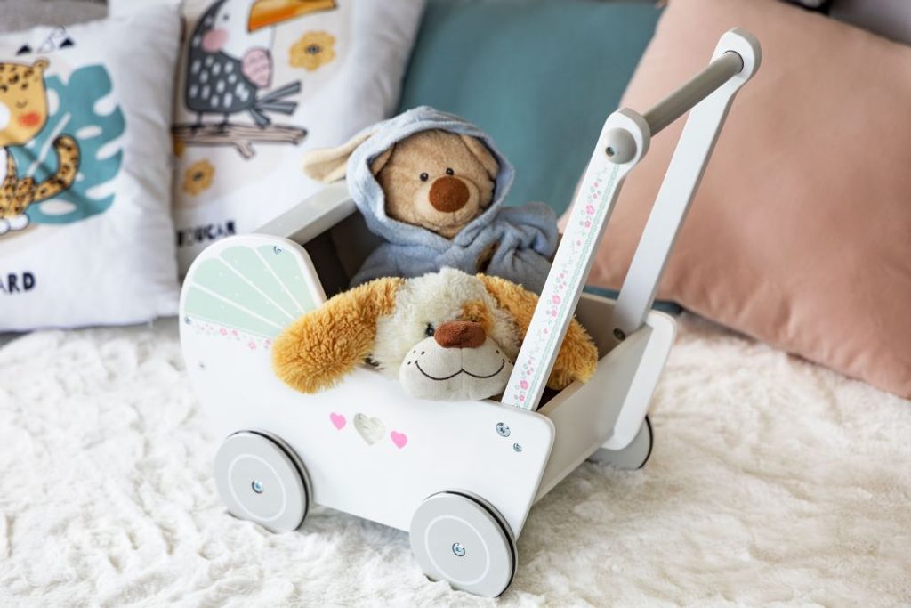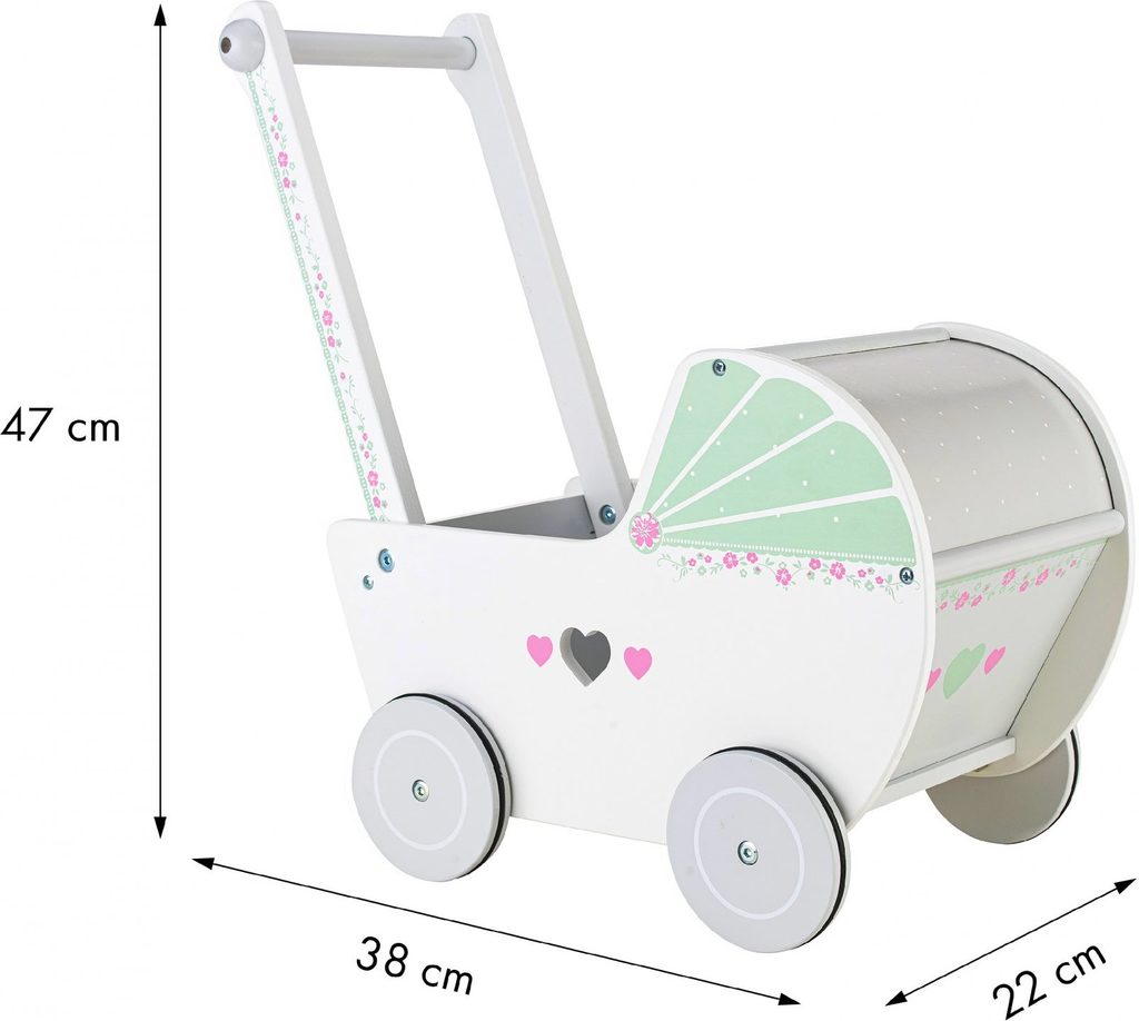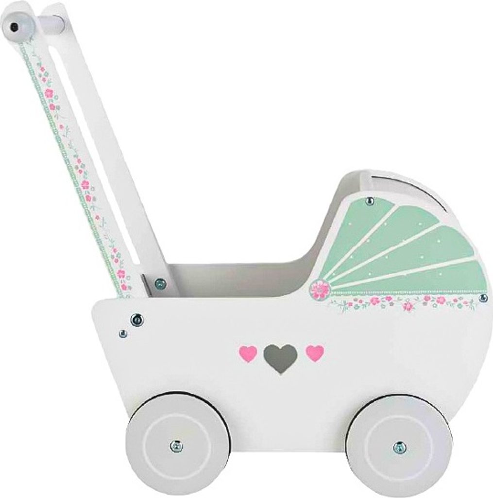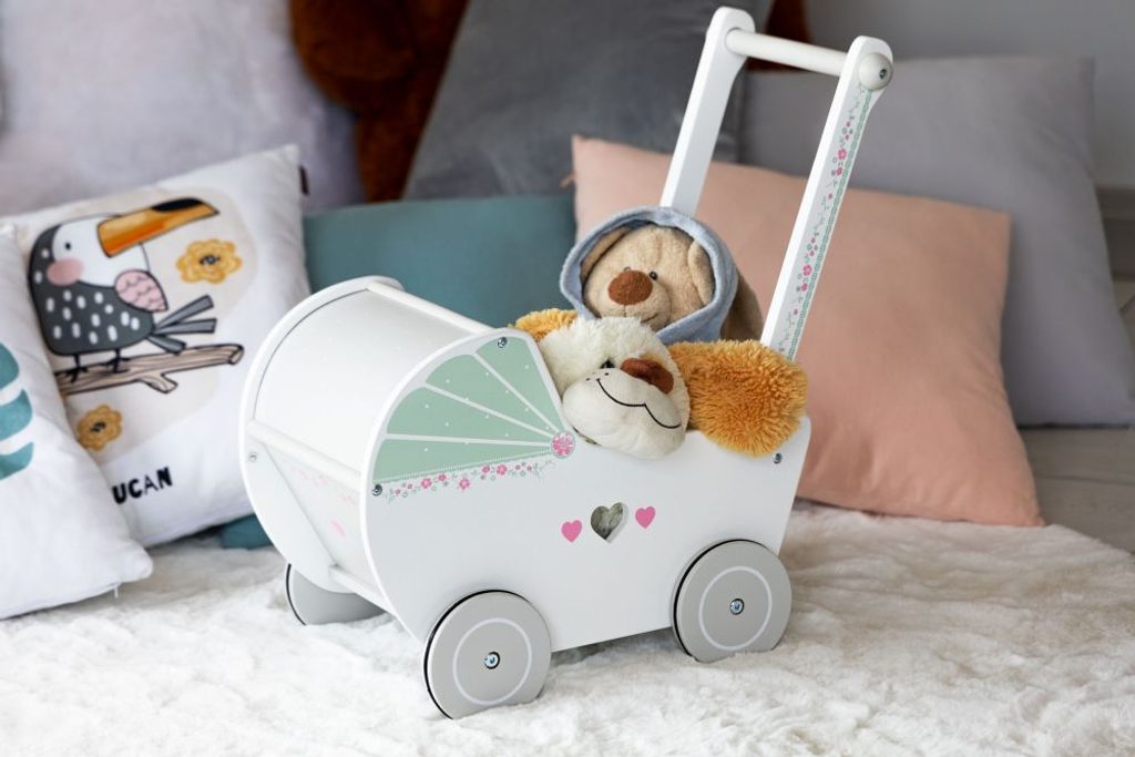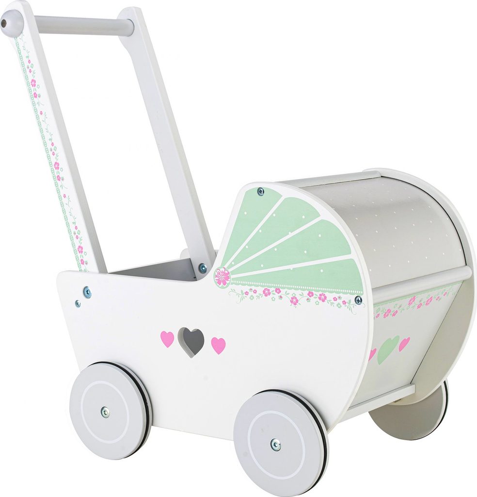 Dětské dřevěné chodítko  Ecotoys ve tvaru kočárku pro panenky je ideální hračkou pro děti již od 12 měsíců věku. Pro menší děti slouží jako chodítko kdy rukojeť je v takové výšce, že dítěti umožňuje vozíček tlačit a zároveň udržovat rovnováhu. Pro větší děti slouží jako kočárek pro panenku nebo v něm může vozit hračky. Kolečka mají protiskluzovou úpravu, proto je kočárek vhodný pro hru doma i venku. Přední roletka se dá odejmout. Vše je vyrobeno ze dřeva tak, že vozítko nemá žádné ostré hrany a je pro dítě absolutně bezpečné.