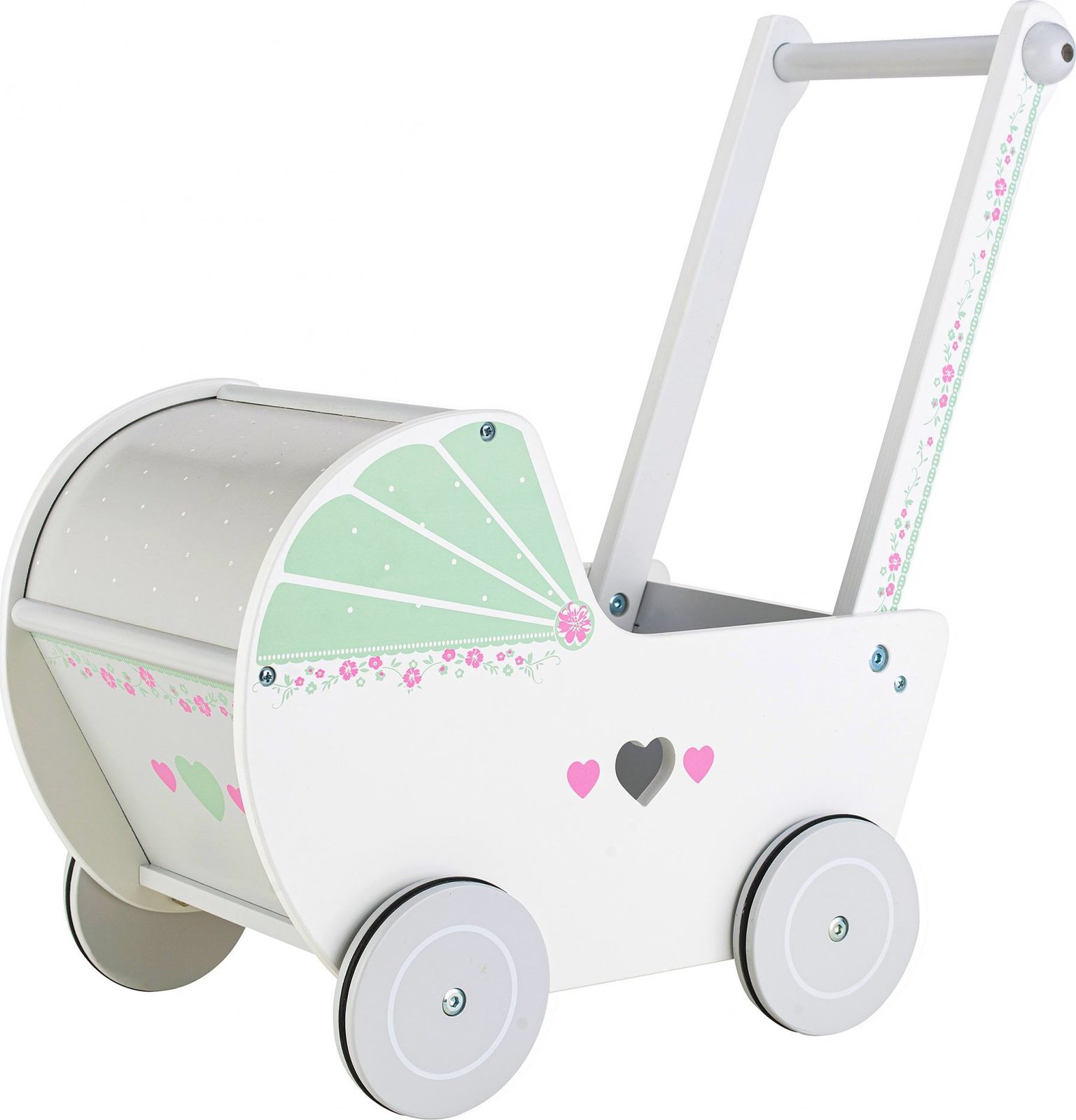 ROZBALENO Ecotoys dětské dřevěné chodítko kočárek se srdíčky bílý