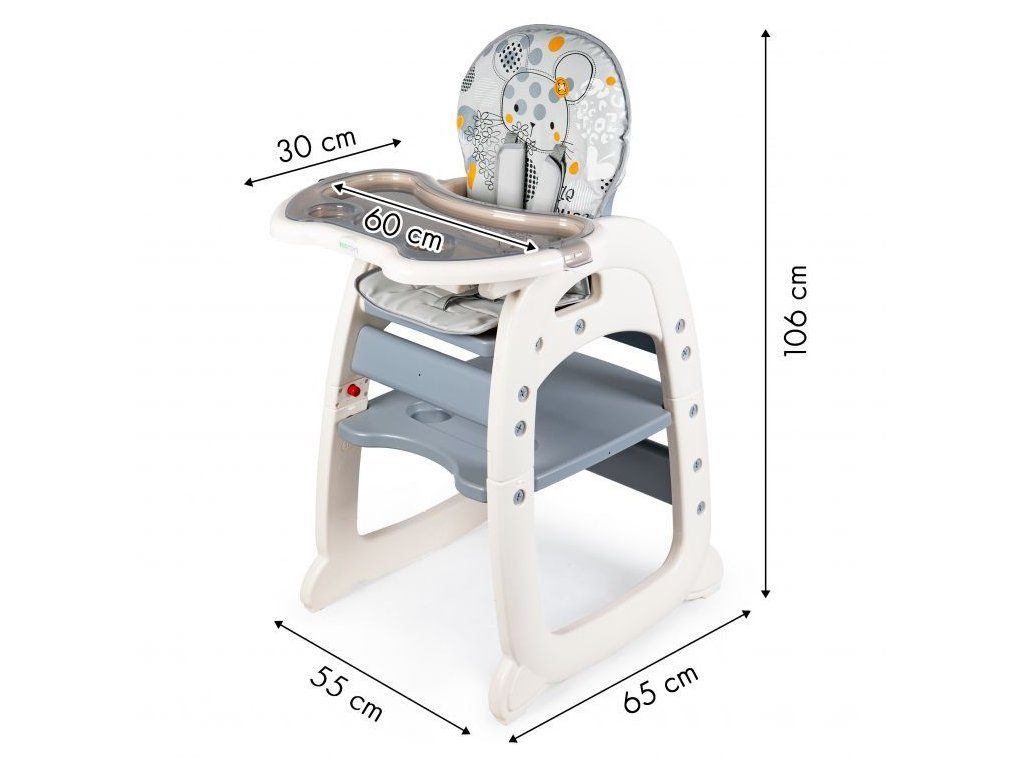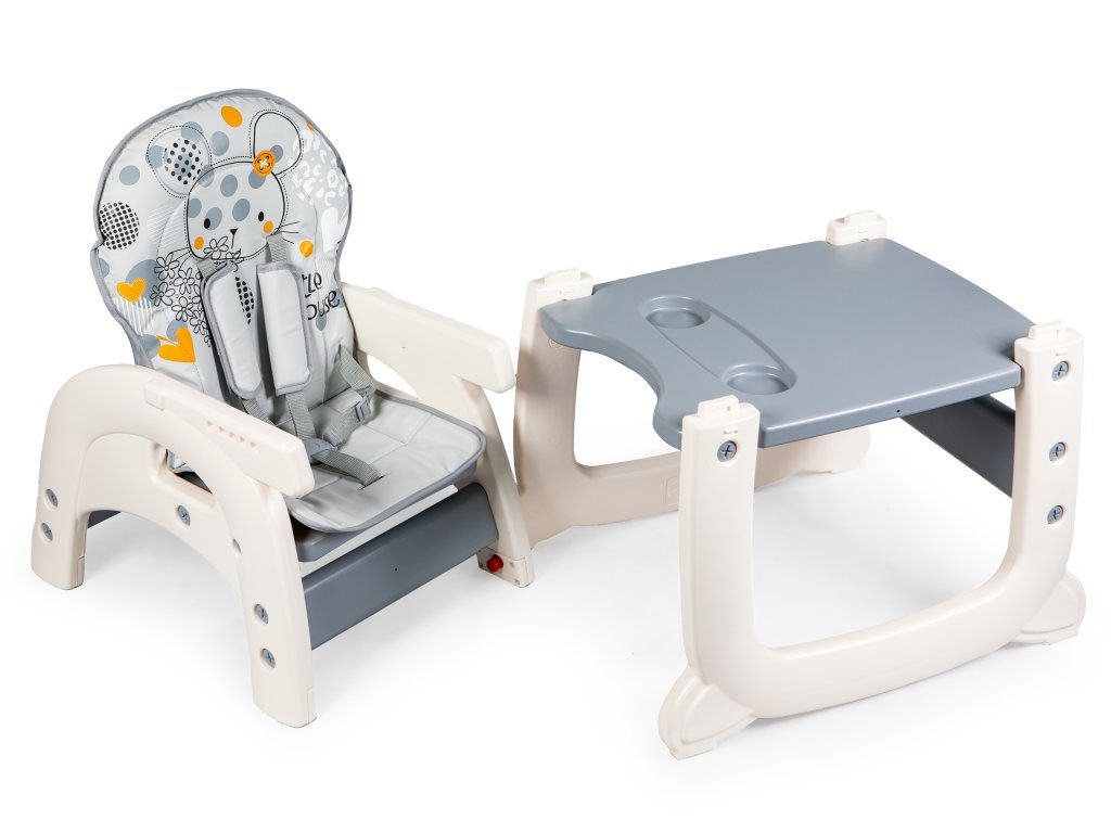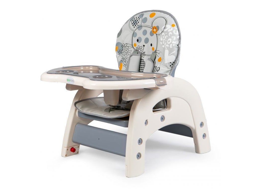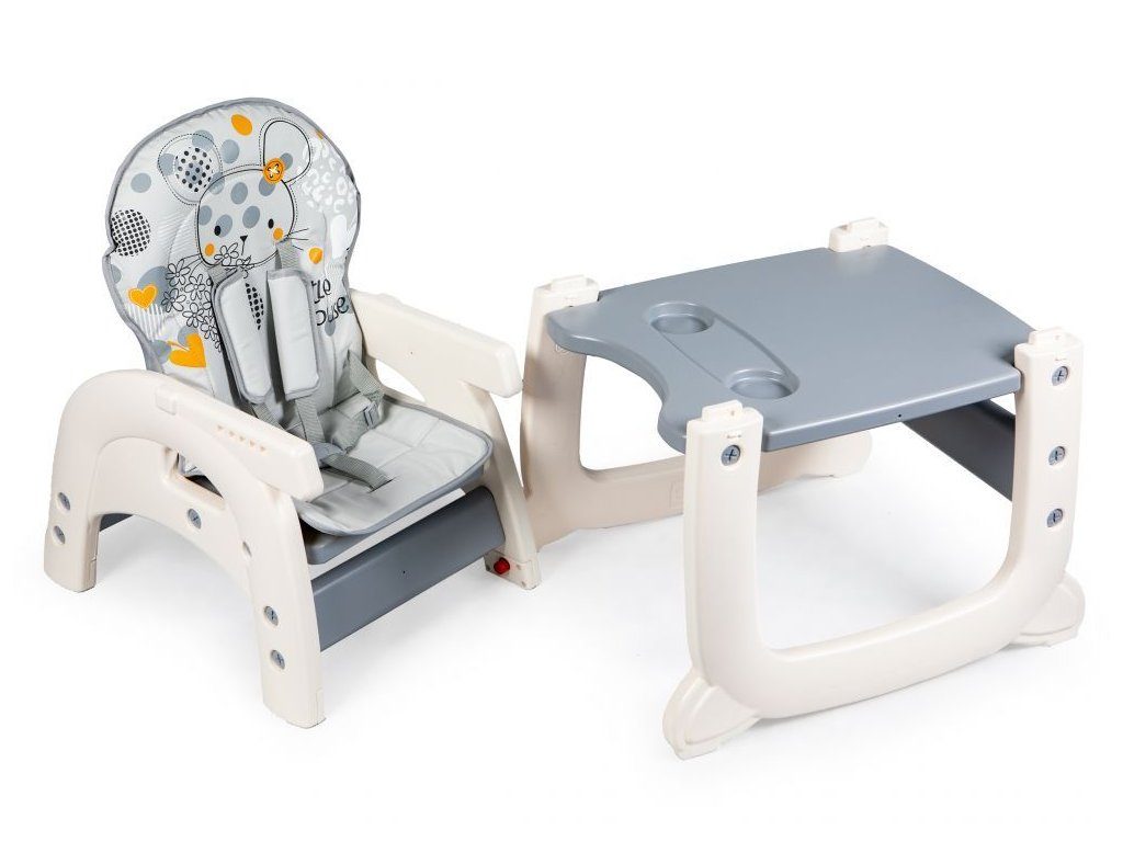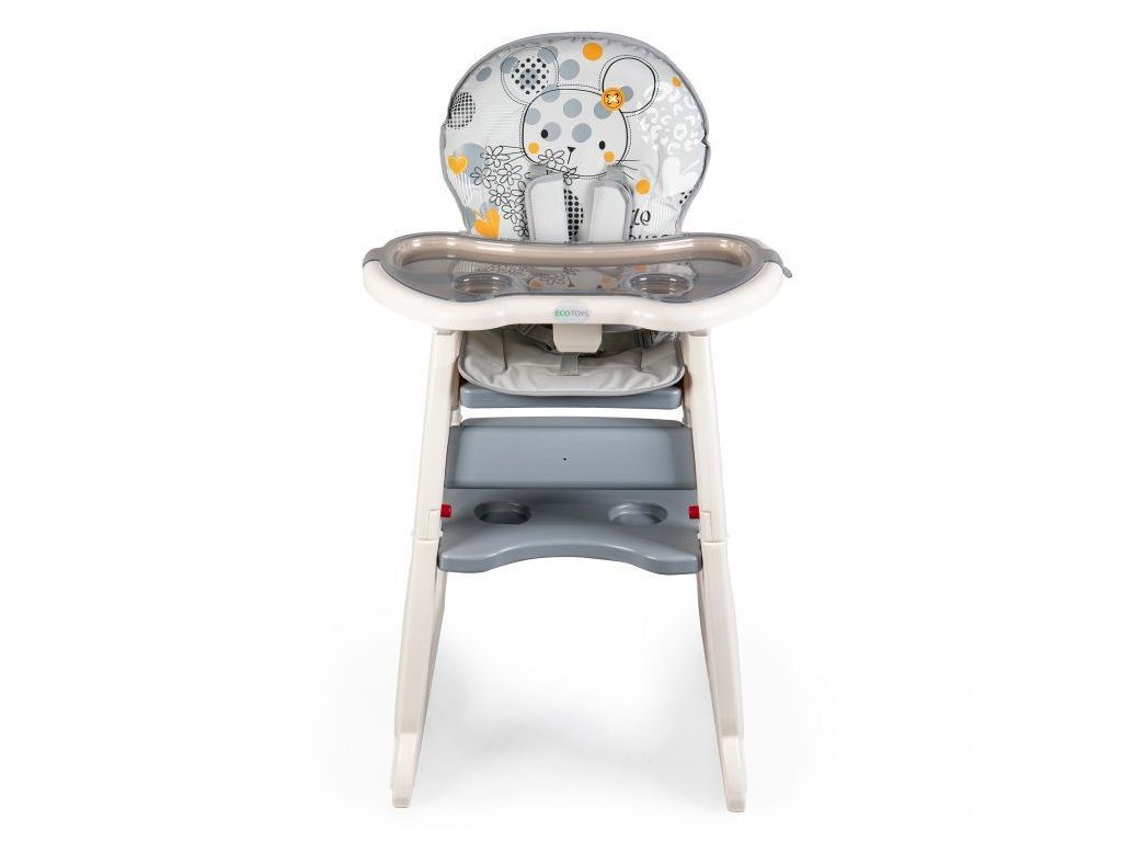 Multifunkční jídelní židlička Ecotoys 2v1 Myška. Můžete ji využít jako vysokou jídelní židličku nebo ji rozložit na židličku a stoleček. Nohy jsou opatřeny protiskluzovou vrstvou. Opěradlo lze nastavit ve třech polohách. Jídelní tác je dvojitý, odnímatelný a lze ho mýt v myčce. Praktický barevný potah s obrázkem myšičky lze prát v pračce. Na ochranu dítěte před vypadnutím je židlička vybavena 5 bodovými bezpečnostními pásy.