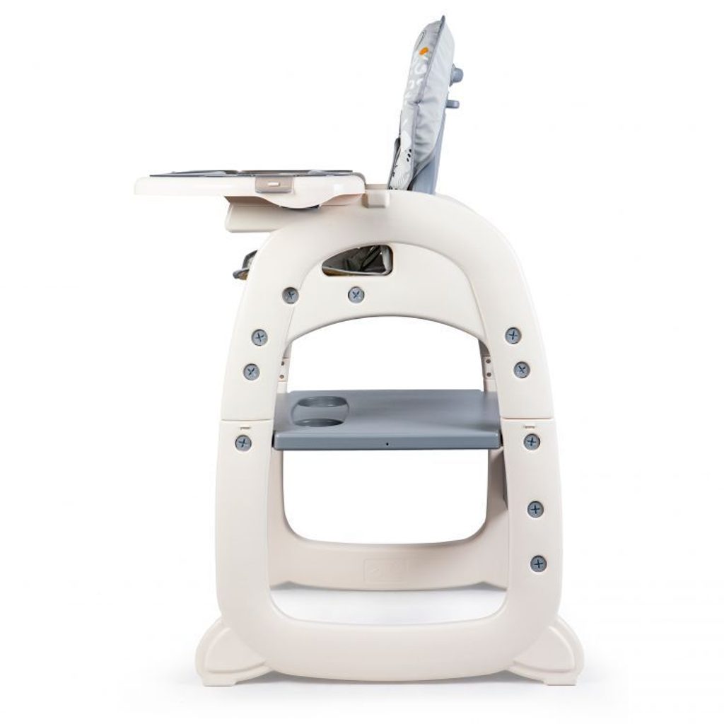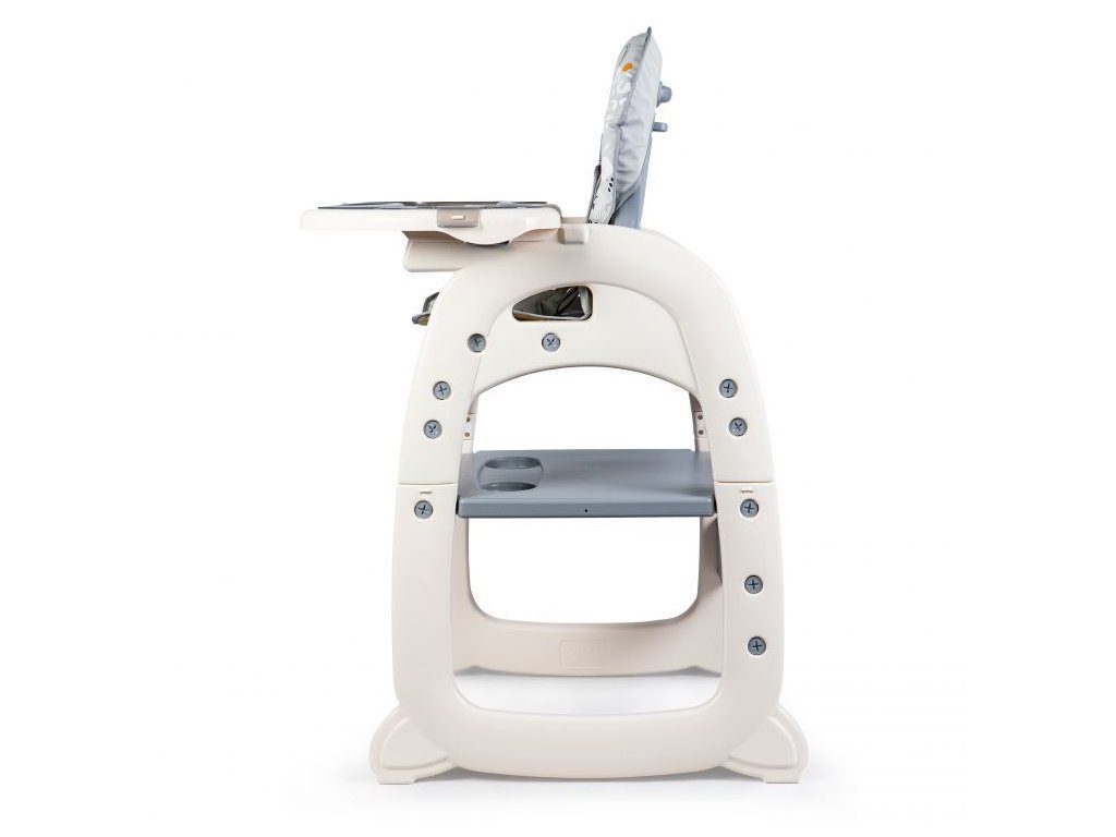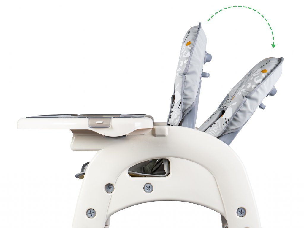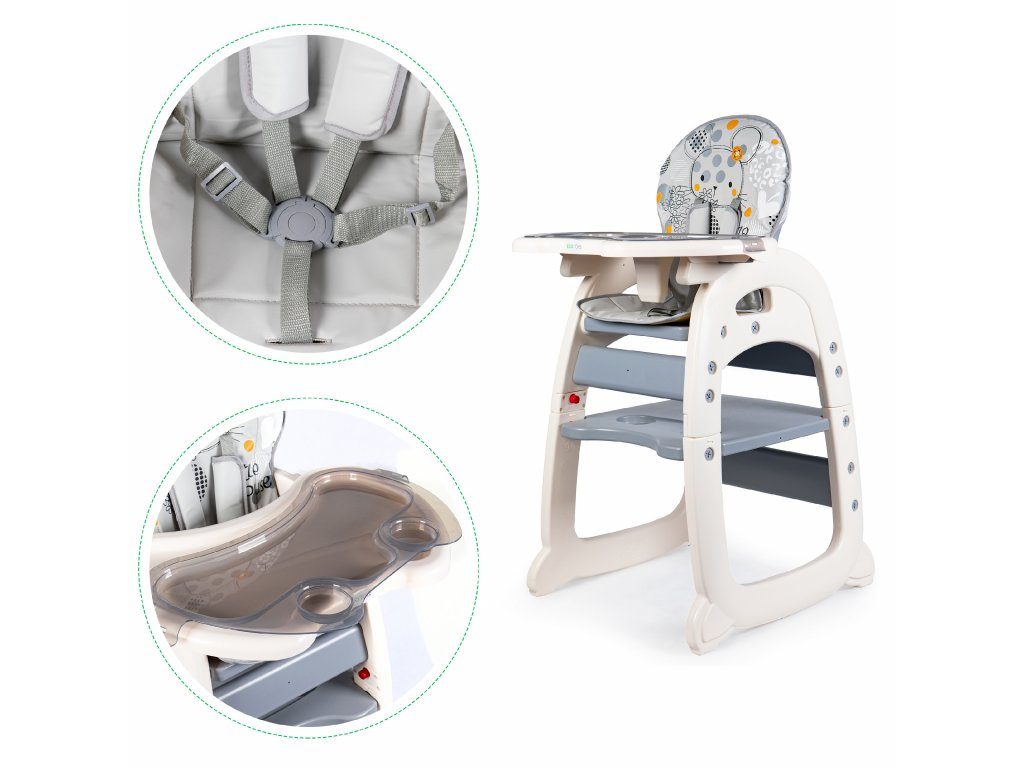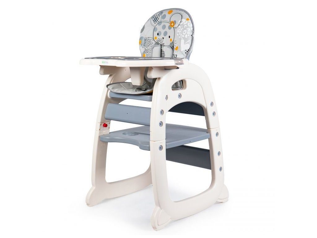 Multifunkční jídelní židlička Ecotoys 2v1 Myška. Můžete ji využít jako vysokou jídelní židličku nebo ji rozložit na židličku a stoleček. Nohy jsou opatřeny protiskluzovou vrstvou. Opěradlo lze nastavit ve třech polohách. Jídelní tác je dvojitý, odnímatelný a lze ho mýt v myčce. Praktický barevný potah s obrázkem myšičky lze prát v pračce. Na ochranu dítěte před vypadnutím je židlička vybavena 5 bodovými bezpečnostními pásy.