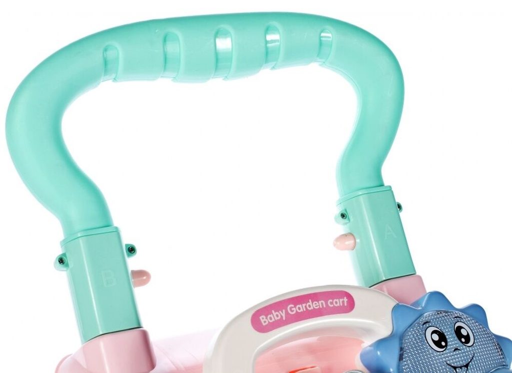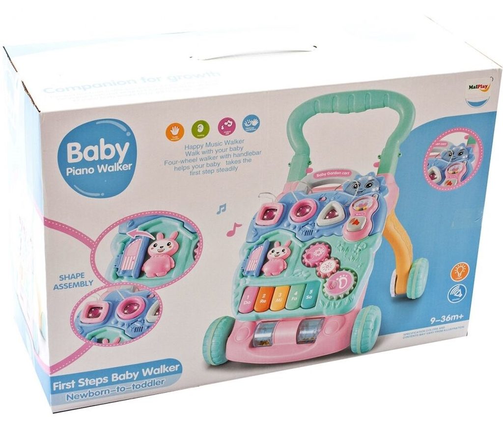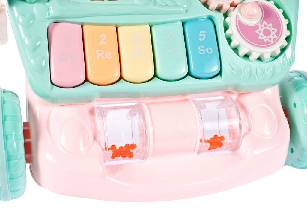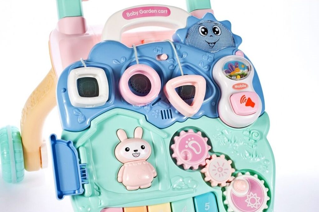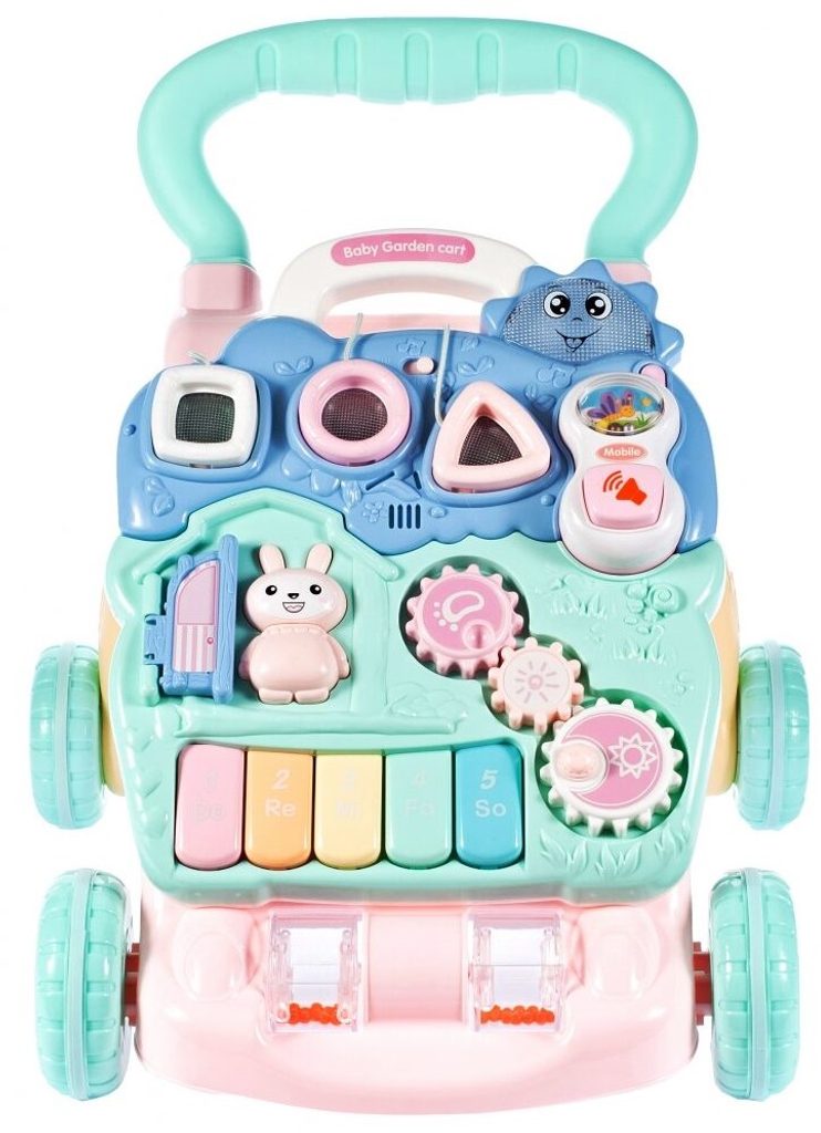 Dětské multifunkční chodítko Bunny stroller 2v1 pro ty nejmenší děti, edukační centrum. Lze ho využít jako samostatné chodítko nebo jako multifunkční panel s několika funkcemi. Najdete zde svítící geometrické tvary a sluníčko, odnímatelný chastící telefon sloužící zároveň jako chrastíko, ozubená kolečka, klavír, otevírací dvířka a králíčka s uvítací melodií. Kolečka mají protiskluzovou úpravu a brzdu. Pro větší stabilitu je chodítko vybaveno nádržkou do které se vlévá voda. Určeno pro děti od 9 měsíců věku a je ideální hračkou pro nauku prvních krůčků.