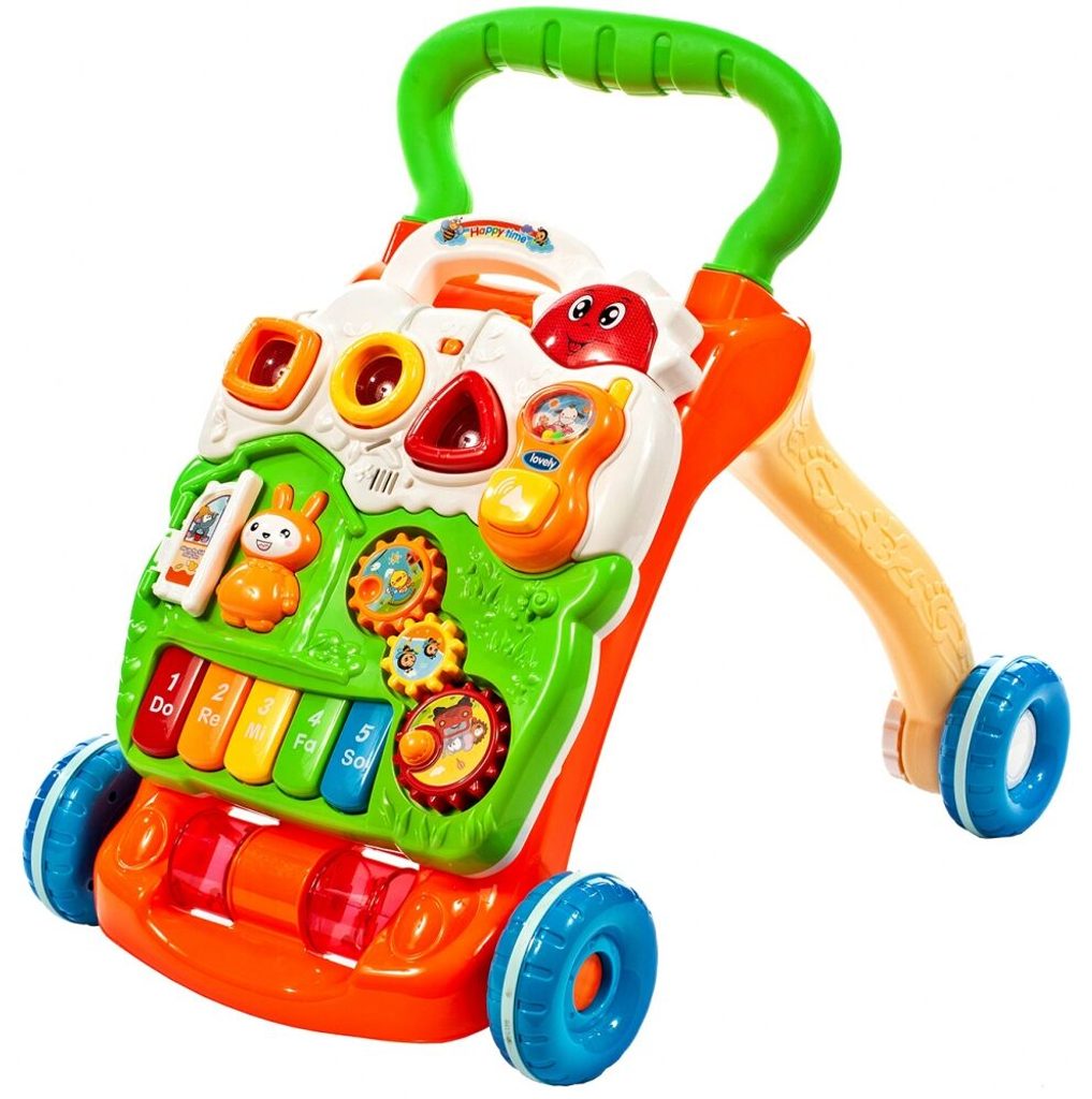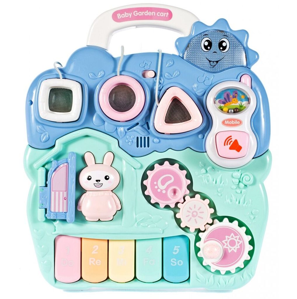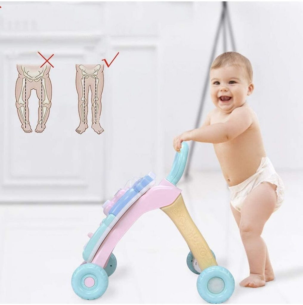 Dětské multifunkční chodítko Bunny stroller 2v1 pro ty nejmenší děti, edukační centrum. Lze ho využít jako samostatné chodítko nebo jako multifunkční panel s několika funkcemi. Najdete zde svítící geometrické tvary a sluníčko, odnímatelný chastící telefon sloužící zároveň jako chrastíko, ozubená kolečka, klavír, otevírací dvířka a králíčka s uvítací melodií. Kolečka mají protiskluzovou úpravu a brzdu. Pro větší stabilitu je chodítko vybaveno nádržkou do které se vlévá voda. Určeno pro děti od 9 měsíců věku a je ideální hračkou pro nauku prvních krůčků.