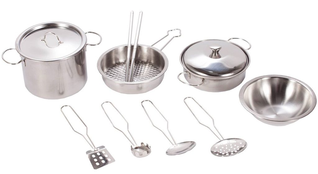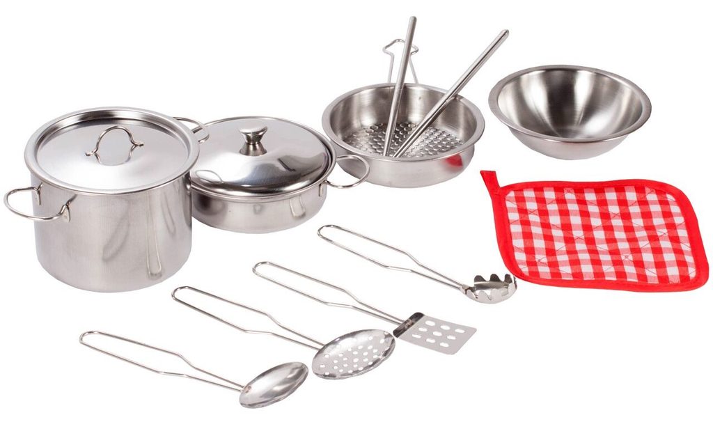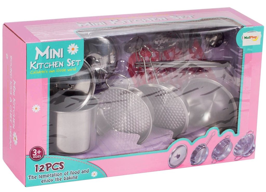 Sada kovového nádobí Mini Kitchen Set do dětské kuchyňky imituje skutečné nádobí. Skládá se celkem z 12 součástí a nesmí chybět v žádné dětské kuchyňce nebo si s ní lze hrát samostatně. Najdete zde 2 hrnce s odpovídajícími poklicemi, pánev, 2 obracečky, 2 naběračky a také kuchyňskou chňapku. Tato hračka je určena pro děti od 3 let věku.