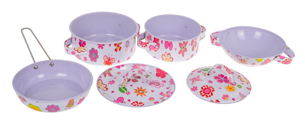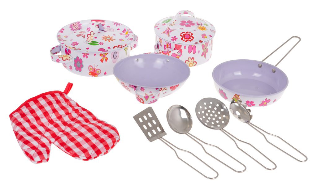 Sada kovového nádobí Flower Kitchenware do dětské kuchyňky imituje skutečné nádobí. Skládá se celkem z 11 součástí a nesmí chybět v žádné dětské kuchyňce nebo si s ní lze hrát samostatně. Najdete zde 2 hrnce s odpovídajícími poklicemi, pánev, misku, 2 obracečky, 2 naběračky a také kuchyňskou rukavici. Tato hračka je určena pro děti od 3 let věku.