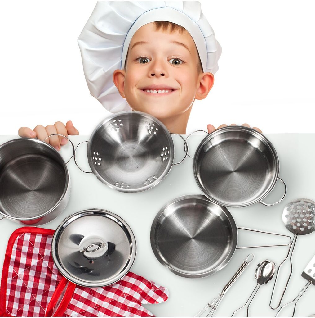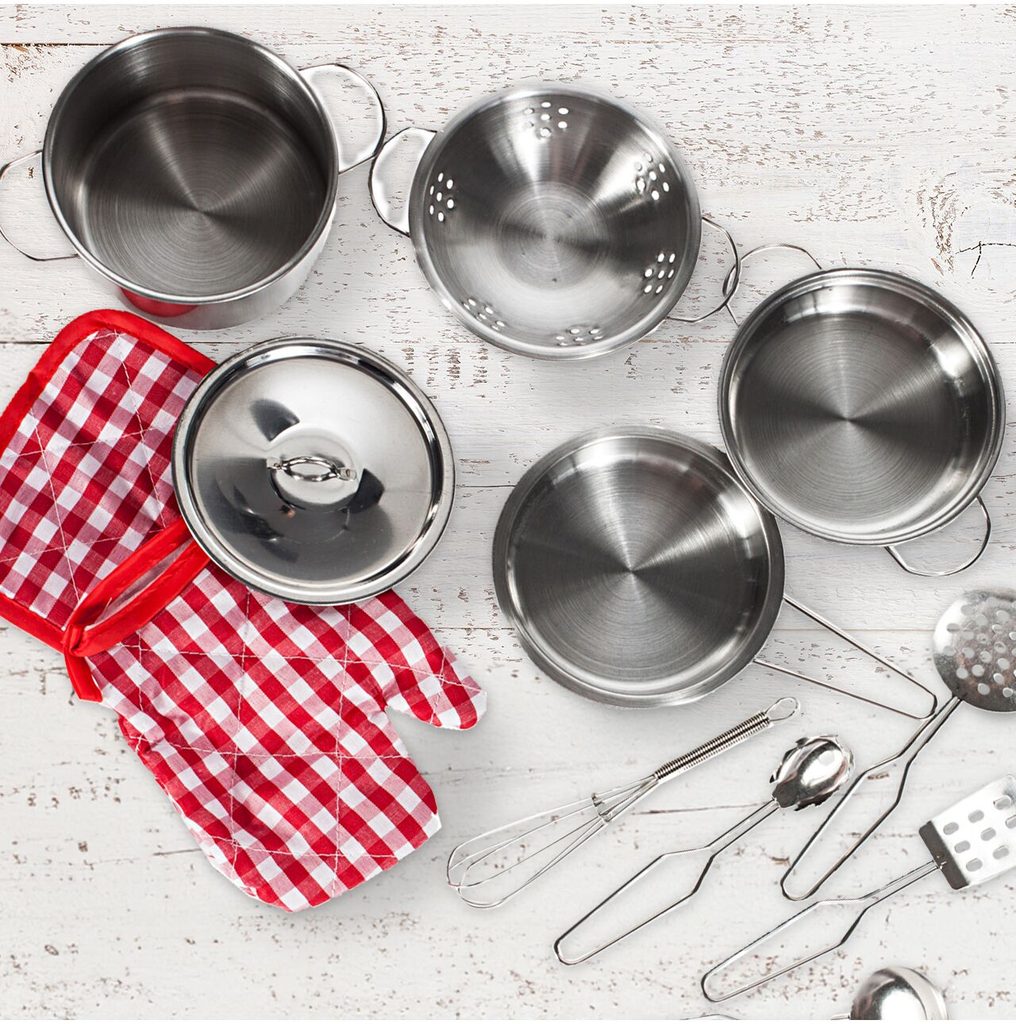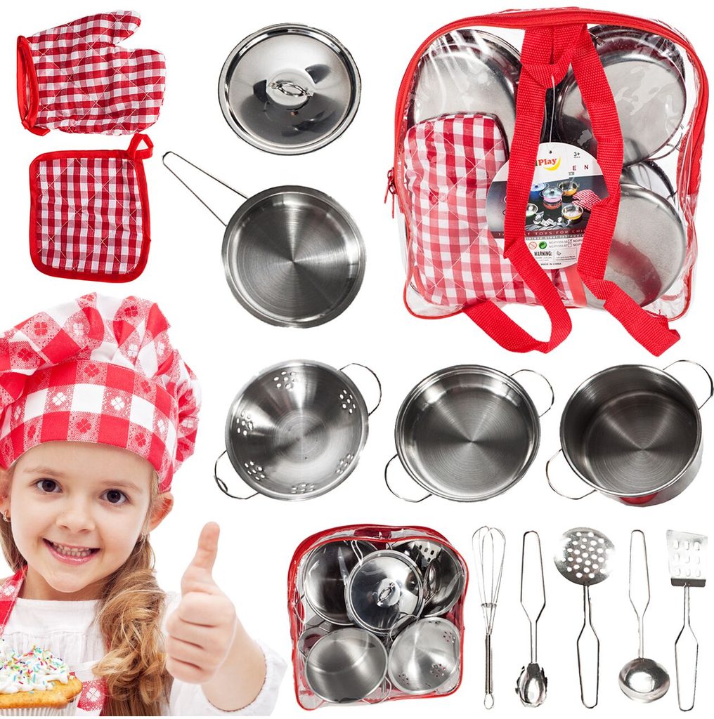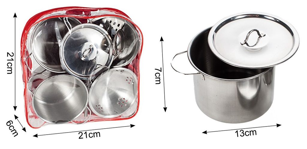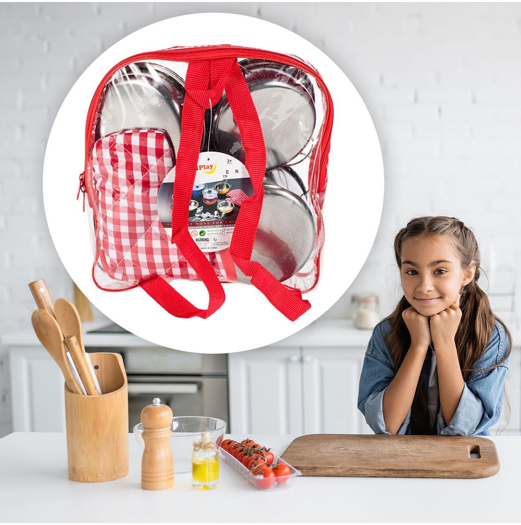 Sada kovového nádobí Kitchen Backpack do dětské kuchyňky imituje skutečné nádobí. Skládá se celkem z 12 součástí a nesmí chybět v žádné dětské kuchyňce nebo si s ní lze hrát samostatně. Najdete zde hrnce, pokličku, pánev, cedník, kuchyňské nářadí a dokonce 2 chňapky. Vše je uloženo v praktickém průhledném batohu. Tato hračka je určena pro děti od 3 let věku.