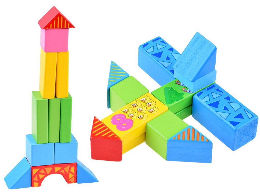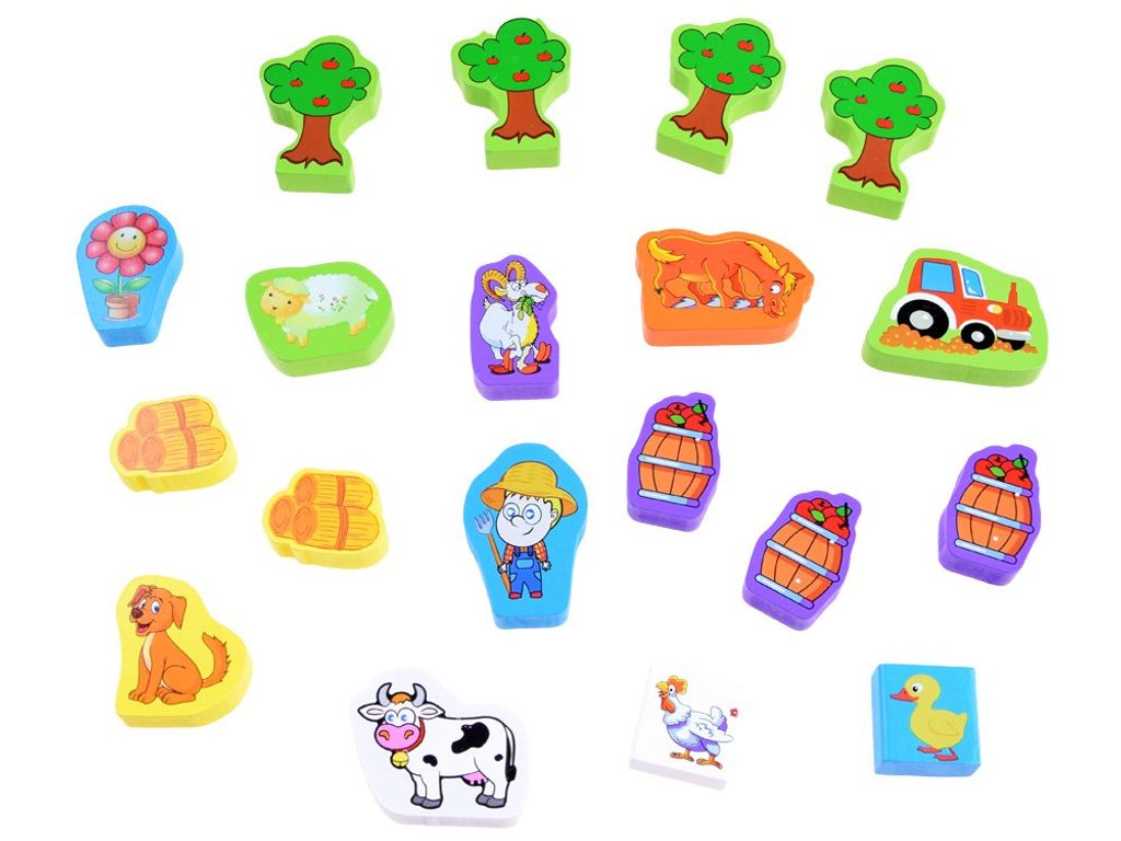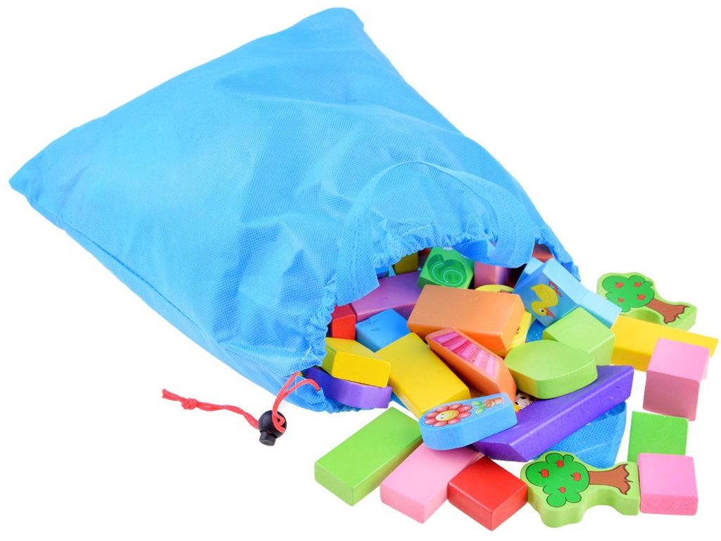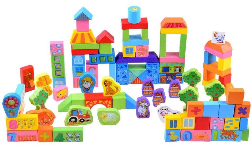 Sada 100 kusů barevných dřevěných kostek Farm Animal Blocks v kyblíku s praktickým prohazovacím otvorem v horní části. Všechny kostky mají zaoblené hrany, jsou vyrobeny pouze ze dřeva, mají různé velikosti a tvary jako je válec, kostka, most, obdélník a jsou na nich vyobrazeny zvířátka postavičky a další. Hra s nimi podporuje u dětí představivost a motoriku. Součástí balení je látkový pytlík. Hračka je určena pro děti od 36 měsíců věku.