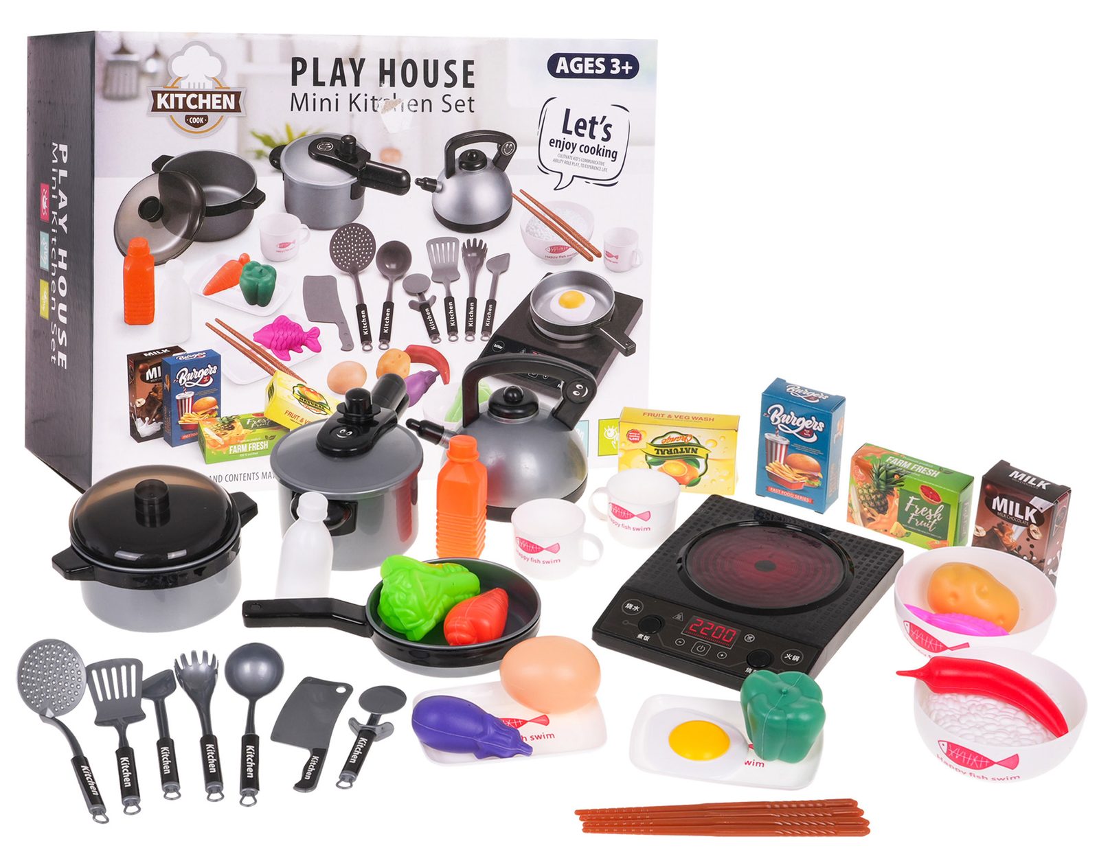 Sada nádobí Play house do dětské kuchyňky včetně vařiče imituje skutečné nádobí. Skládá se celkem z mnoha součástí a nesmí chybět v žádné dětské kuchyňce nebo si s ní lze hrát samostatně. Najdete zde indukční vařič na baterie se zvukem a světlem, hrnec, konvici, kuchyňské náčiní, krájecí prkénko, jídelní hůlky, misky, talířky, hrnečky, imitace potravin a další. Tato hračka je určena pro děti od 3 let věku.